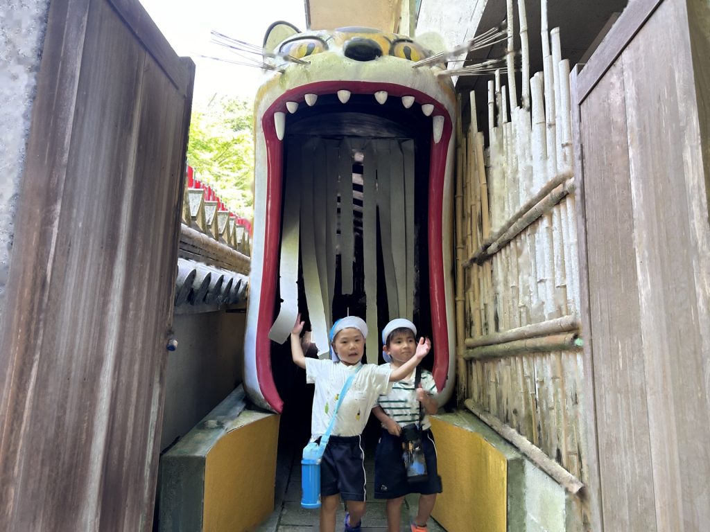 地内を見学参拝し、最後に2人ずつ胎内くぐりをしました。父虎と母虎がおしりをつきあわせた形になっていて、背中には小さな子虎がのっています。中を通り抜けると「三虎の福」が得られるそうです。