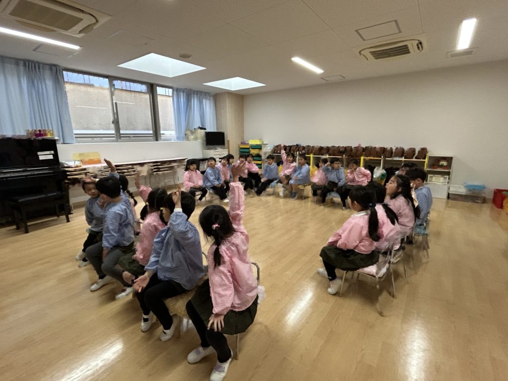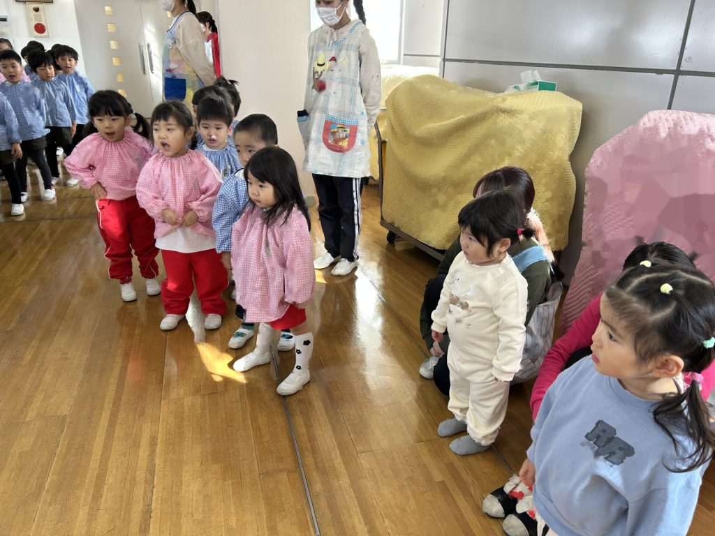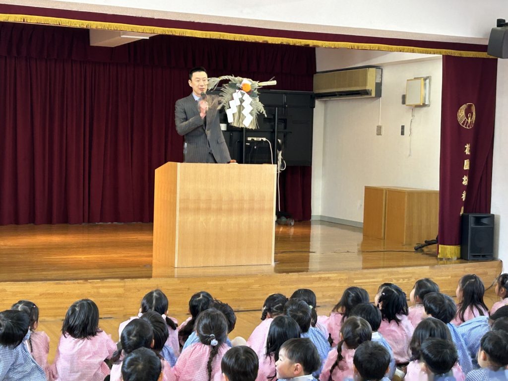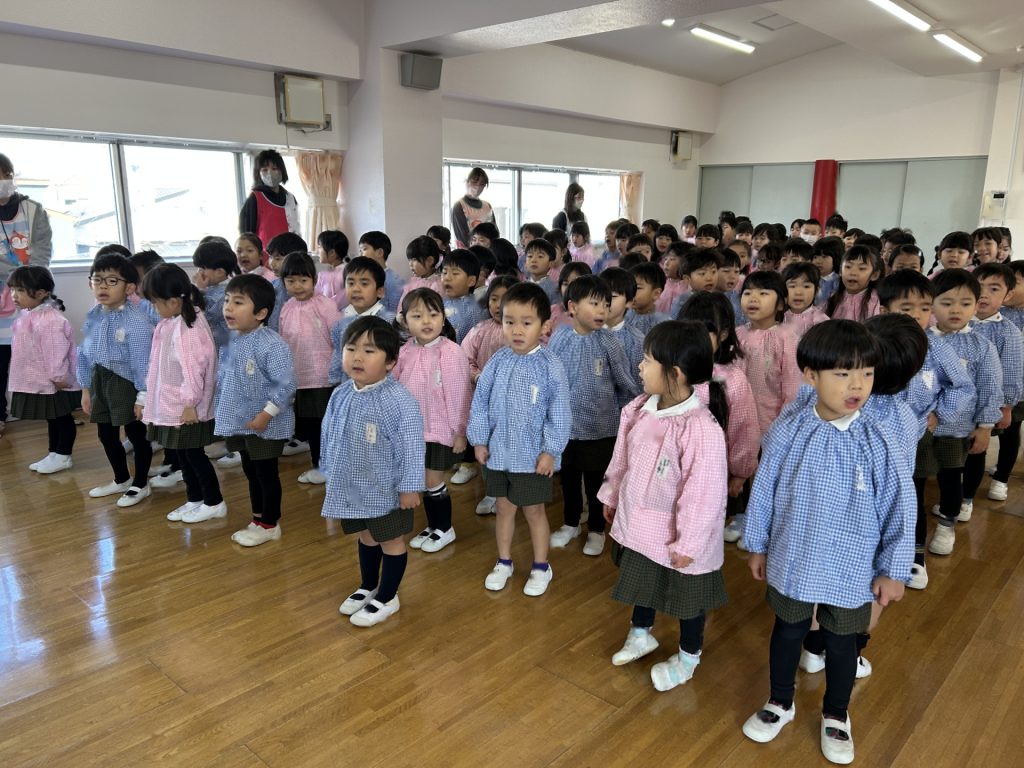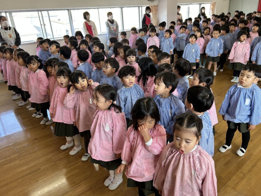 今日は始業式。3階ホールに集まり、園長の話を聞きました。
