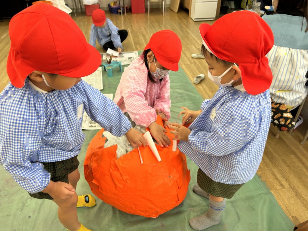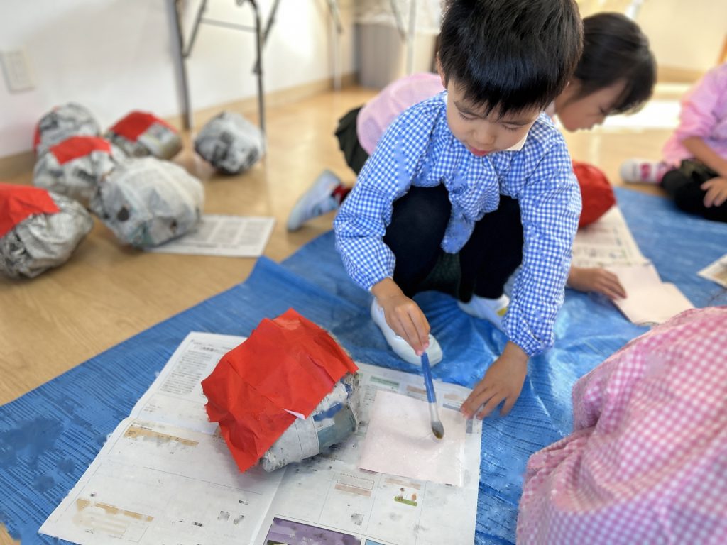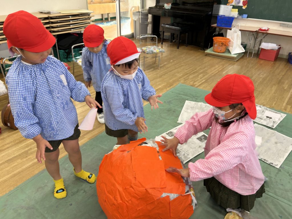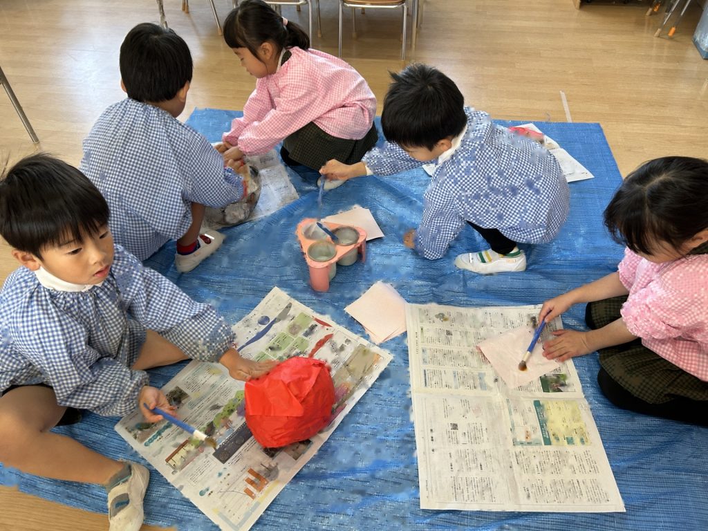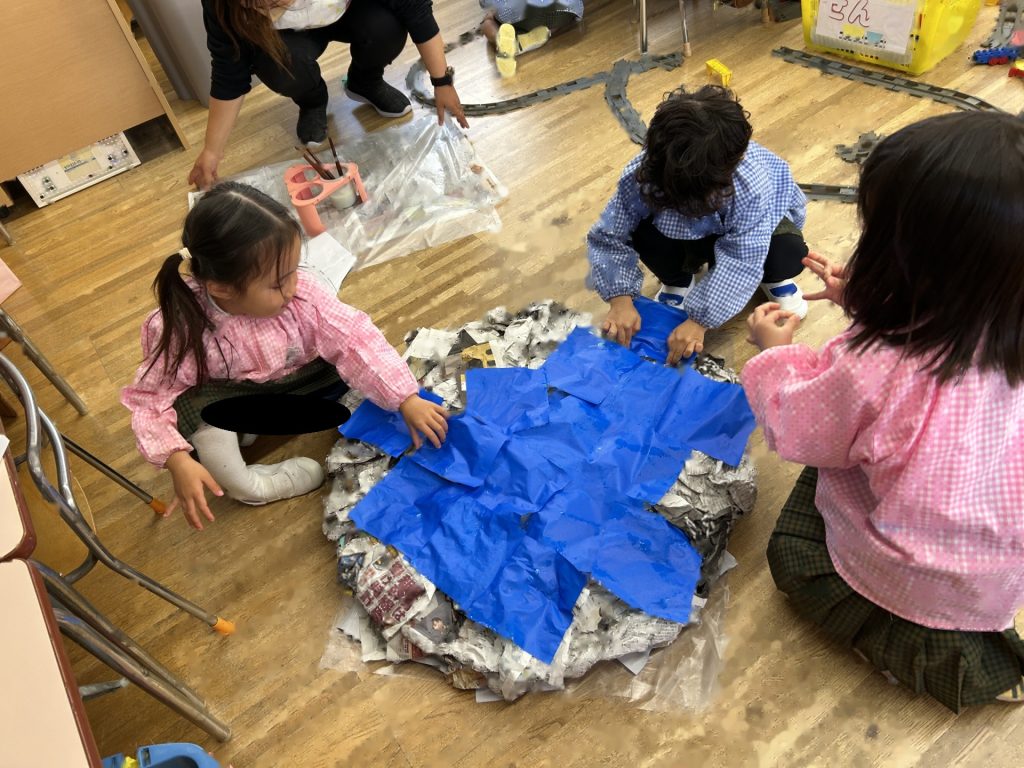 保育者が丸めた新聞紙に折り紙を貼っていきました。