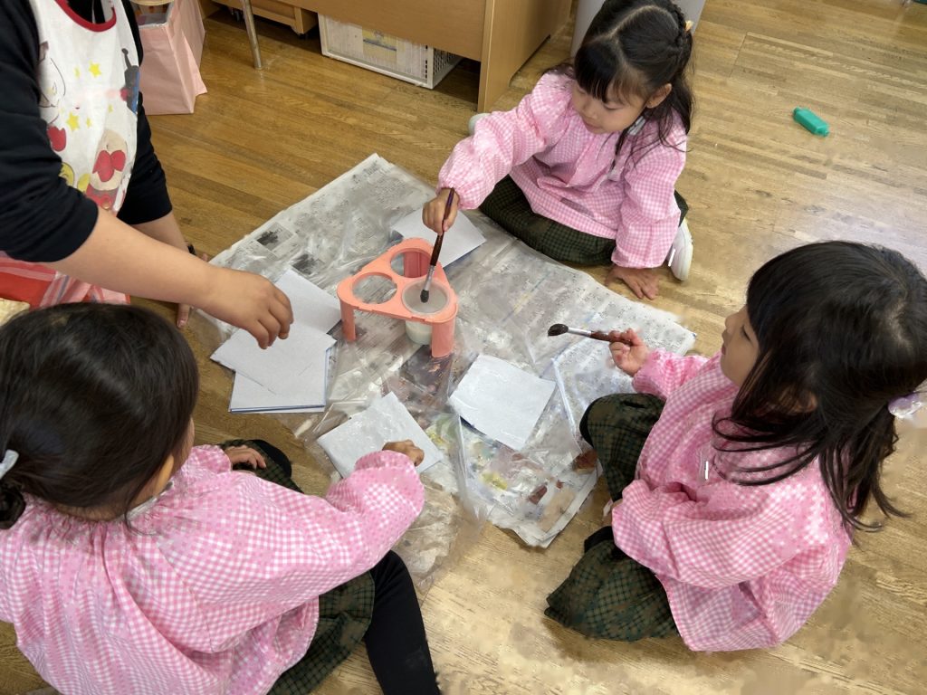 ちゅうりっぷぐみは吉本パビリオンのおおきな球体、すみれぐみはミャクミャクの顔部分、こすもすぐみはミャクミャクの細胞部分に折り紙でいろをつけていきました。