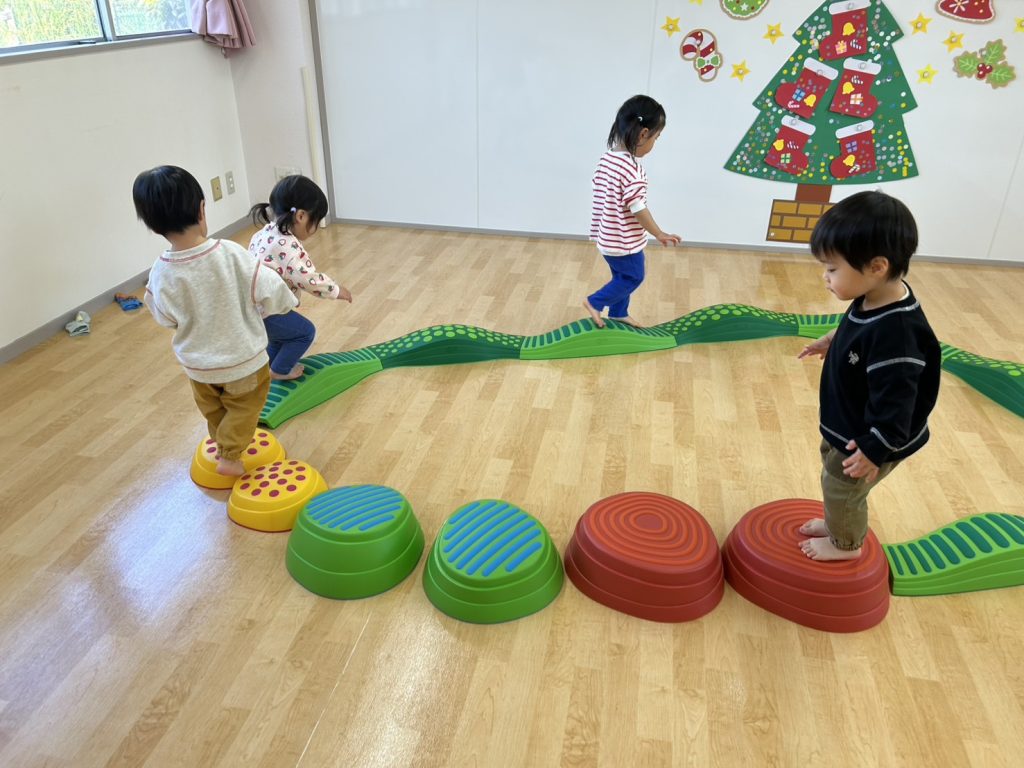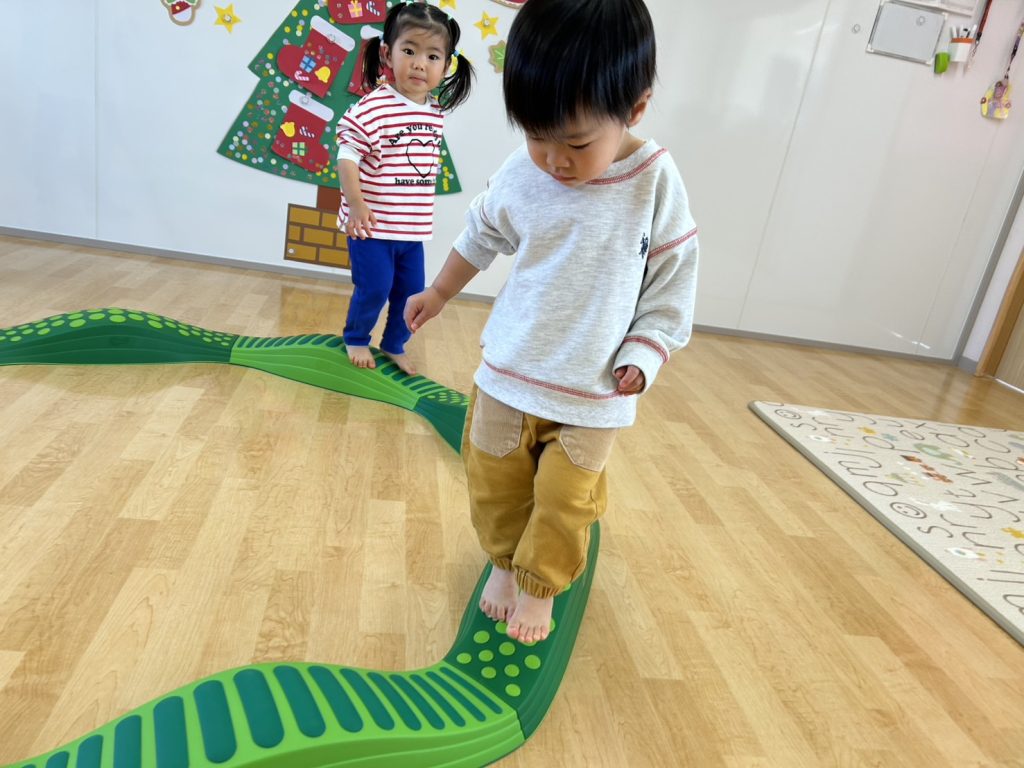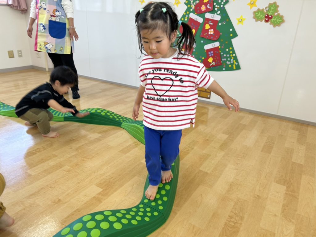 初めは保育者と手をつないで渡っていたおともだちも慣れてきて、バランスを取りながら1人で上手に渡れるようになってきました。