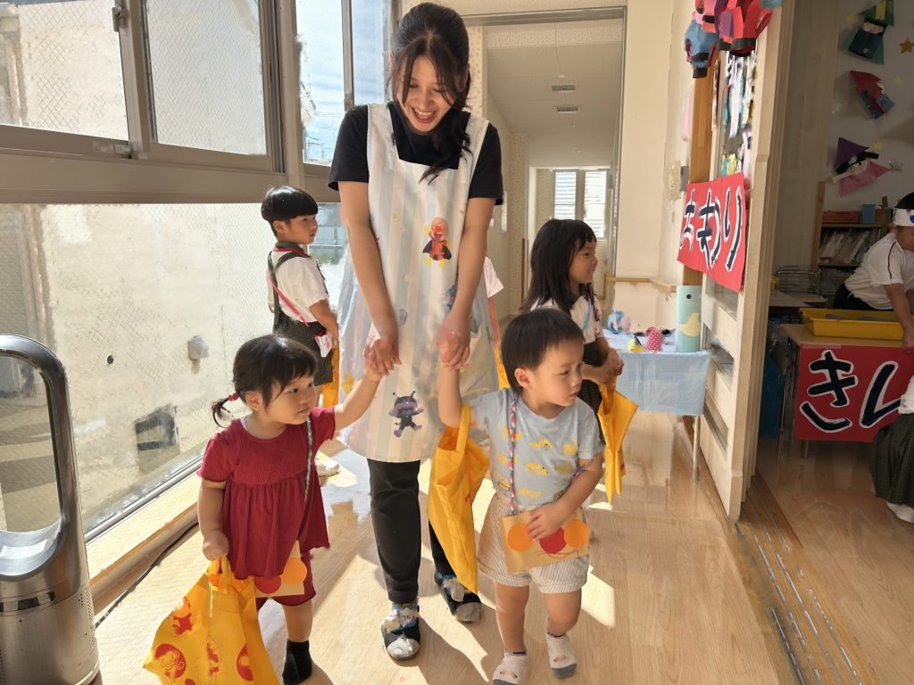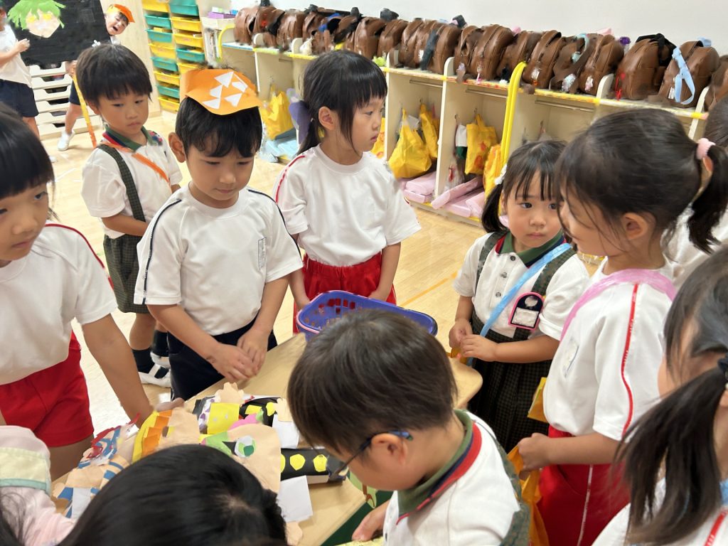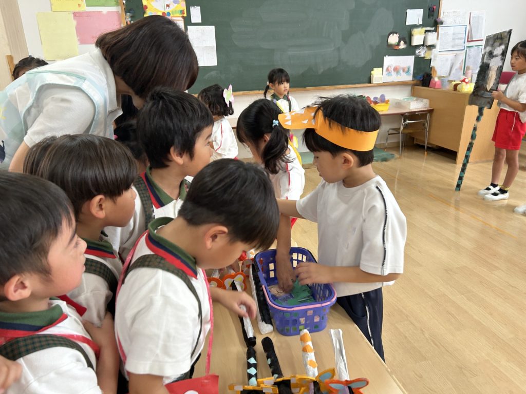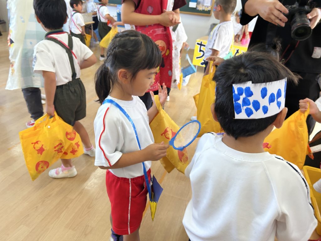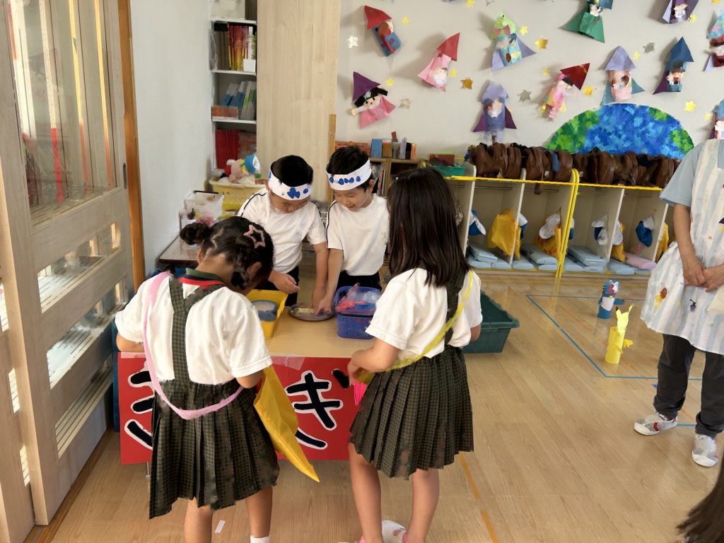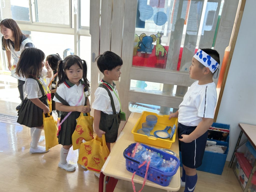 チョコバナナ・かき氷・焼きそば・ヨーヨーつり・輪投げ・きんぎょすくいと全部で6種類の屋台がありみんな自分の役割をしっかりはたしていました。さすが5歳児さん、とっても上手にお客さんをエスコートしていましたよ。