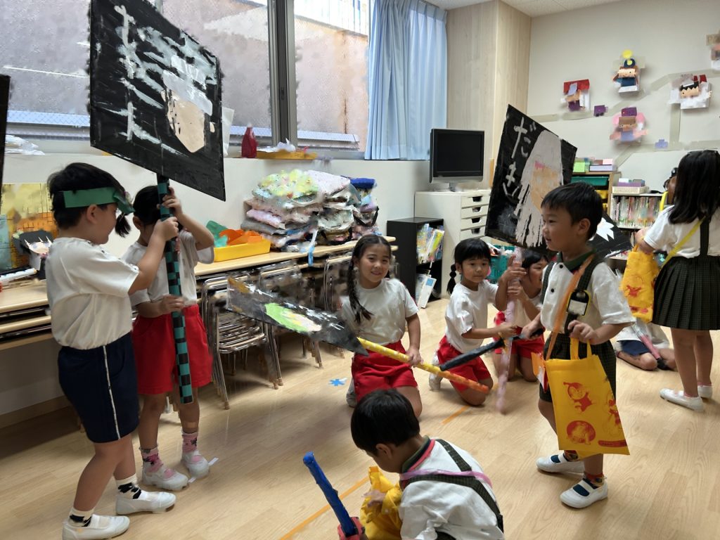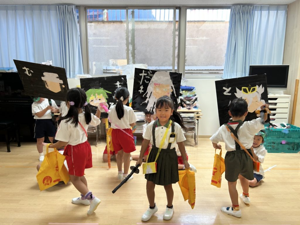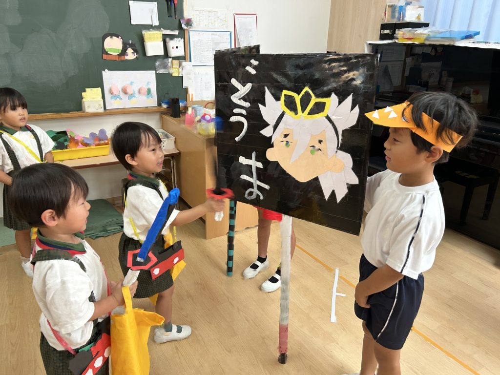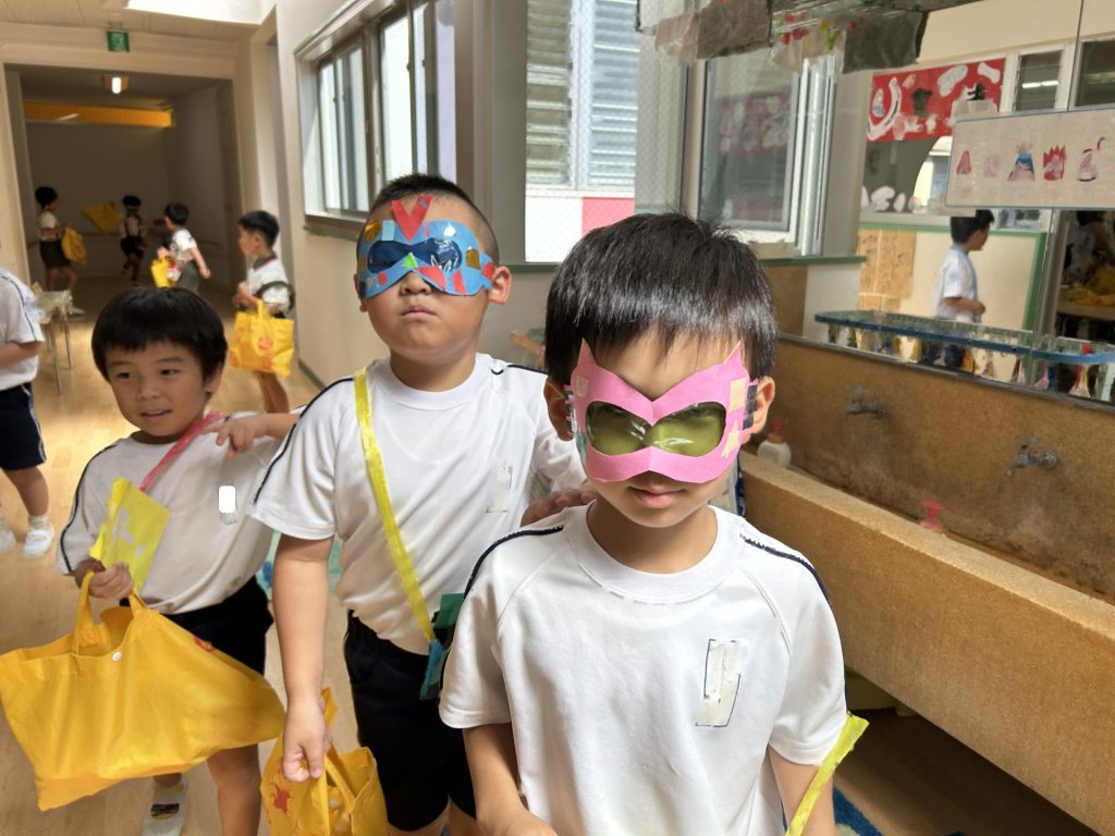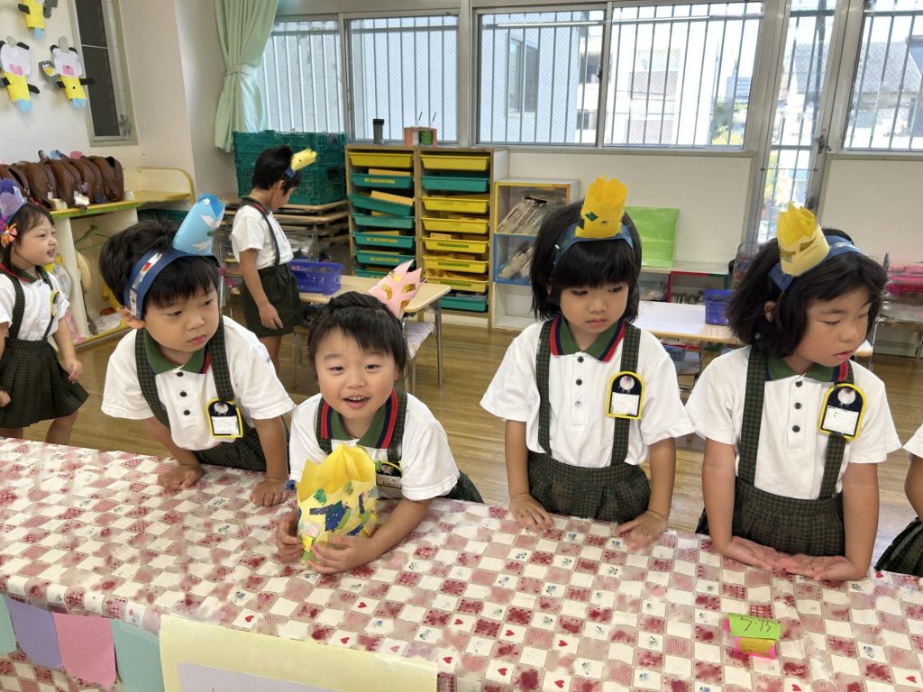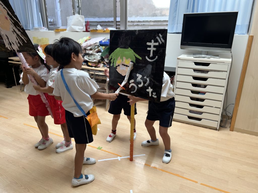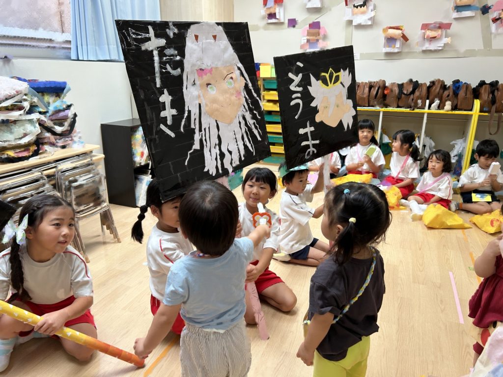 チョコバナナ・かき氷・焼きそば・ヨーヨーつり・輪投げ・きんぎょすくいと全部で6種類の屋台がありみんな自分の役割をしっかりはたしていました。さすが5歳児さん、とっても上手にお客さんをエスコートしていましたよ。