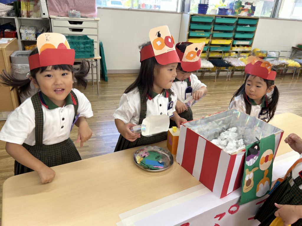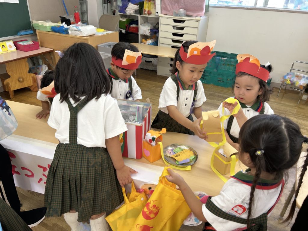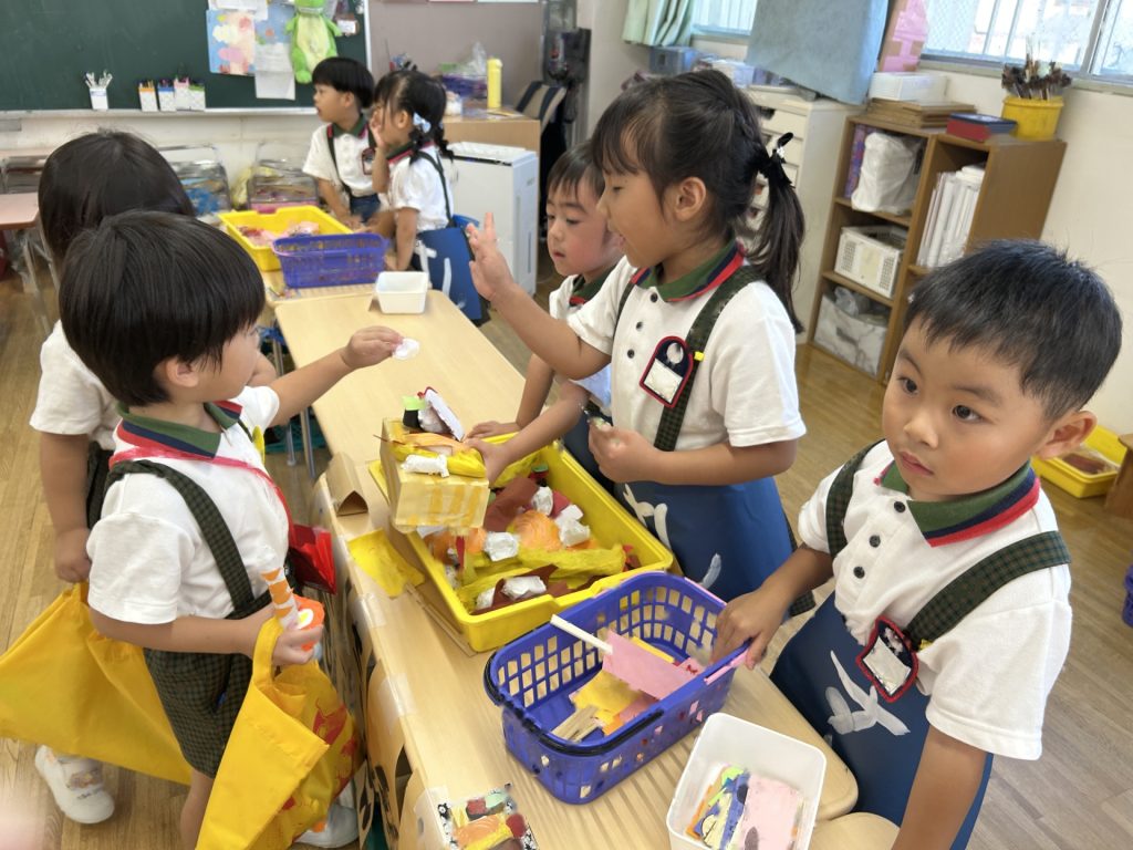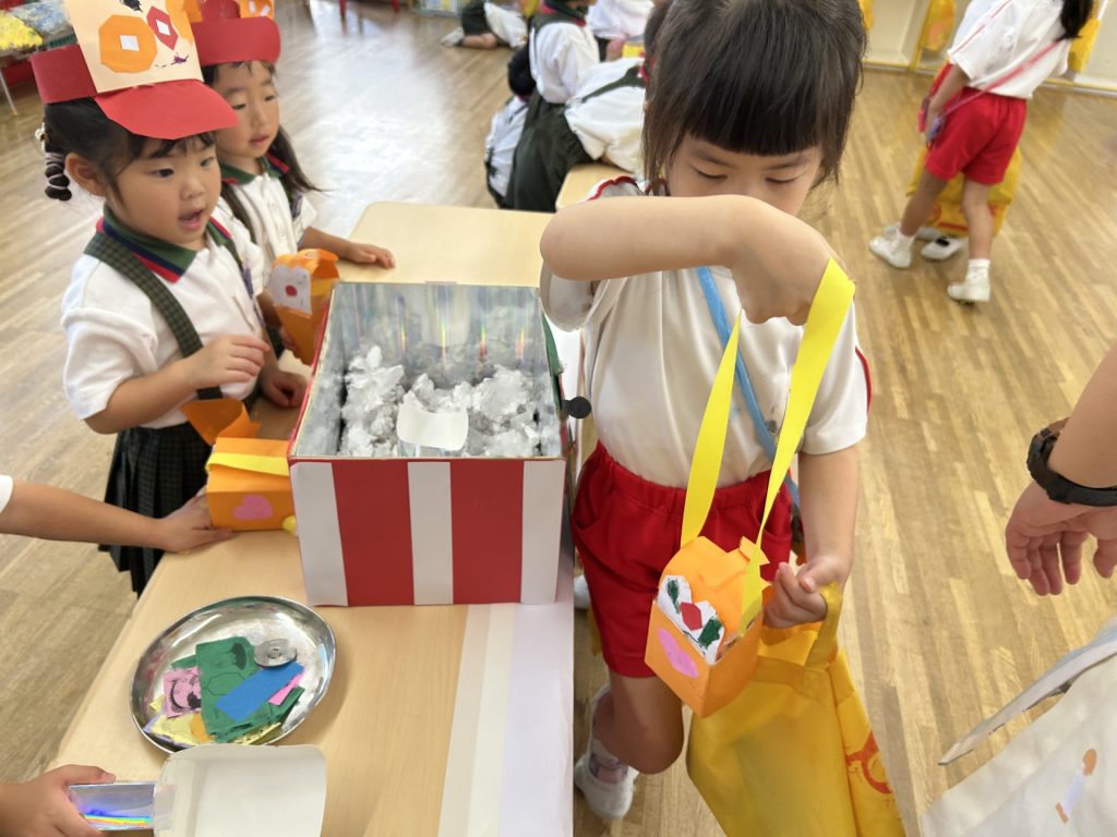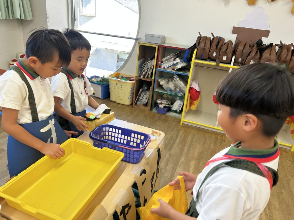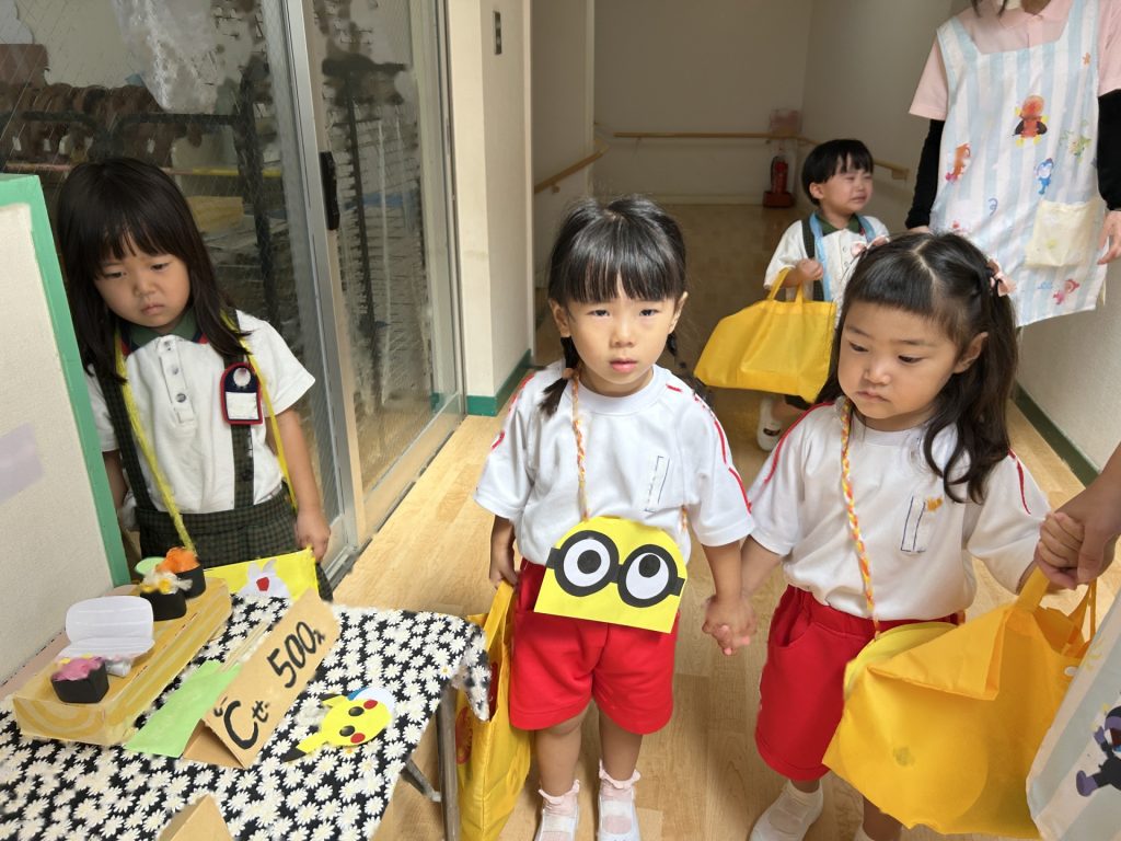 1人3個だよと話をしてから始めたのですが、7個買っているおともだちもいました(後で返却にいきました)😁みんなそれぞれおみせやさんごっこを楽しんでいましたよ。