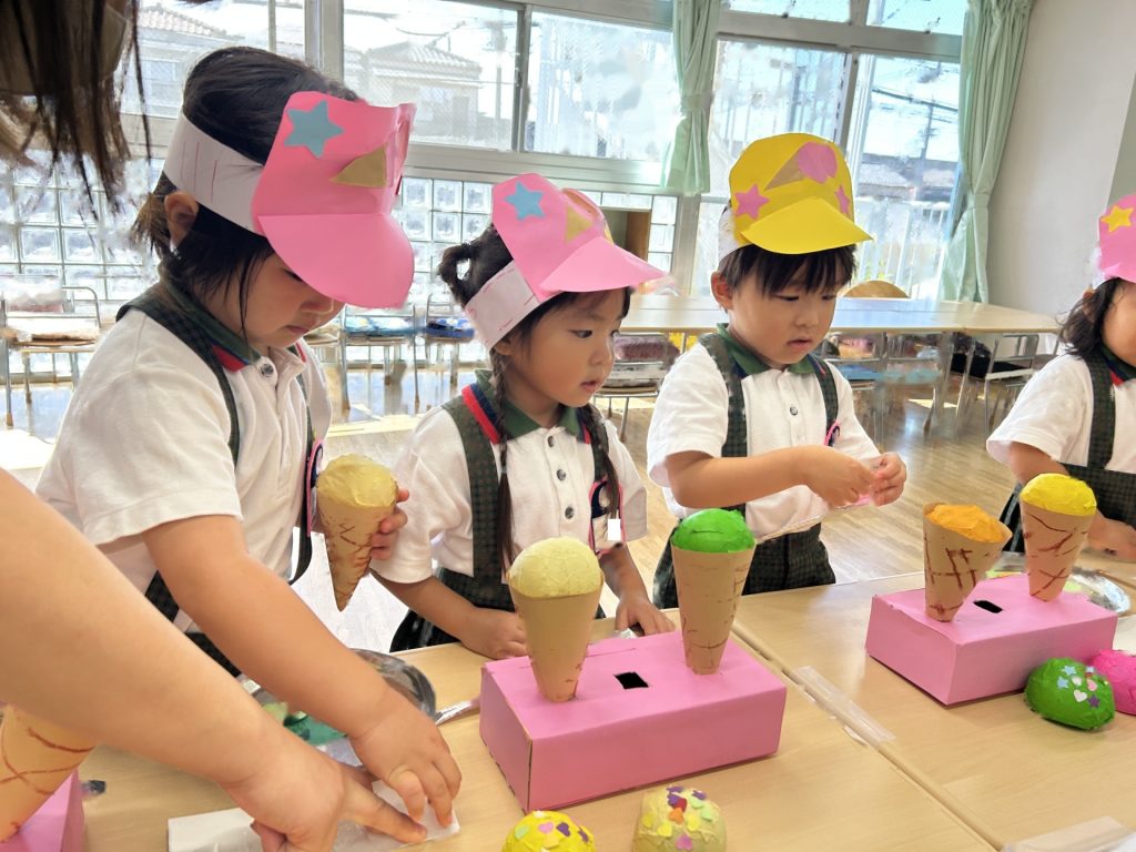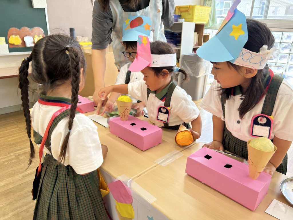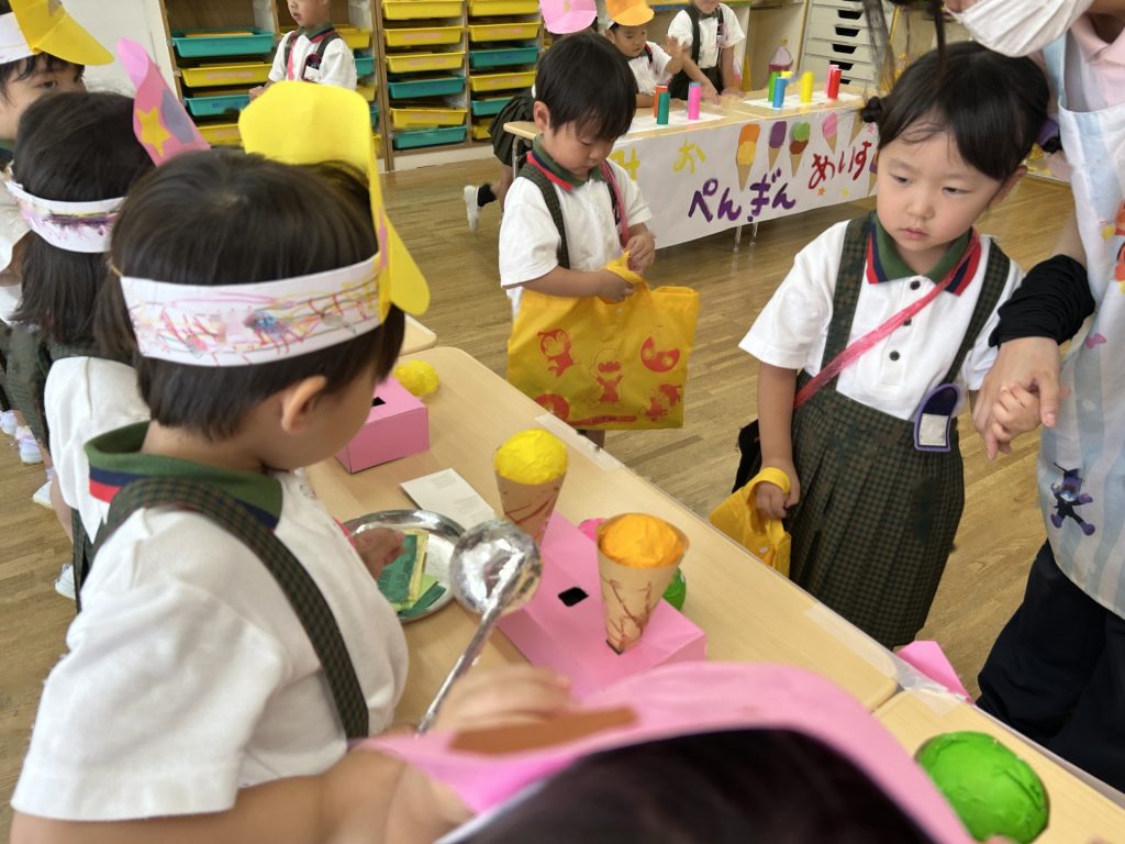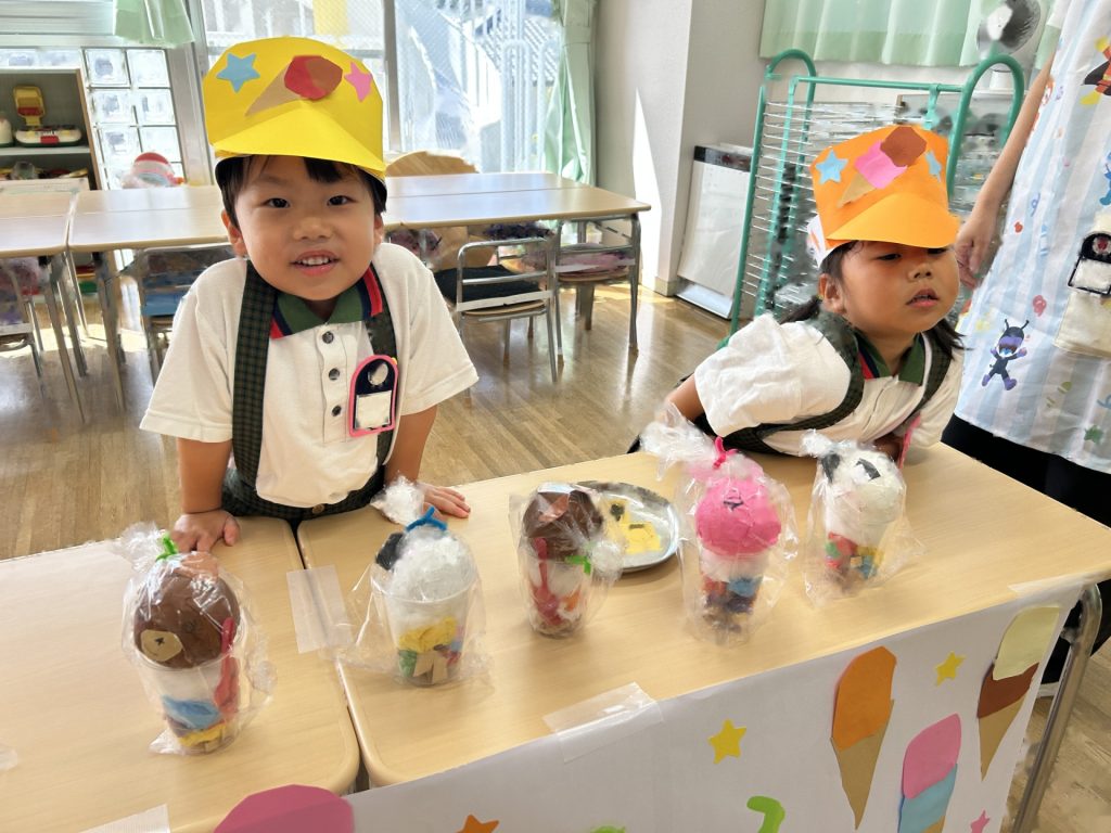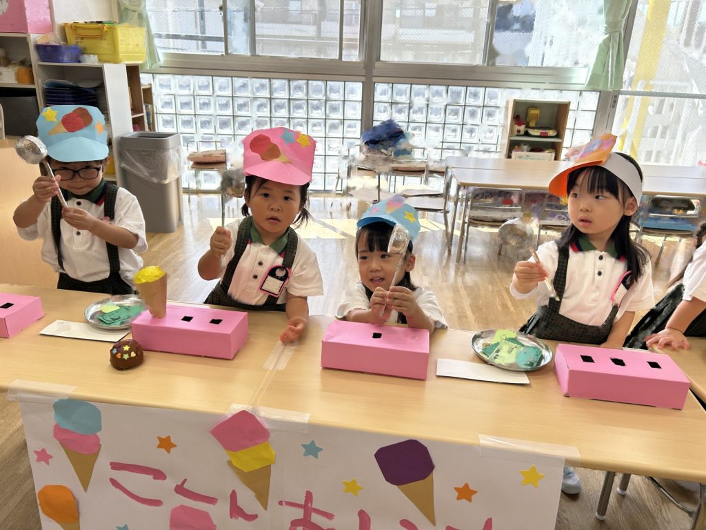 サンバイザーをかぶり「いらっしゃいませー」ととってもかわいかったおみせやさん。初めてのおみせやさんでしたがみんなとっても楽しそうに取り組んでいましたよ。キャラクターバーが人気のアイスクリーム屋さんでした😊