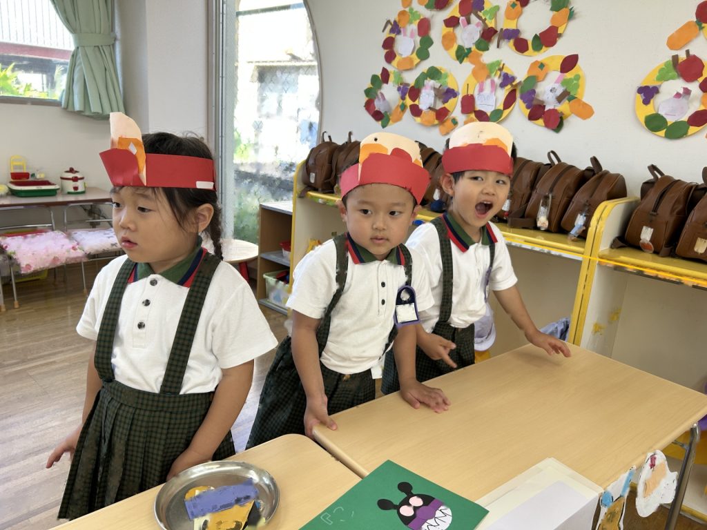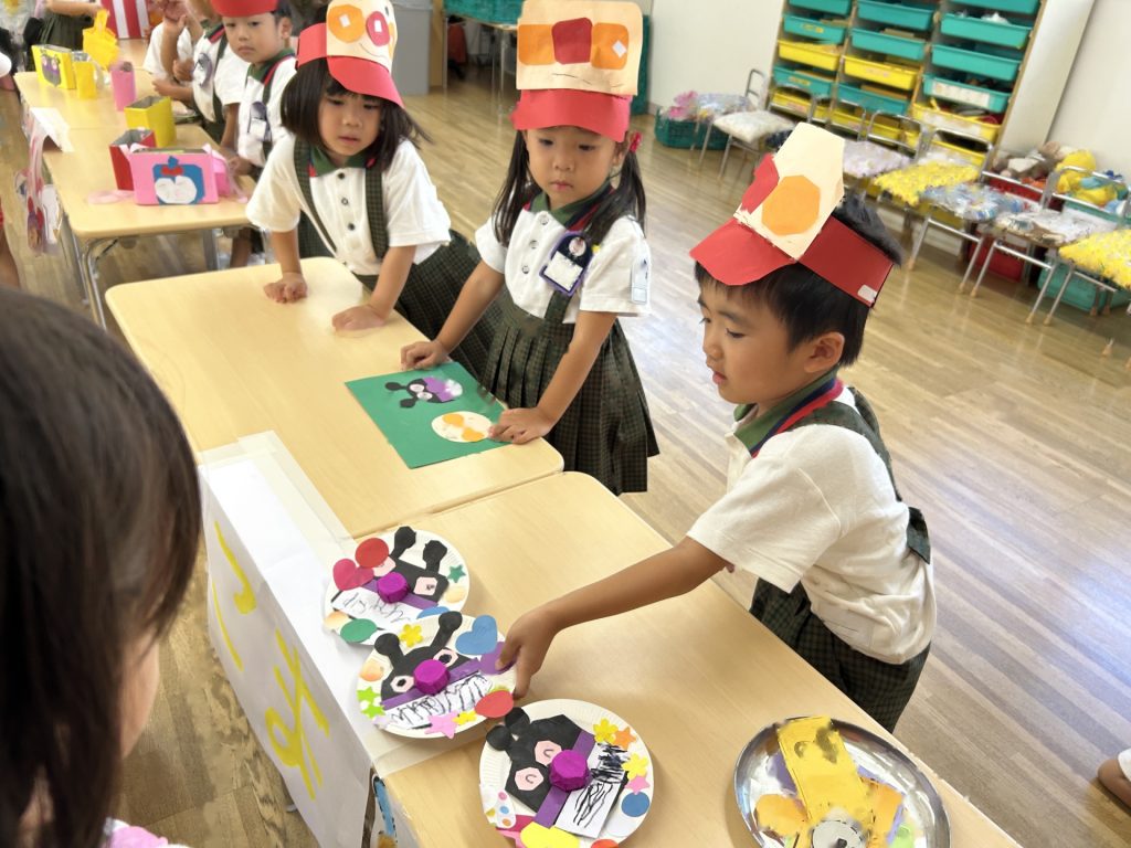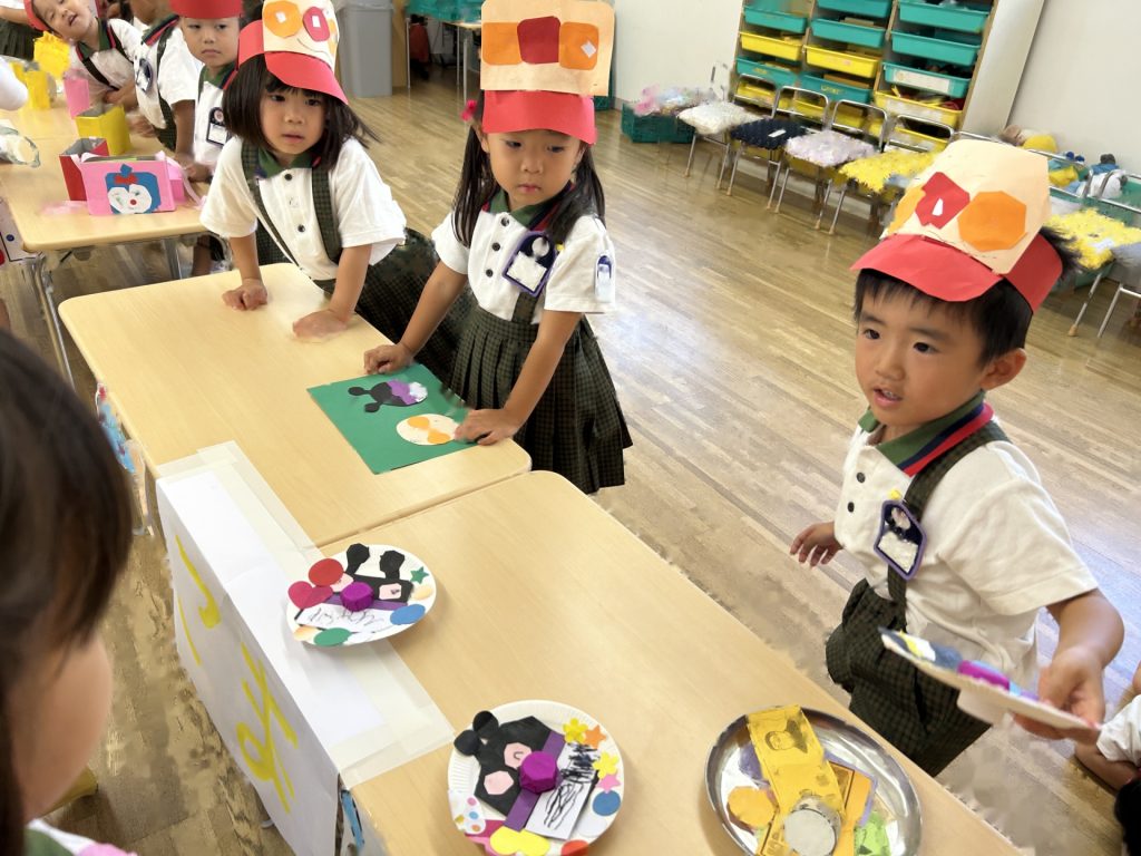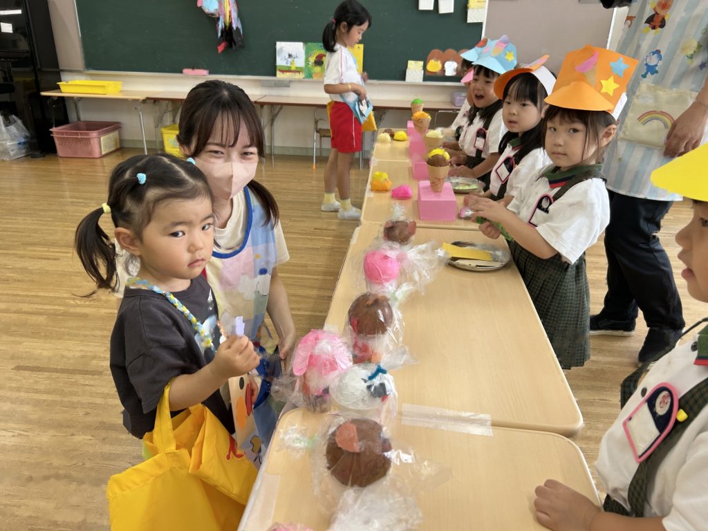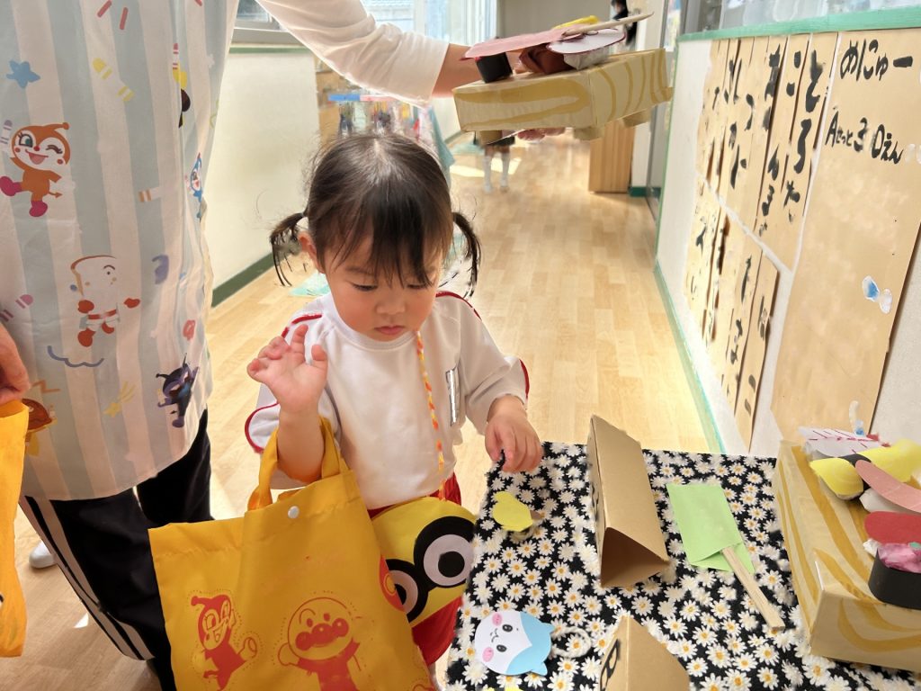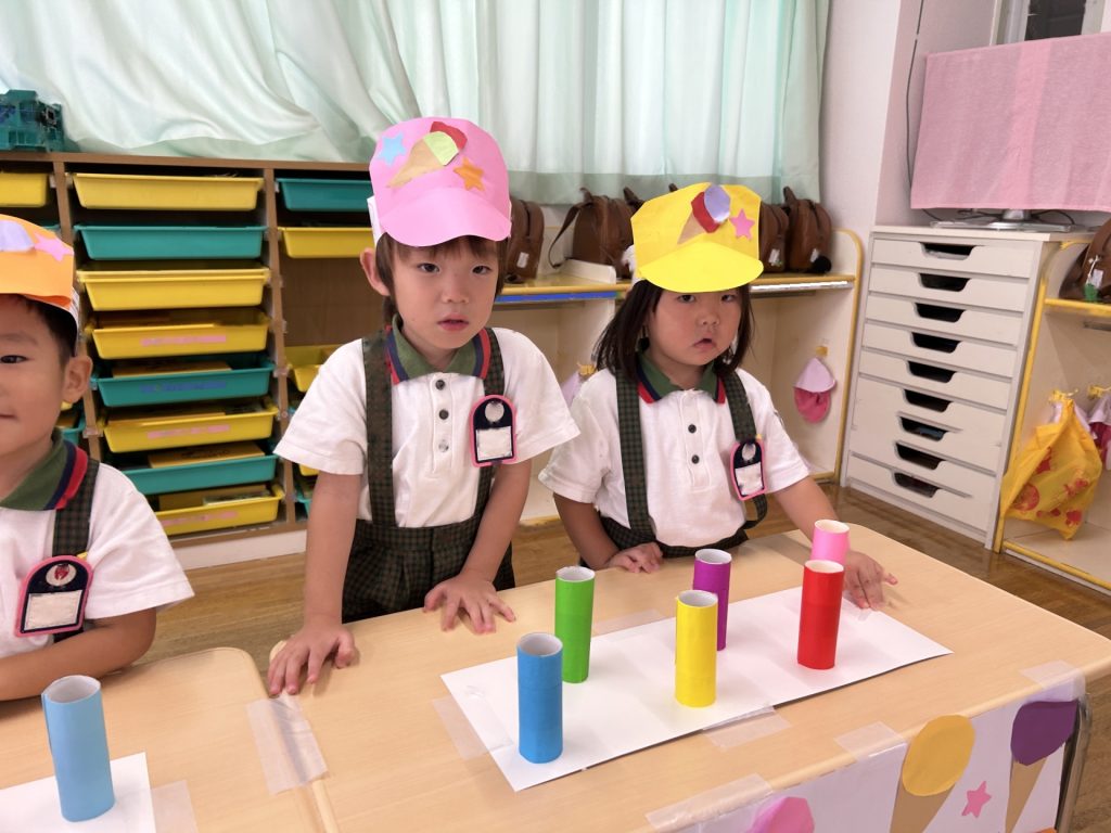 サンバイザーをかぶり「いらっしゃいませー」ととってもかわいかったおみせやさん。初めてのおみせやさんでしたがみんなとっても楽しそうに取り組んでいましたよ。キャラクターバーが人気のアイスクリーム屋さんでした😊