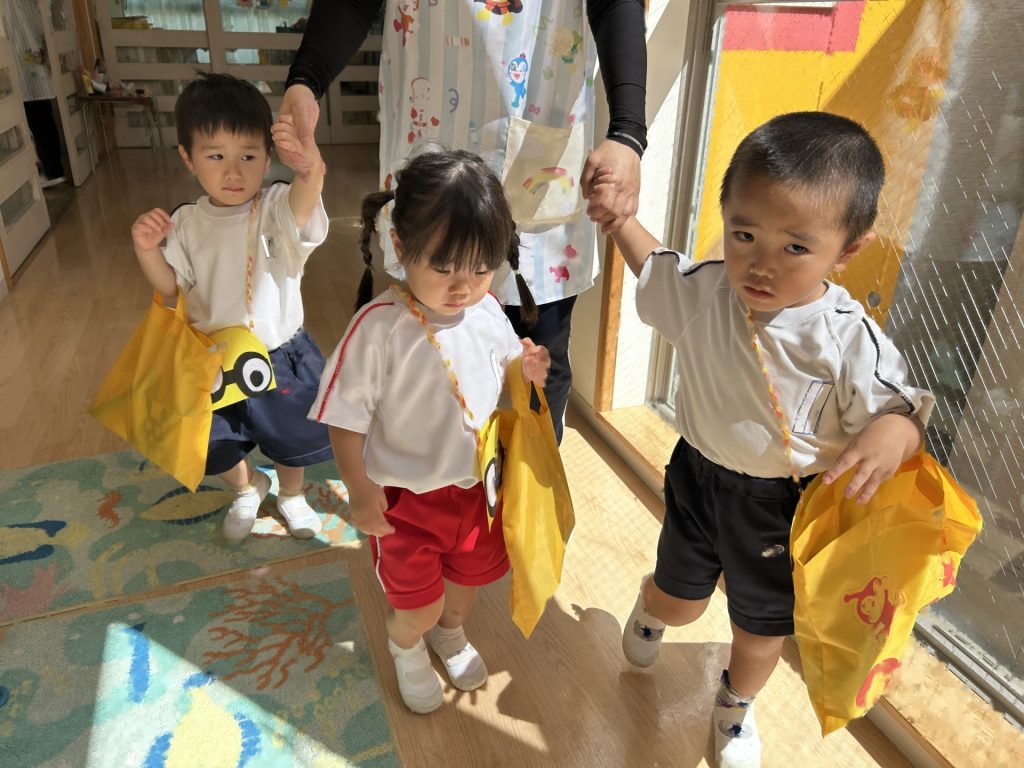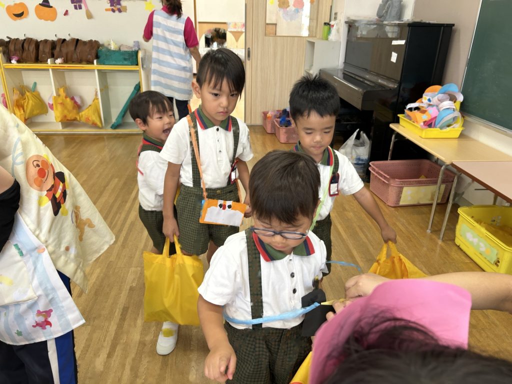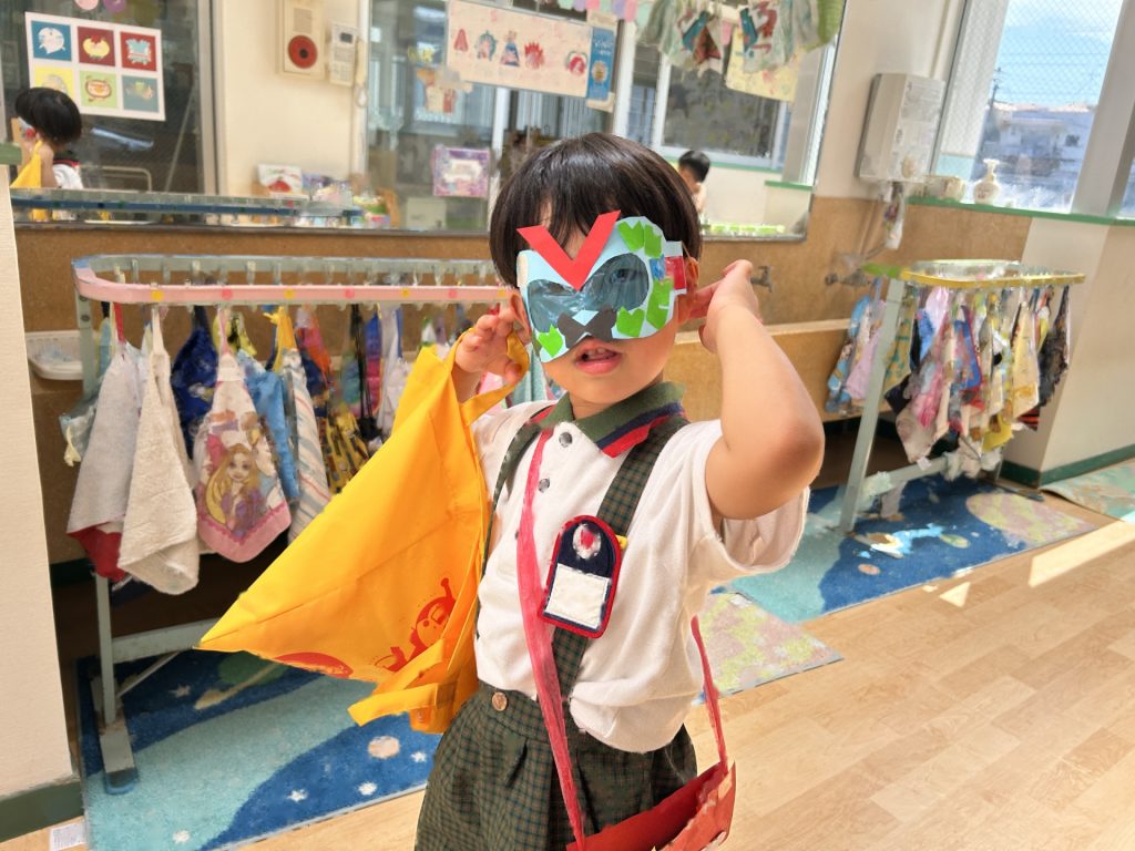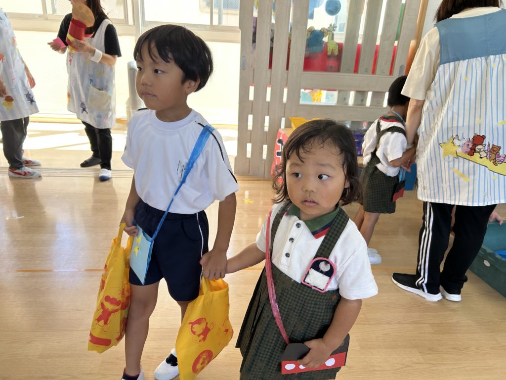 おみせやさん役のおともだちはおみせやさんの帽子をかぶったり、エプロンをつけたりして準備をし、お客さん役のおともだちはお金の入った財布を首から掛け、買ったものを入れるためのお荷物かばんを持って準備完了!