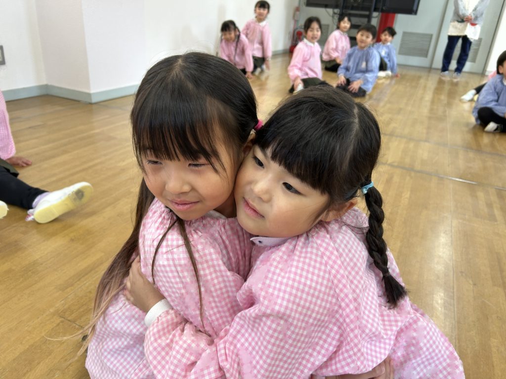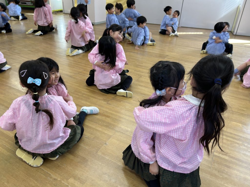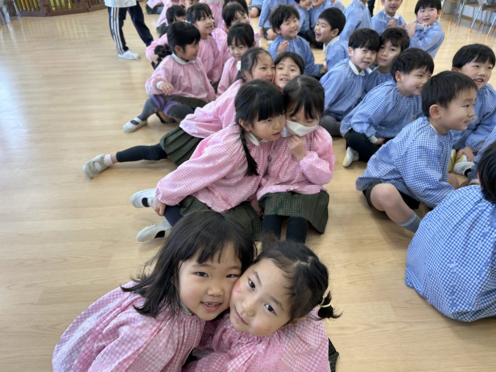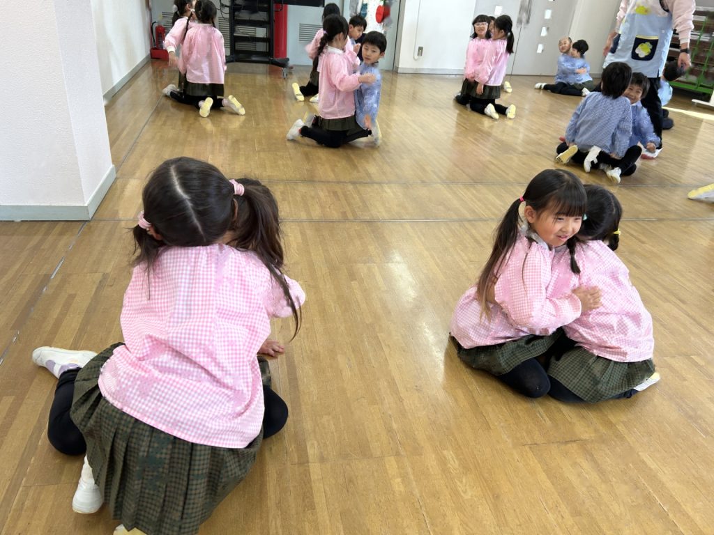 保育者が「くっつけくっつけ~あたま」というとペアのおともだちと頭と頭をくっつけます。他にもほっぺやおしり、おなかなど楽しそうにくっつきゲームをたのしんでいました😊