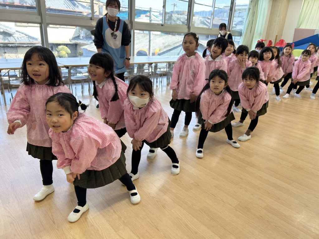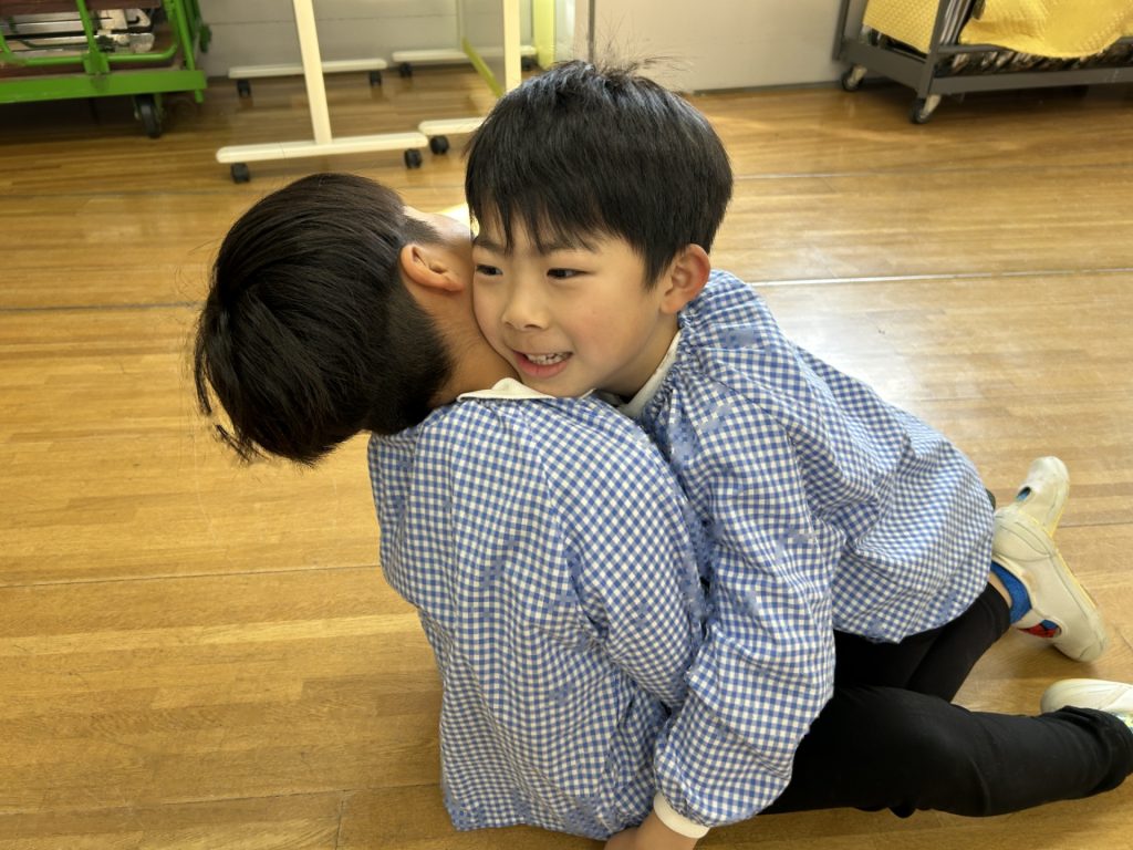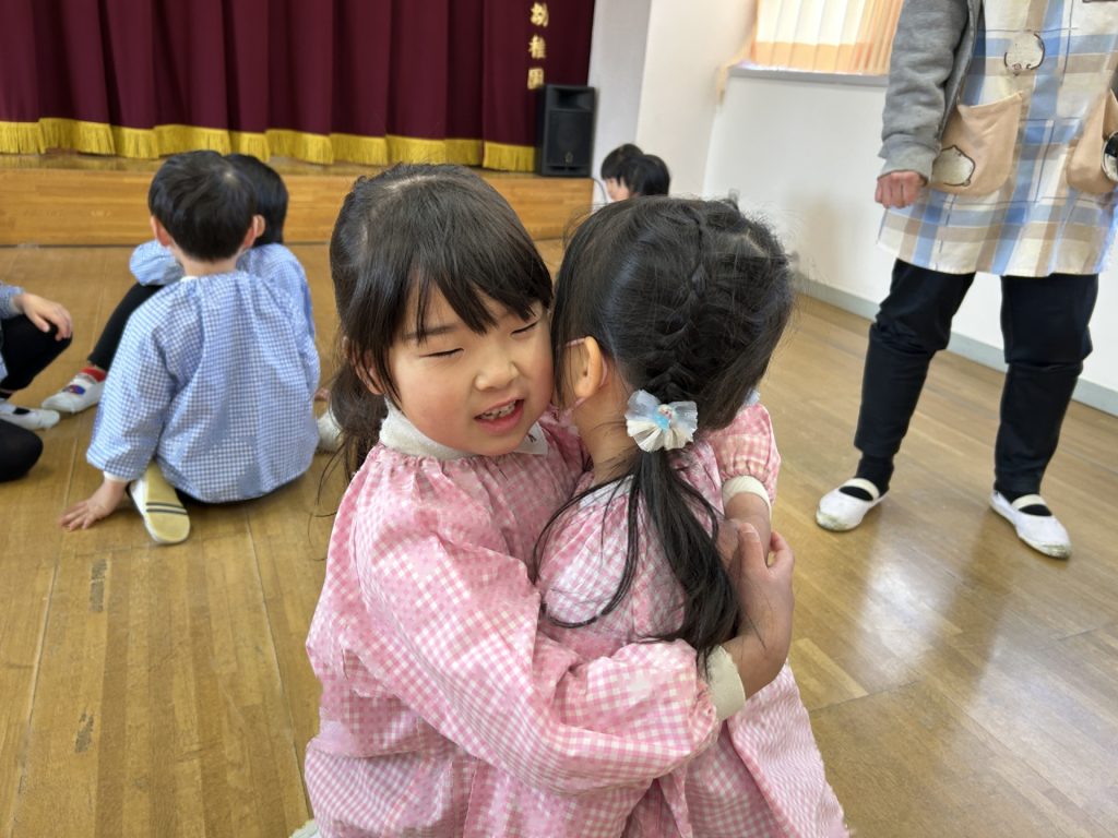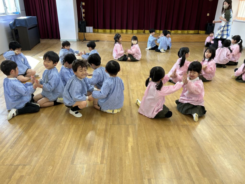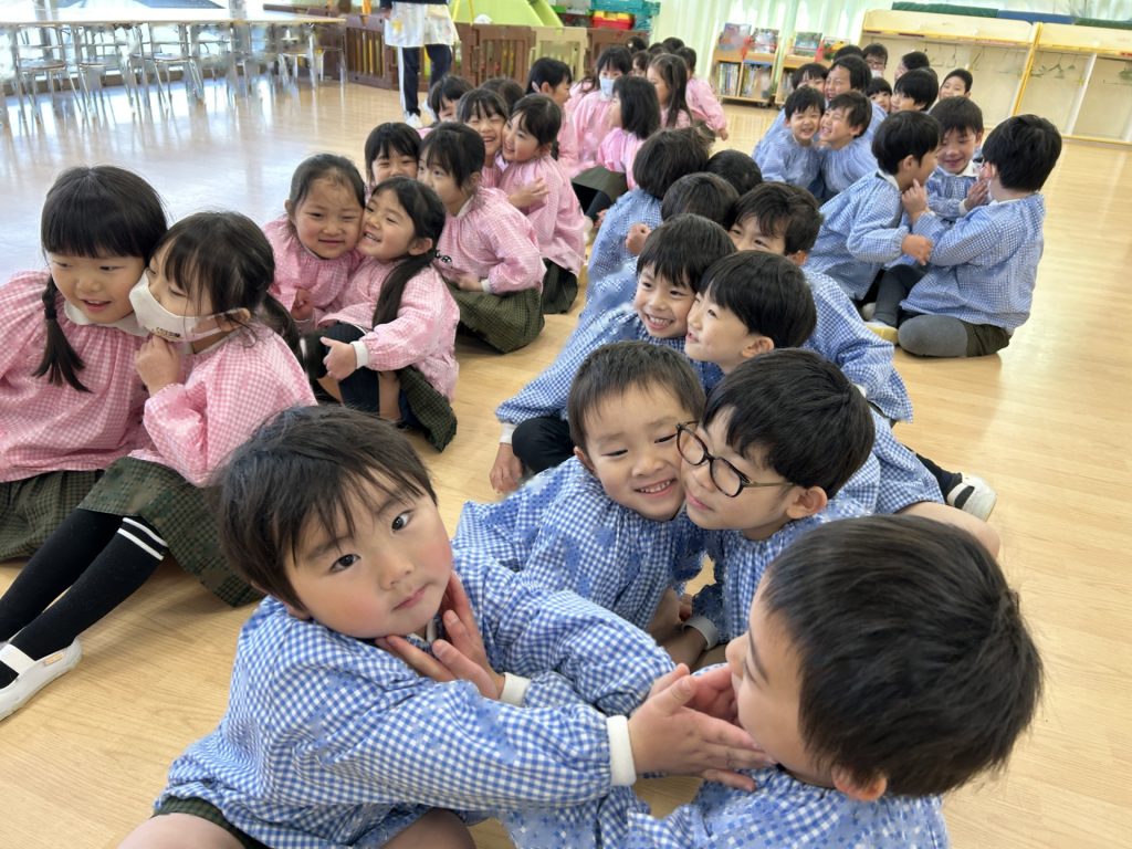 保育者が「くっつけくっつけ~あたま」というとペアのおともだちと頭と頭をくっつけます。他にもほっぺやおしり、おなかなど楽しそうにくっつきゲームをたのしんでいました😊