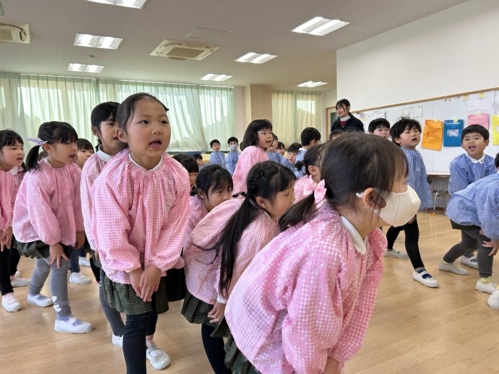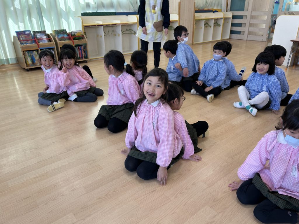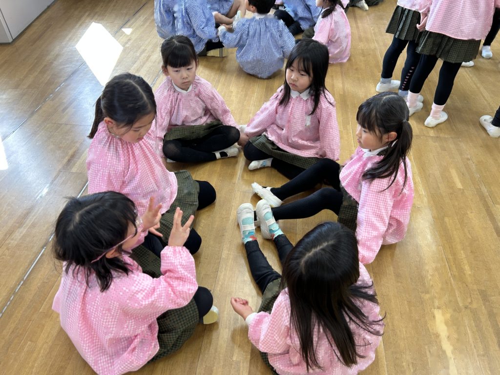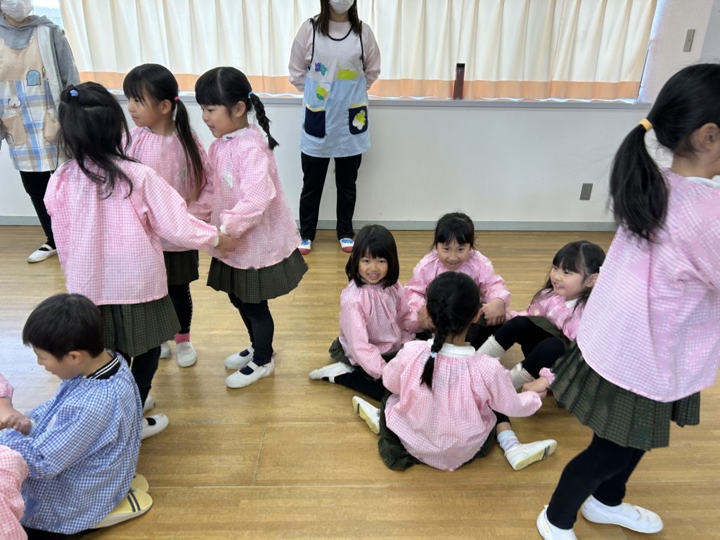 だんだんと難易度があがり最後は「ゴールデンレトリバー」等長い名前になりました。人数より多く集まった場合にどうやって分かれるかがうまくいかずに止まっているグループが多かったです。例えば5人組の時に6人のグループが誰も抜けずにずっとそのまま。中にはじゃんけんで決めているグループもありましたが、周りを見ながらほかの少ないグループを見つけて、さっと移動できるおともだちはなかなかいず、単純なのですが実は奥が深いゲームだなと思いました😊