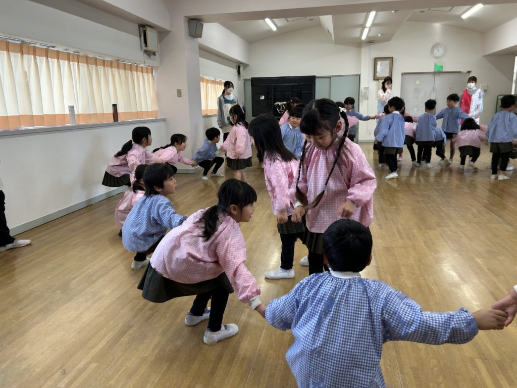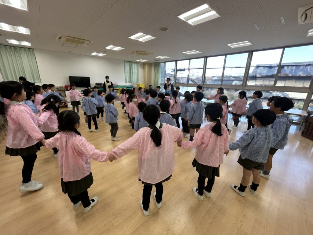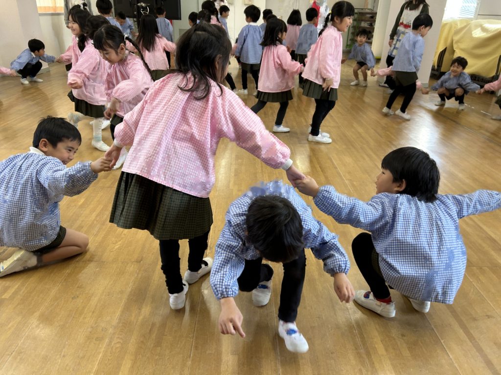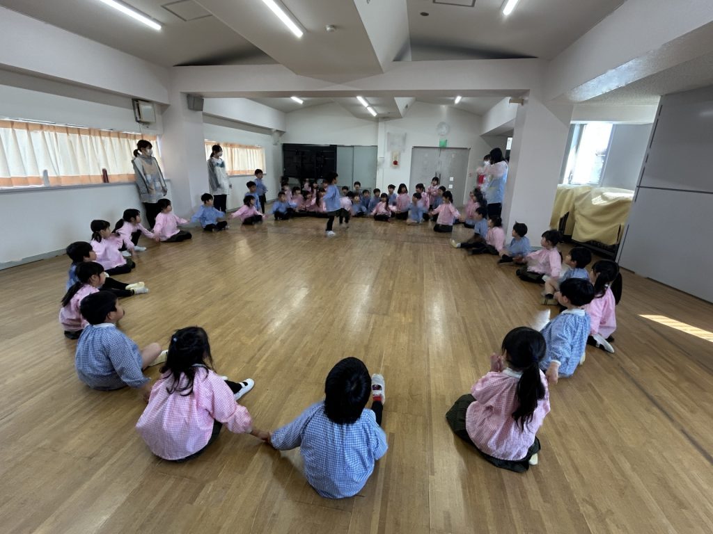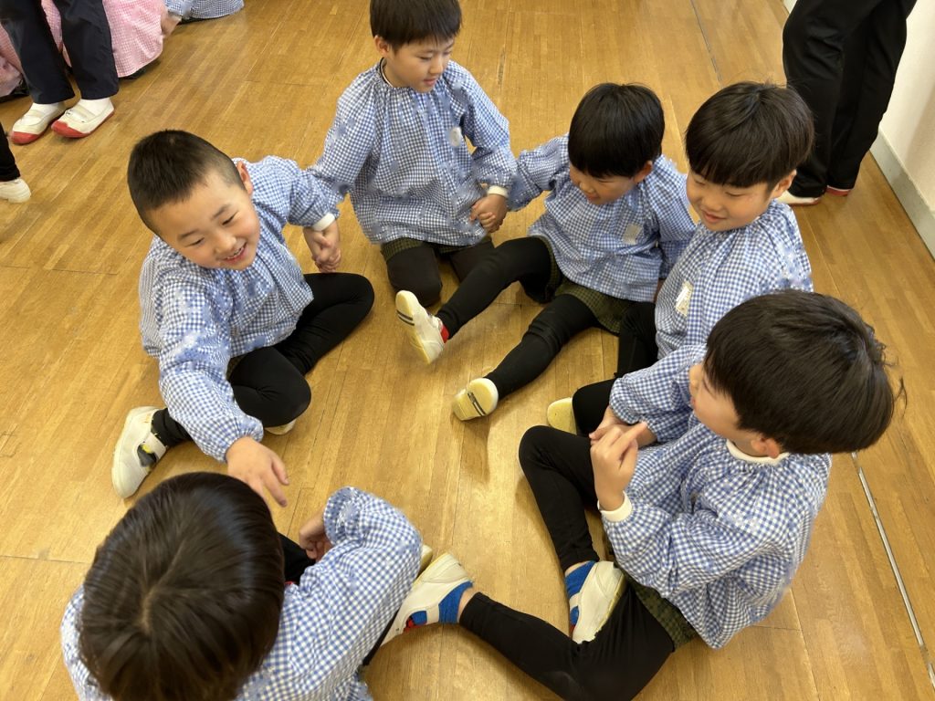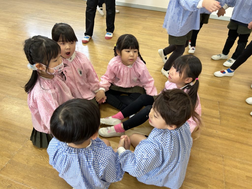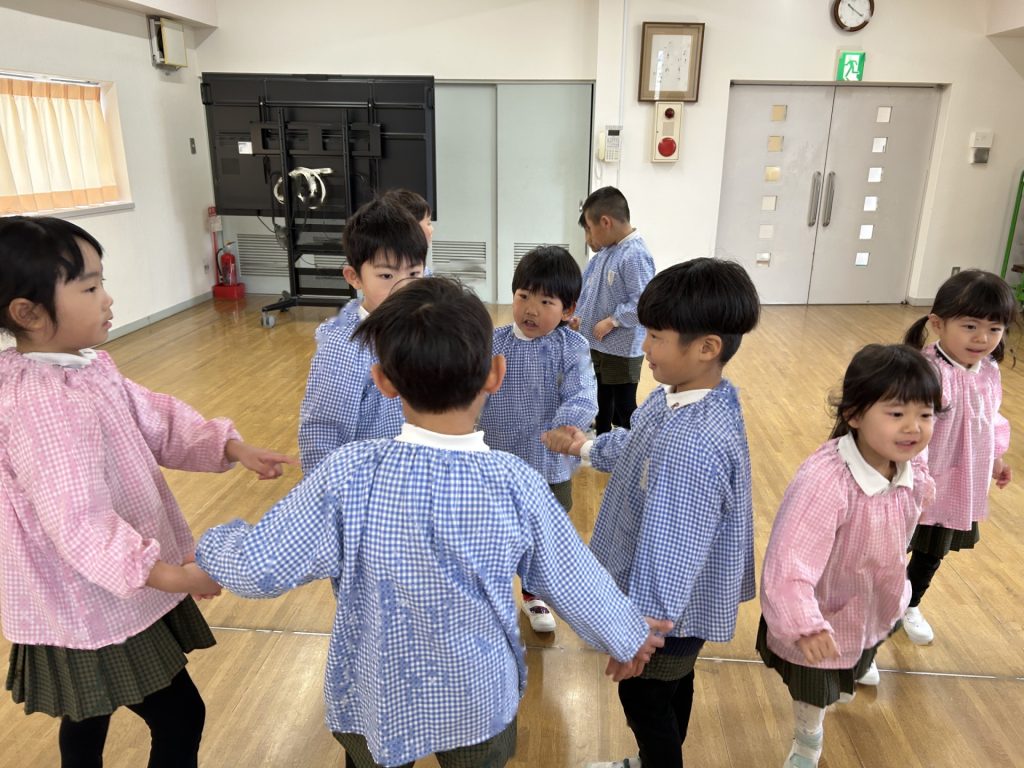 はじめは5歳児クラスが全員で手をつなぎます。4歳児さんはその輪の中に全員入ります。