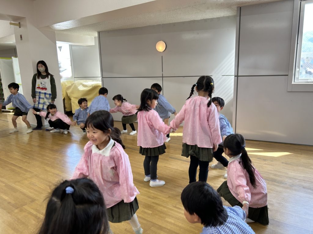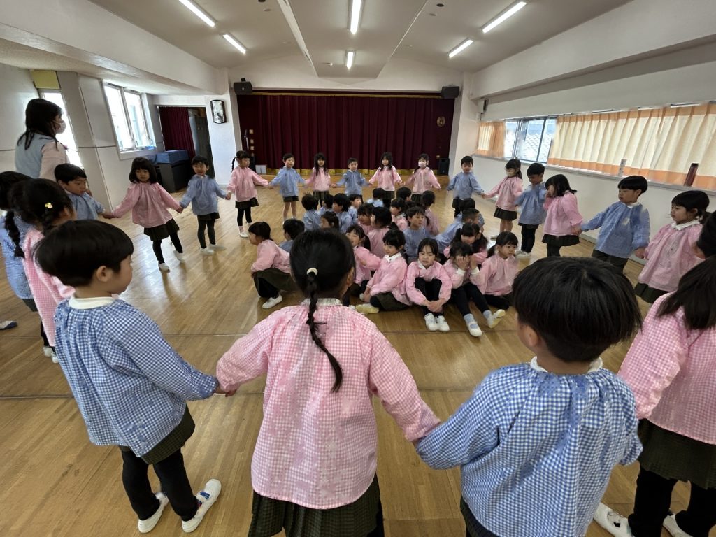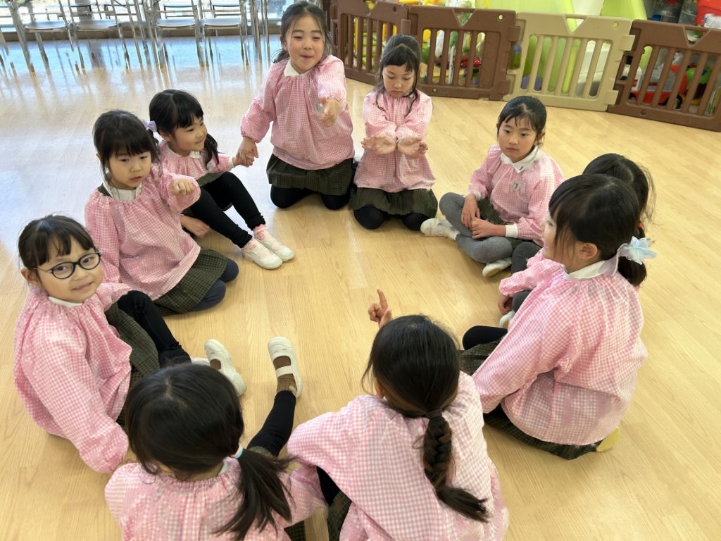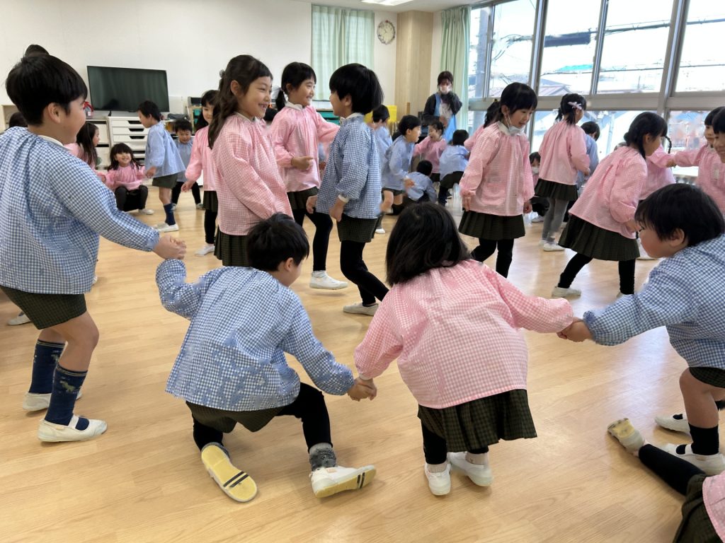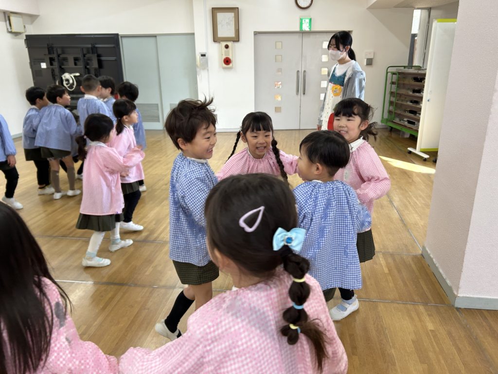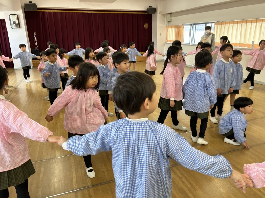 はじめは5歳児クラスが全員で手をつなぎます。4歳児さんはその輪の中に全員入ります。