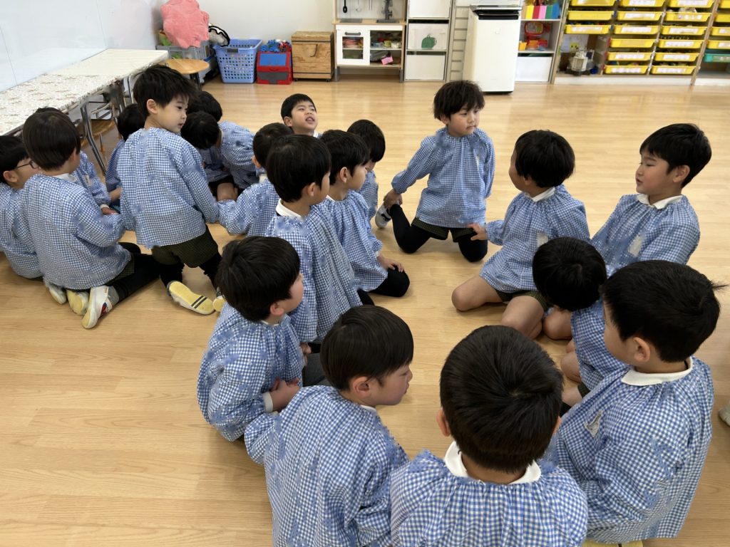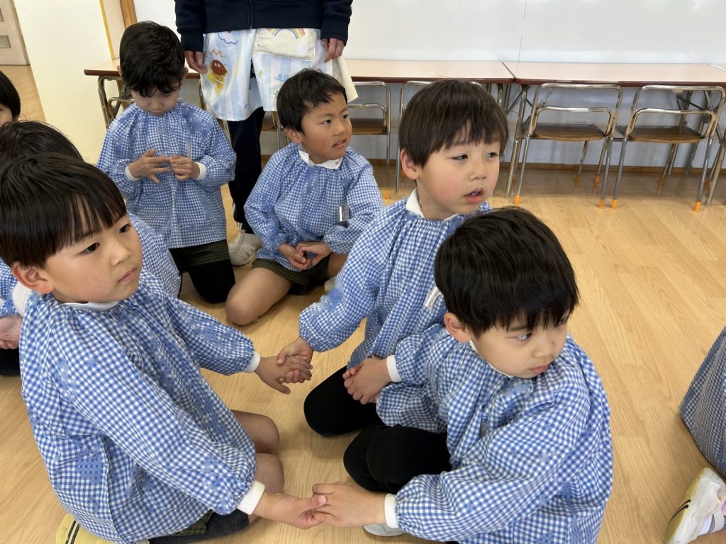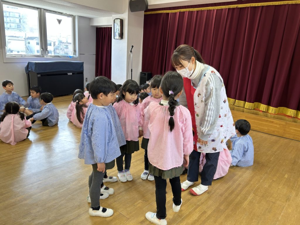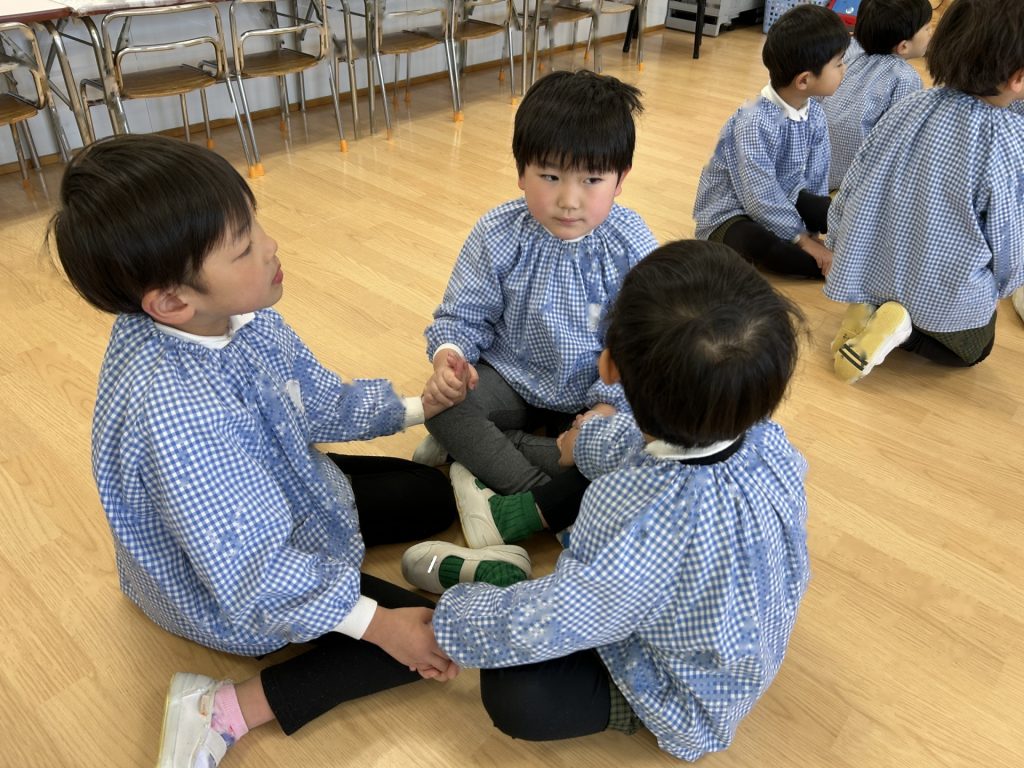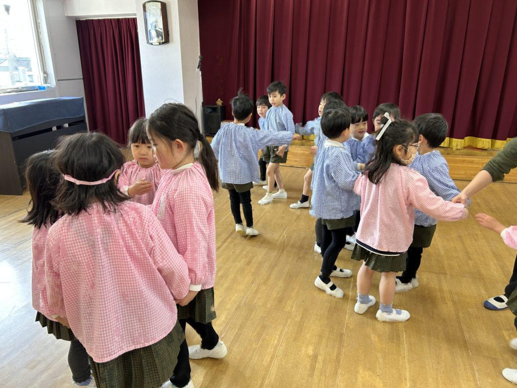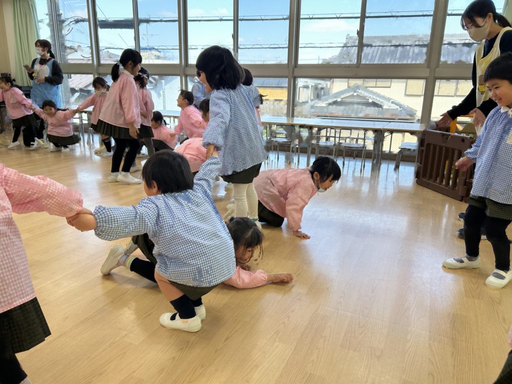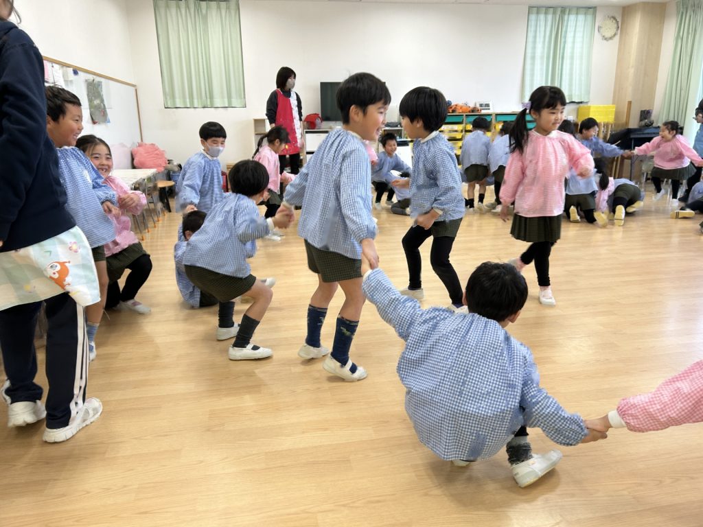 はじめは5歳児クラスが全員で手をつなぎます。4歳児さんはその輪の中に全員入ります。