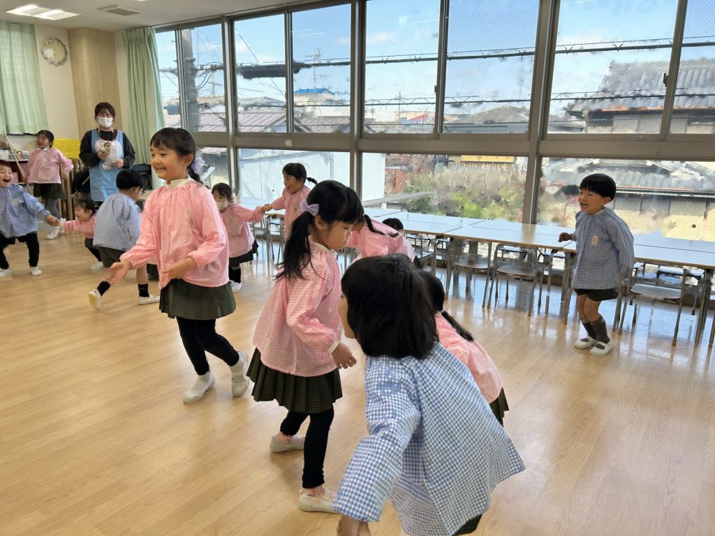 ちゅうりっぷぐみはこすもすぐみと3階ホールで、ひまわりぐみはあやめぐみ遊戯室で一緒に遊びました。