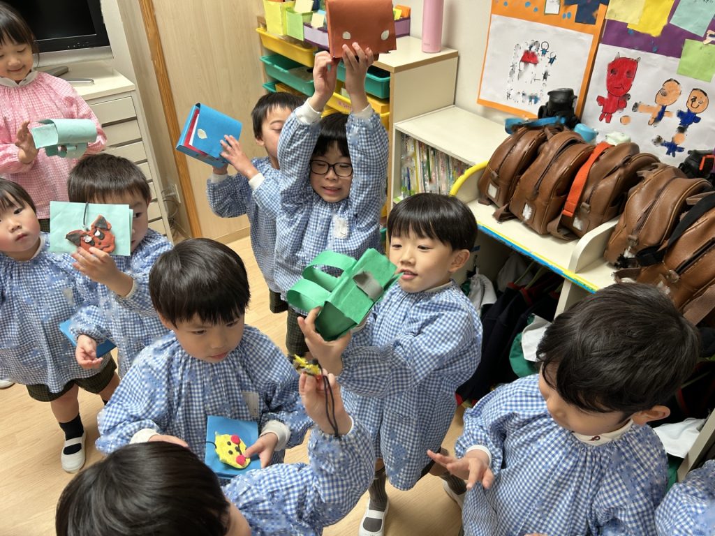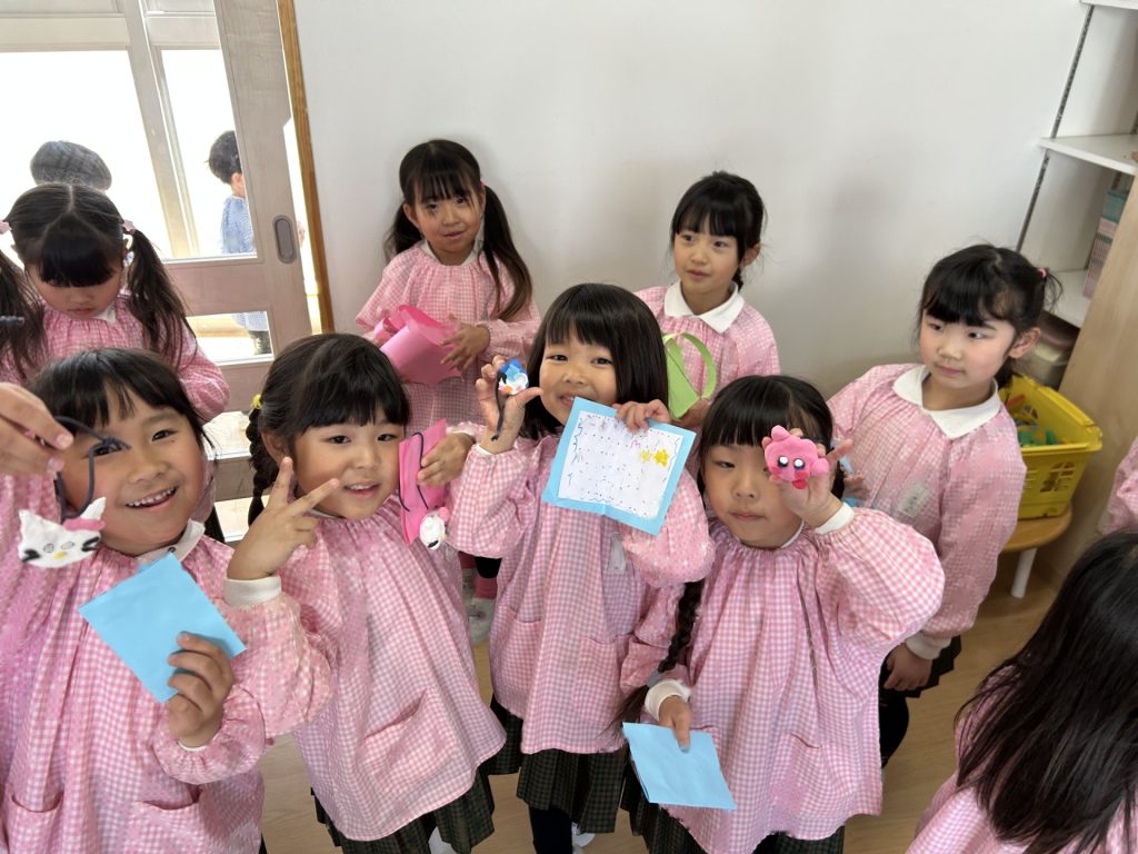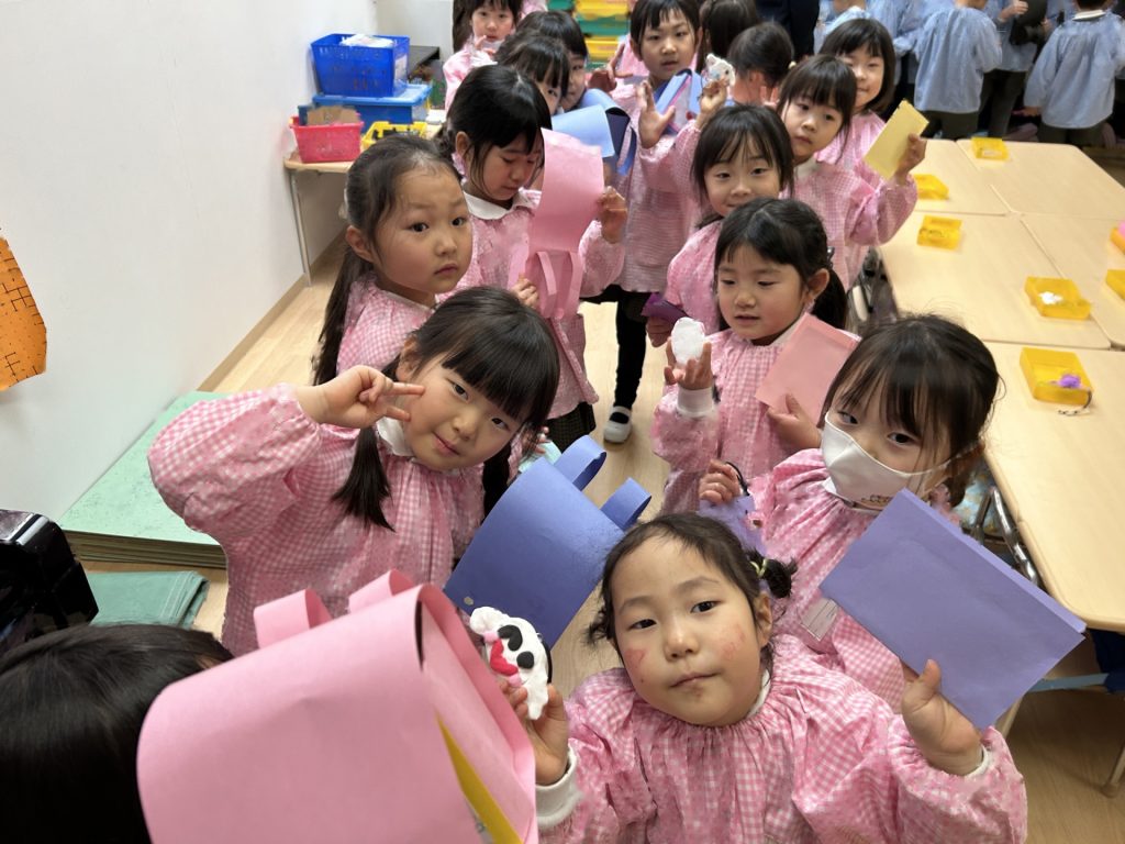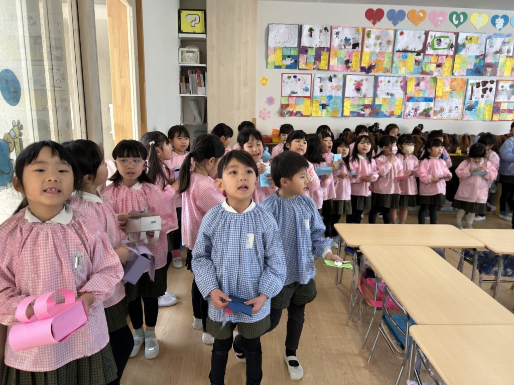 5歳児さんからは紙粘土のキーホルダーを、4歳児さんからはランドセル型の小物入れをプレゼントしました。ランドセルはお手紙でランドセルの色を聞いてその色で作ってくれましたよ🎒