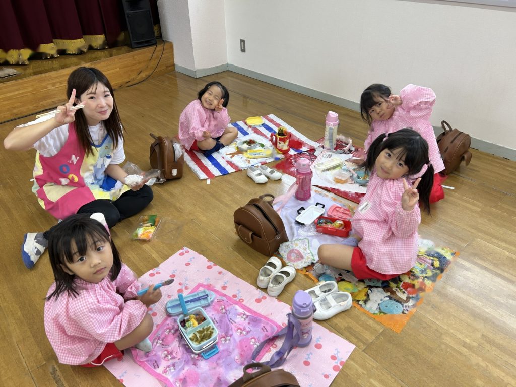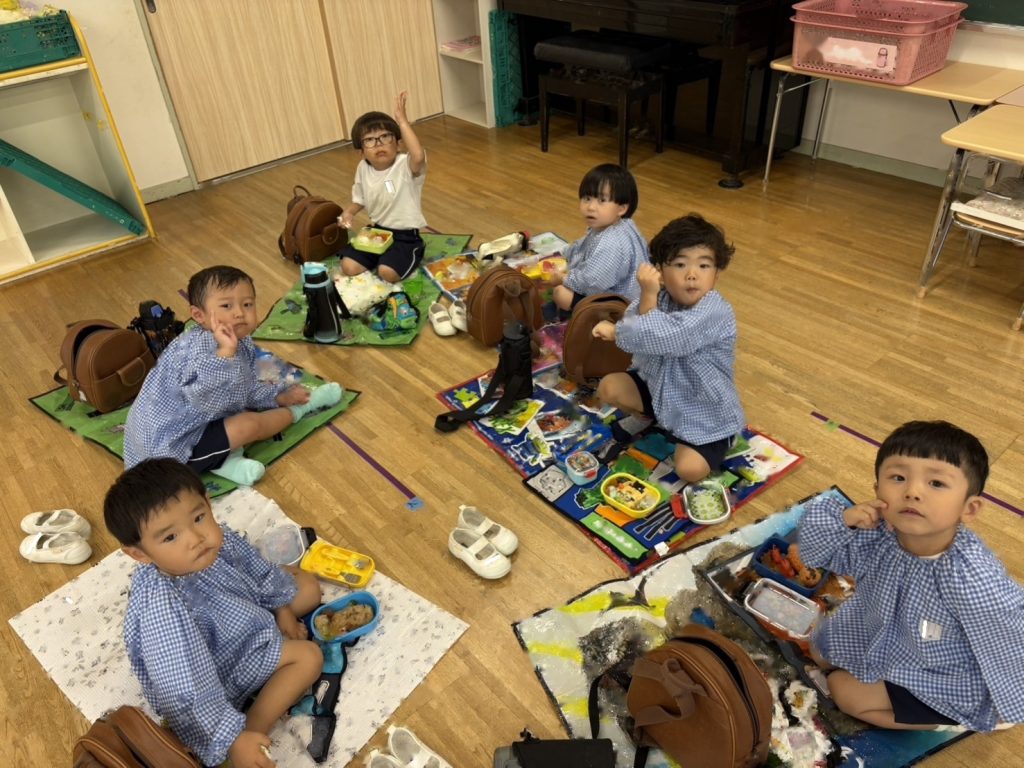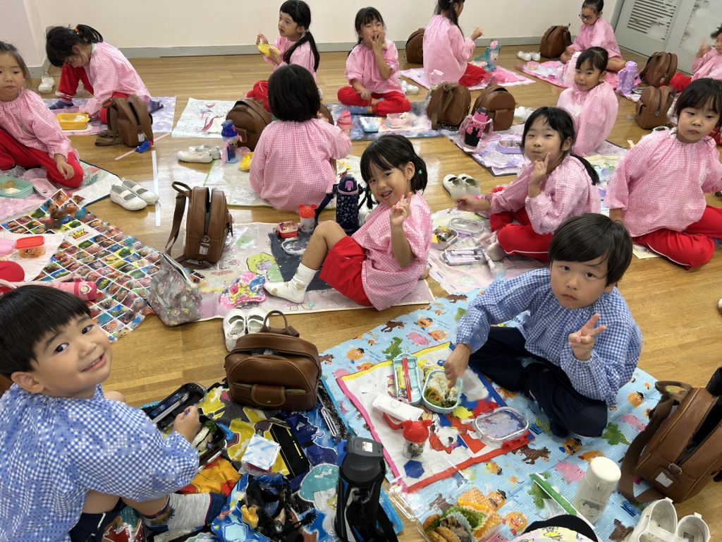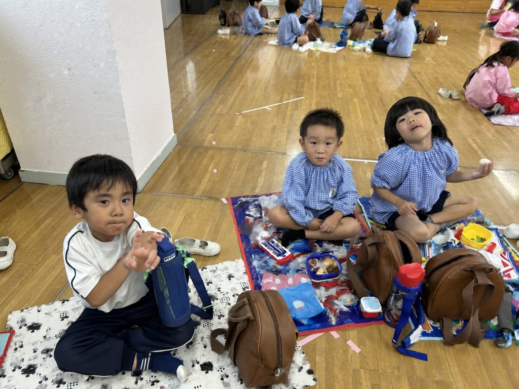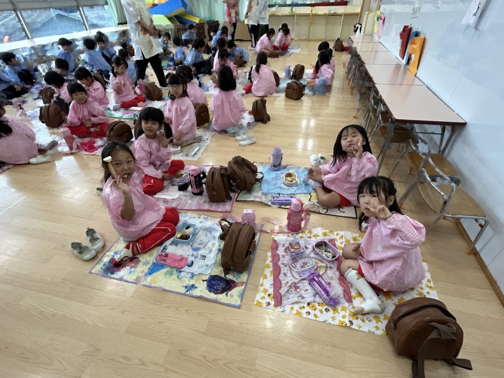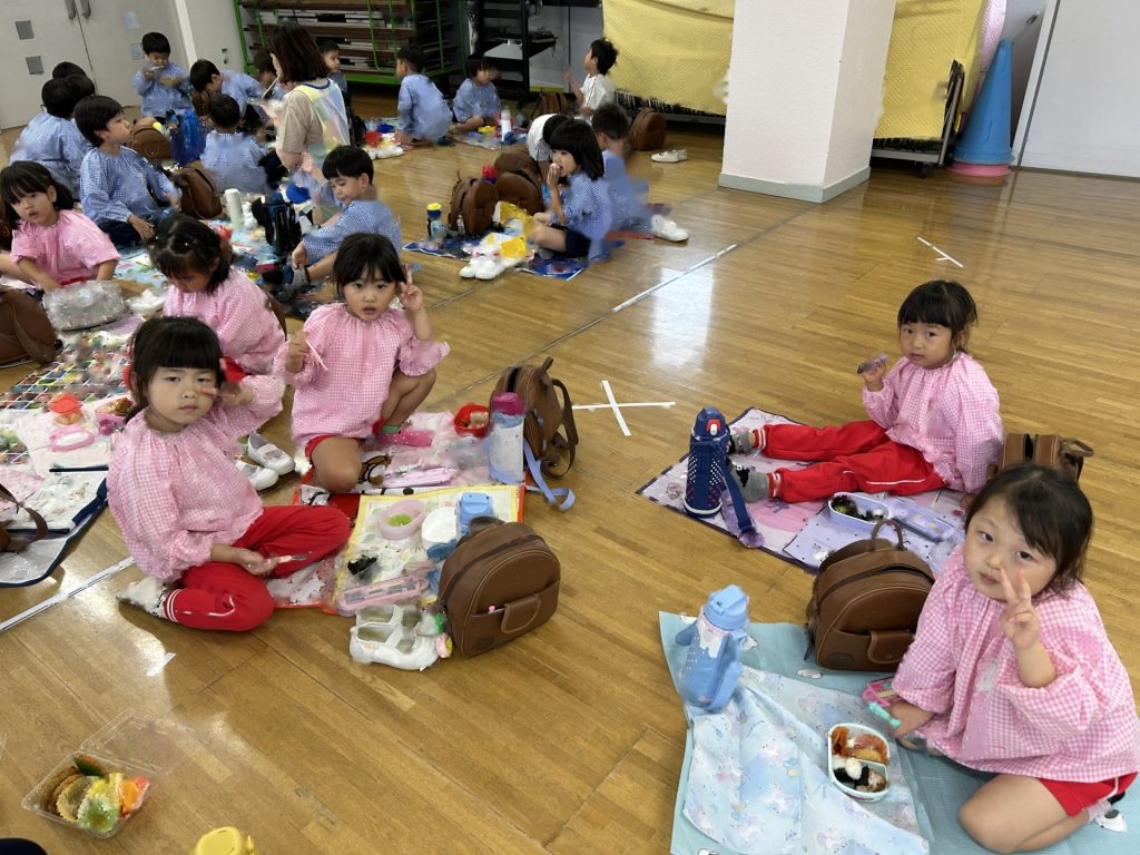 2週連続のお弁当にうれしそうなこどもたち、せっかくなので園庭や屋上で食べる予定でしたが、雨の為4,5歳児さんは3階ホールや遊戯室で他学年とペアになり一緒に食べました。3歳児クラスは保育室でレジャーシートを敷き、クラスを半分に分け、いつもとは違うおともだちも一緒にみんなでお弁当を食べました。