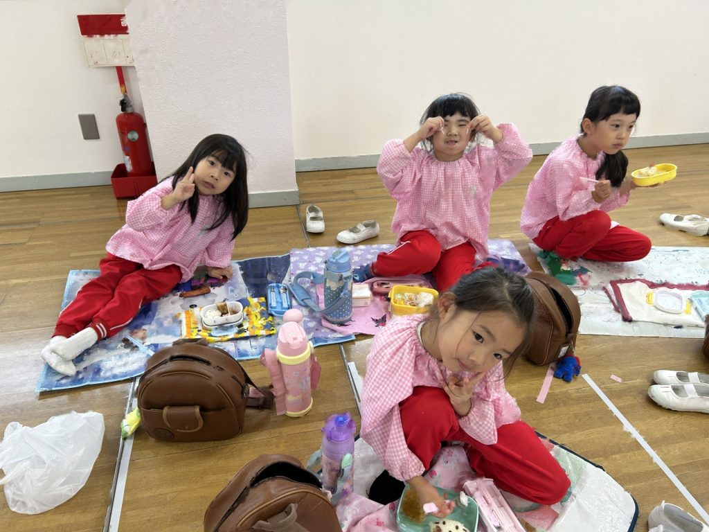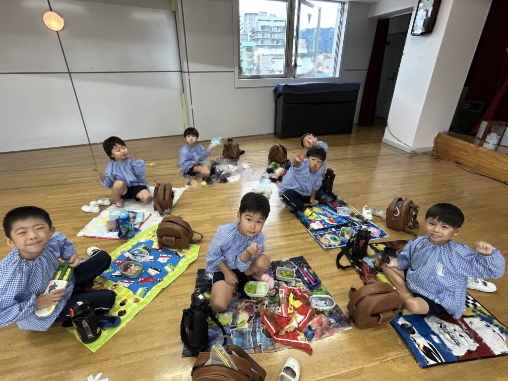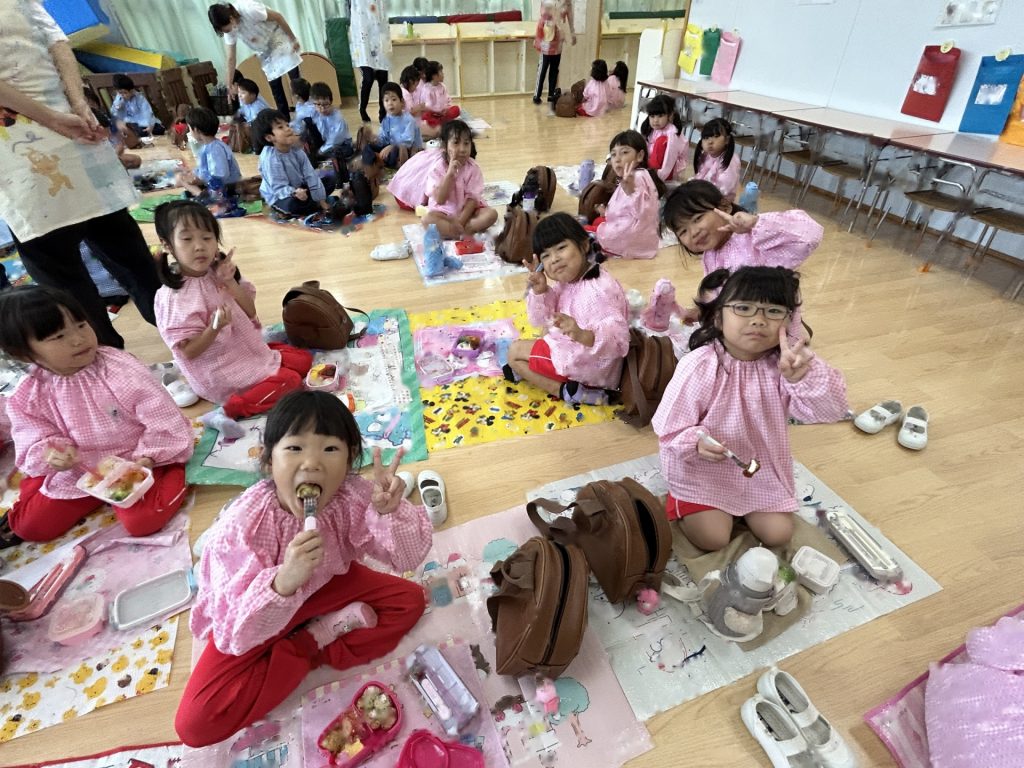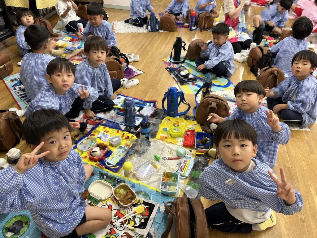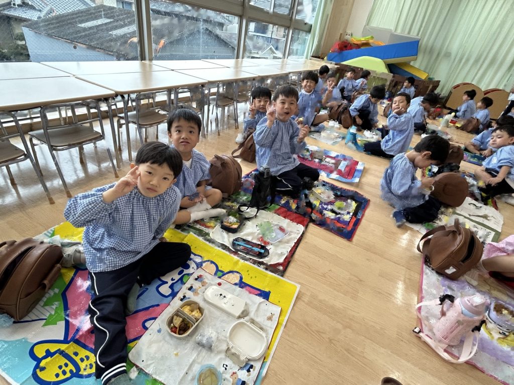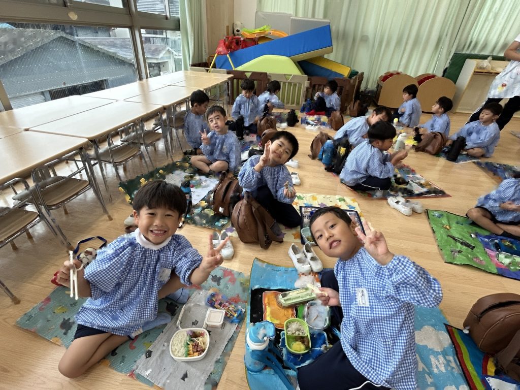 2週連続のお弁当にうれしそうなこどもたち、せっかくなので園庭や屋上で食べる予定でしたが、雨の為4,5歳児さんは3階ホールや遊戯室で他学年とペアになり一緒に食べました。3歳児クラスは保育室でレジャーシートを敷き、クラスを半分に分け、いつもとは違うおともだちも一緒にみんなでお弁当を食べました。