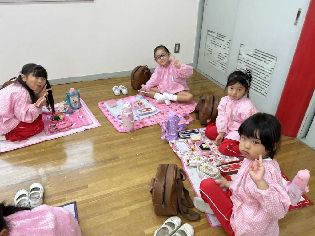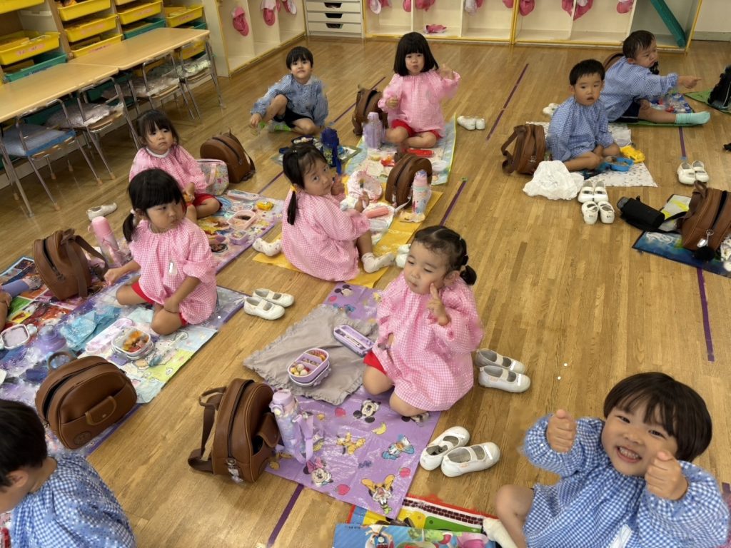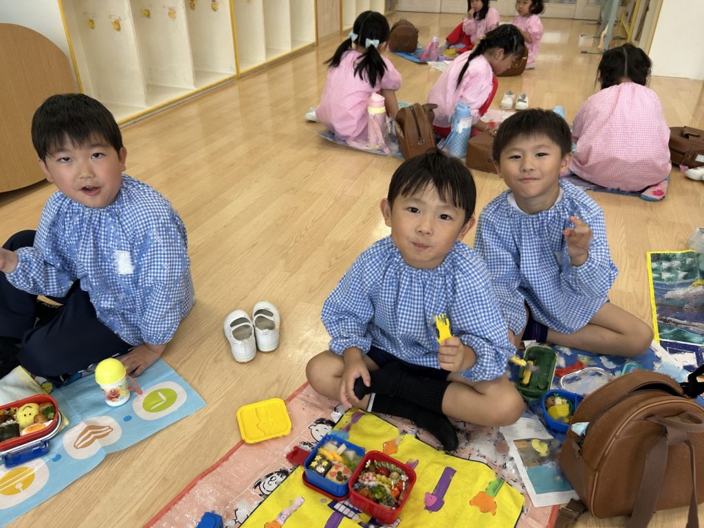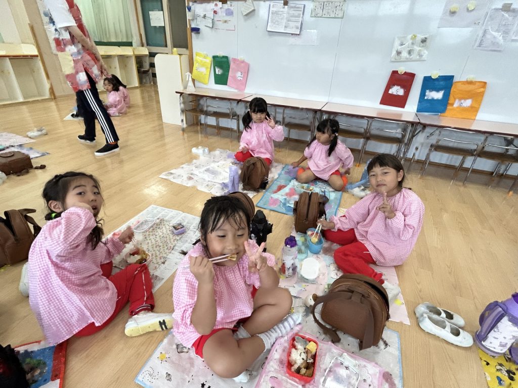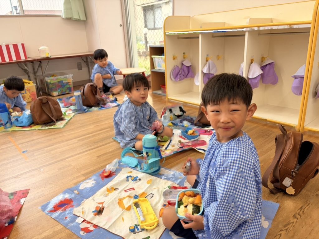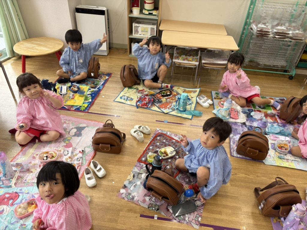 2週連続のお弁当にうれしそうなこどもたち、せっかくなので園庭や屋上で食べる予定でしたが、雨の為4,5歳児さんは3階ホールや遊戯室で他学年とペアになり一緒に食べました。3歳児クラスは保育室でレジャーシートを敷き、クラスを半分に分け、いつもとは違うおともだちも一緒にみんなでお弁当を食べました。