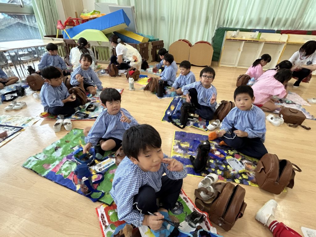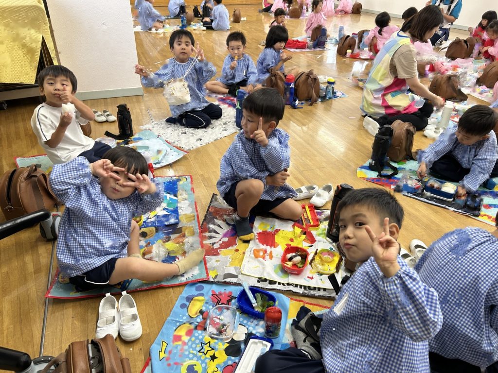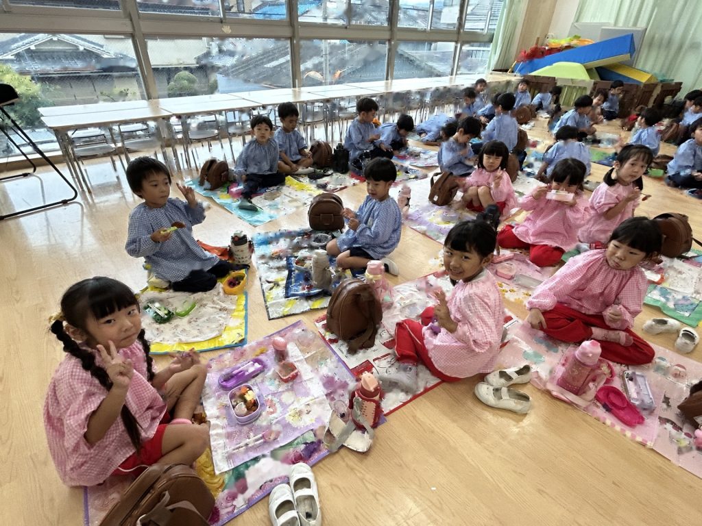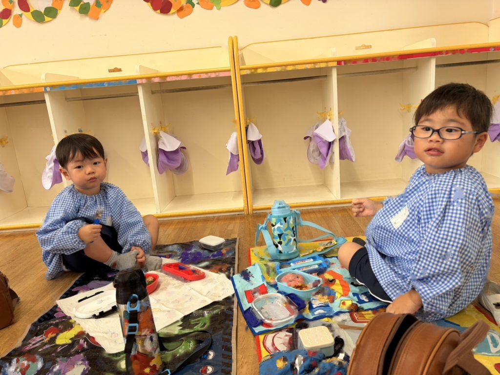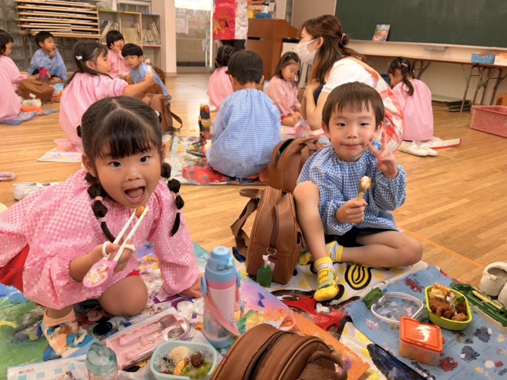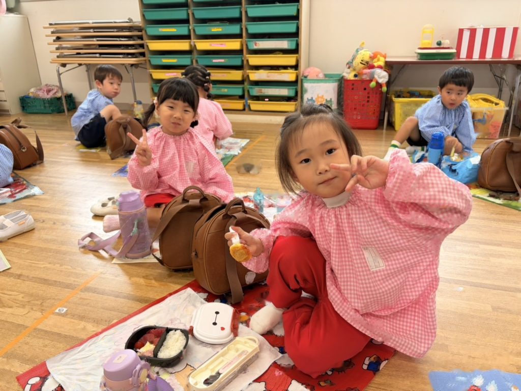 2週連続のお弁当にうれしそうなこどもたち、せっかくなので園庭や屋上で食べる予定でしたが、雨の為4,5歳児さんは3階ホールや遊戯室で他学年とペアになり一緒に食べました。3歳児クラスは保育室でレジャーシートを敷き、クラスを半分に分け、いつもとは違うおともだちも一緒にみんなでお弁当を食べました。