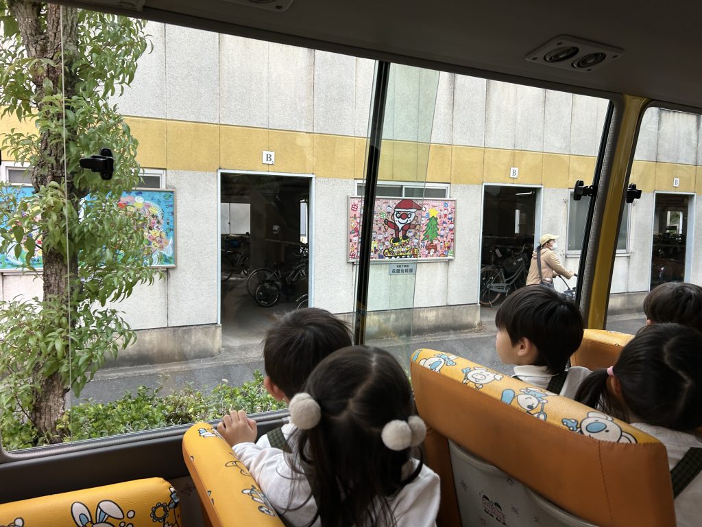バスの中から5歳児クラスさんが描いたパブリックアートの中から「50人のサンタクロース」がみえましたよ😊