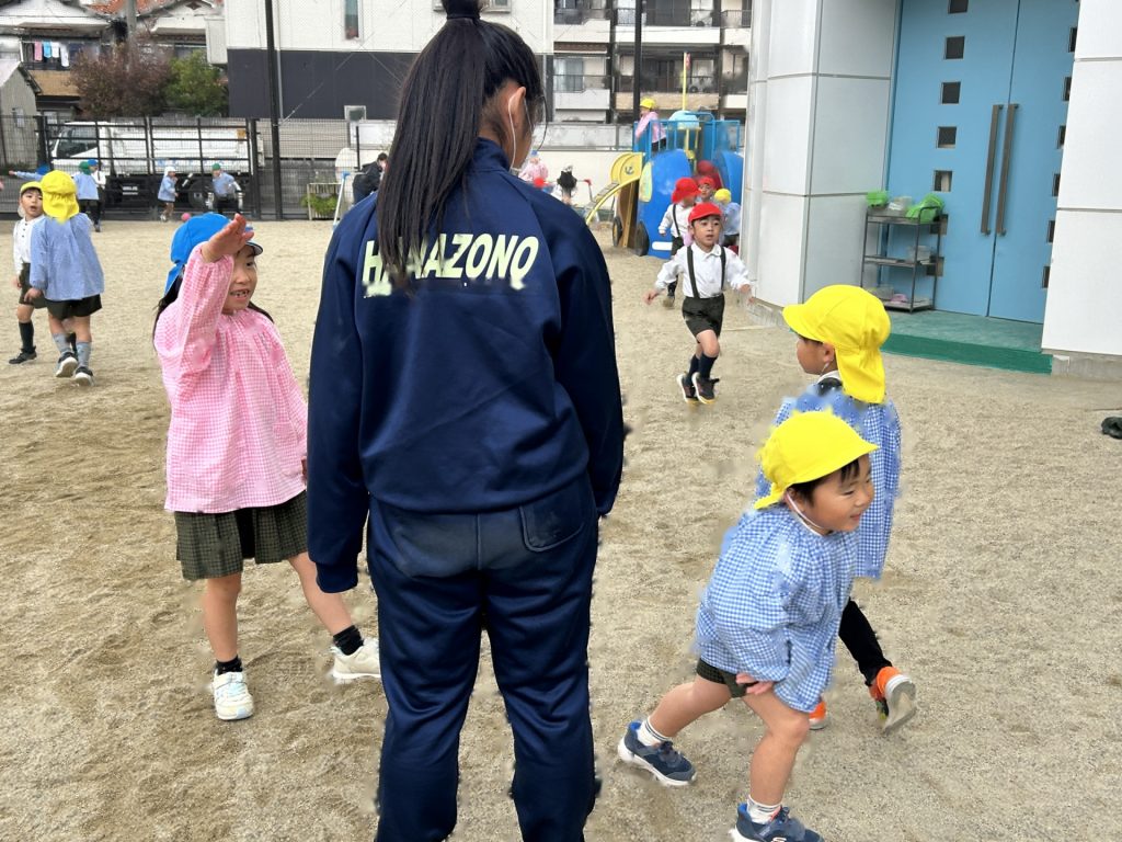朝の戸外遊びでは一緒におにごっこをしたり手をつないだりととってもうれしそうなこどもたちでした😊恥ずかしそうにしていた中学生さんも声をかけて遊ぶ様子が見られたり…中には初めから積極的に遊んでいたり子どもとかかわるのが上手な中学生さんもいましたよ。