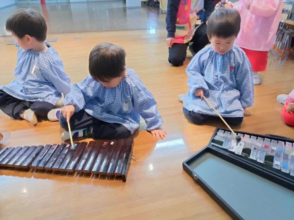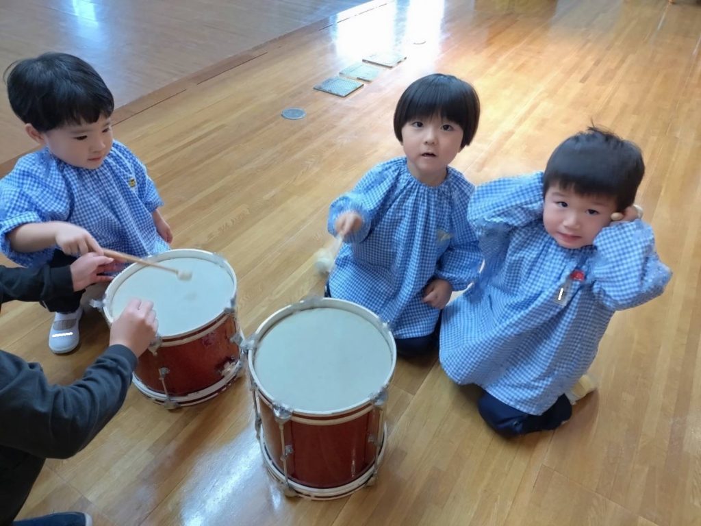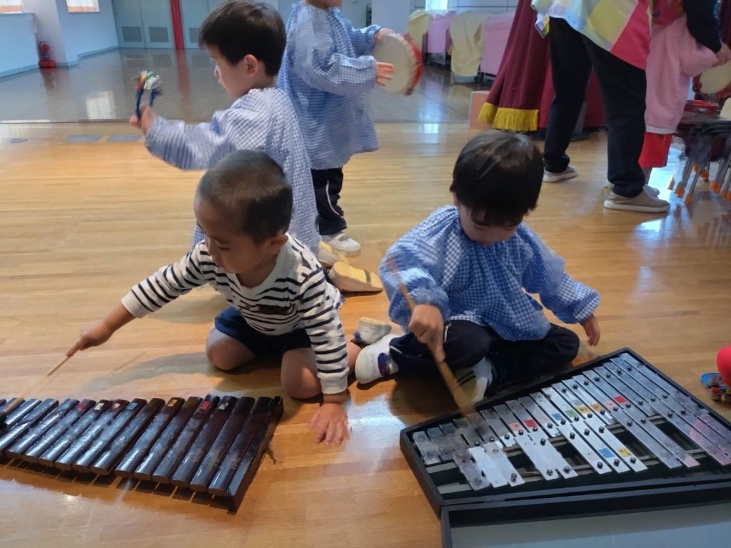 気に入った楽器を見つけてずっと鳴らしているおともだちやいろんな楽器を順番に鳴らしているおともだちなどみんな楽しんでいました。中には上手にリズムをとってたたいているおともだちもいましたよ♪