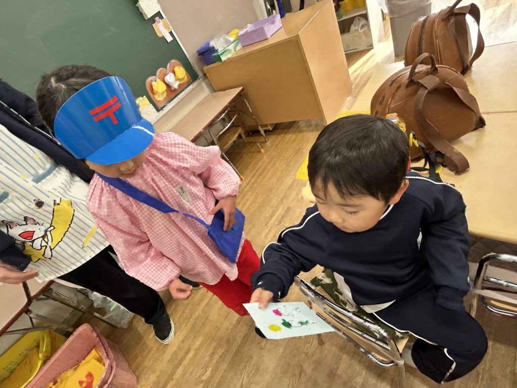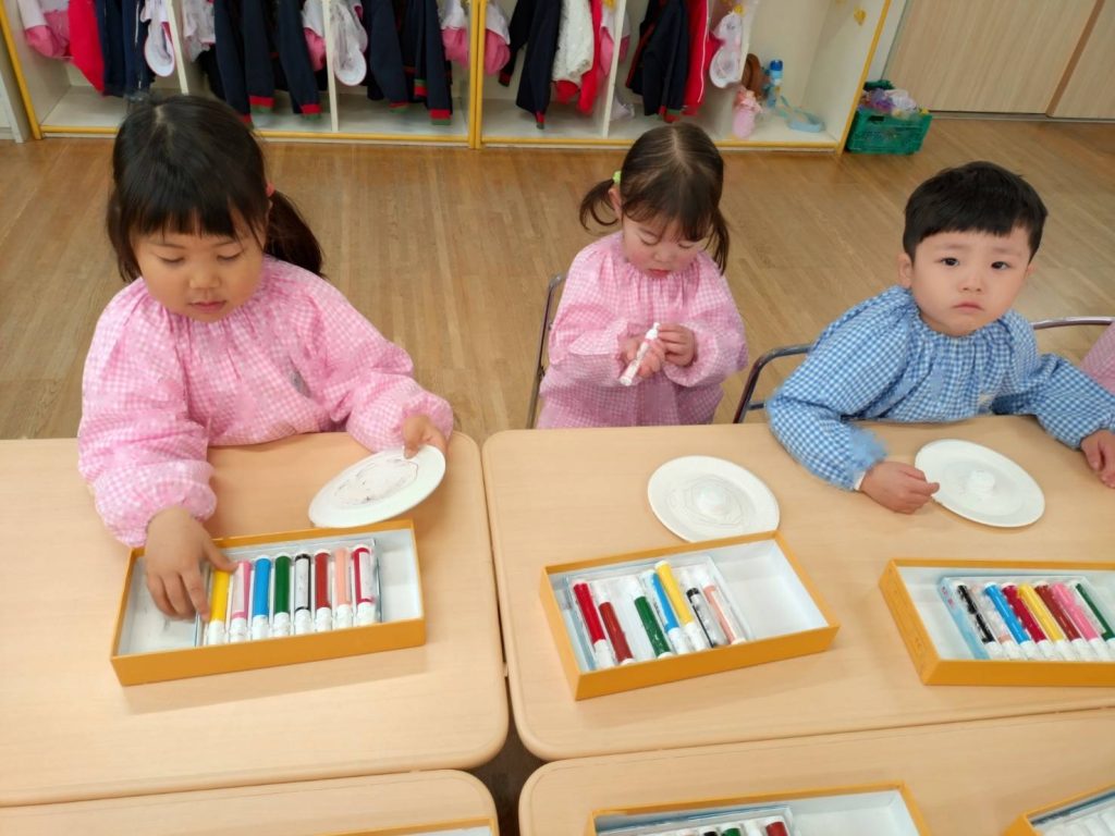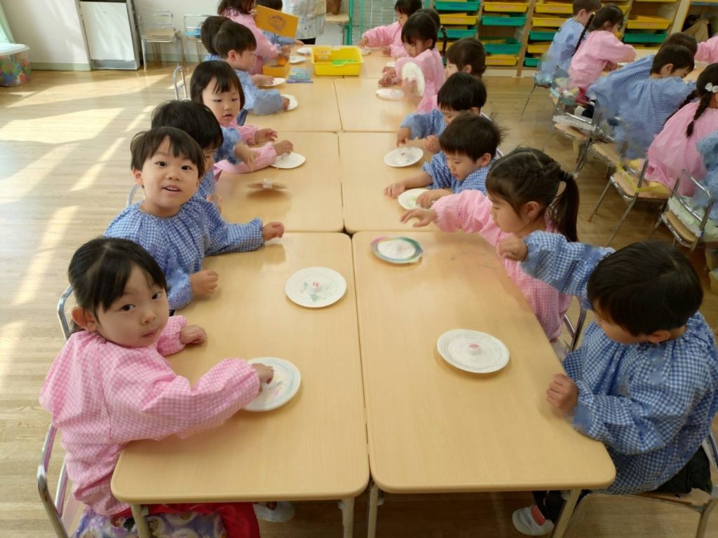 今日はコマの製作をしました。紙皿に絵をかいただけのコマですがくるくる回すときれいな模様になり、こどもたちは喜んでまわしていました。ももぐみさんの中にはゆりぐみさんにやさしく教えてあげたりとお世話してくれるおともだちもいました😊