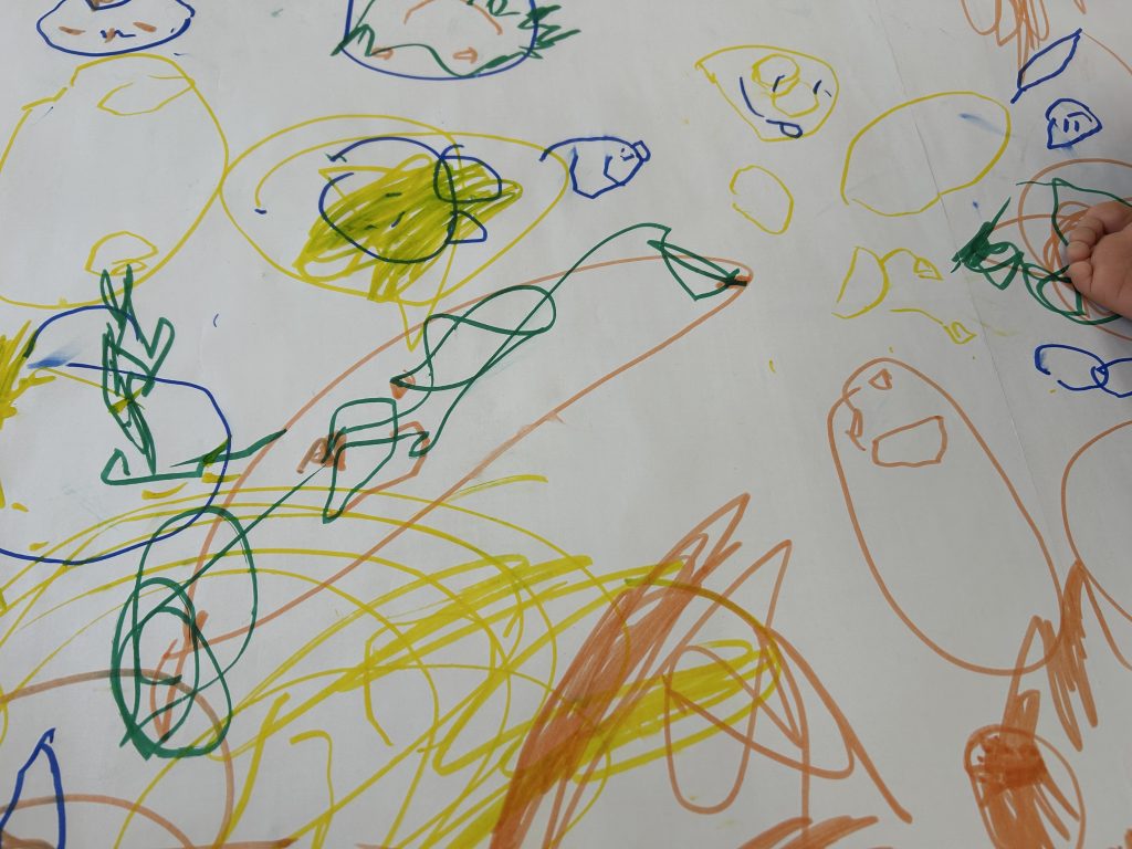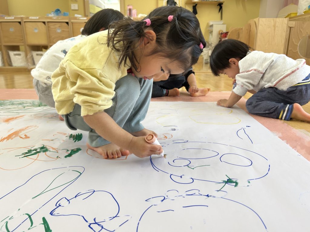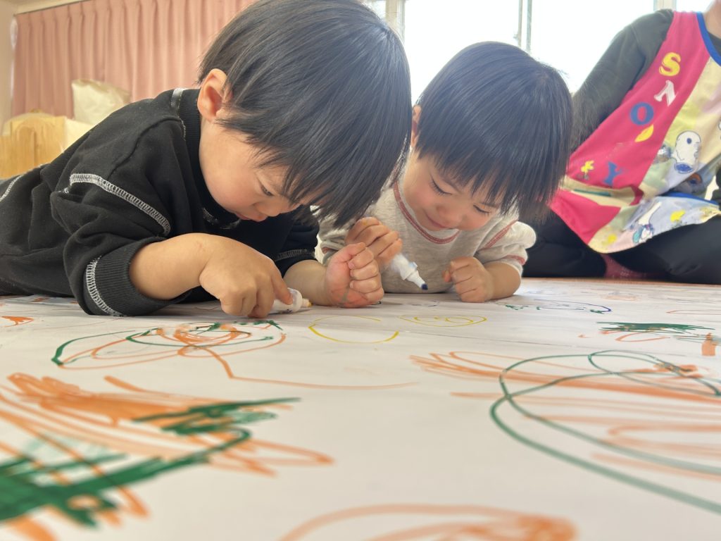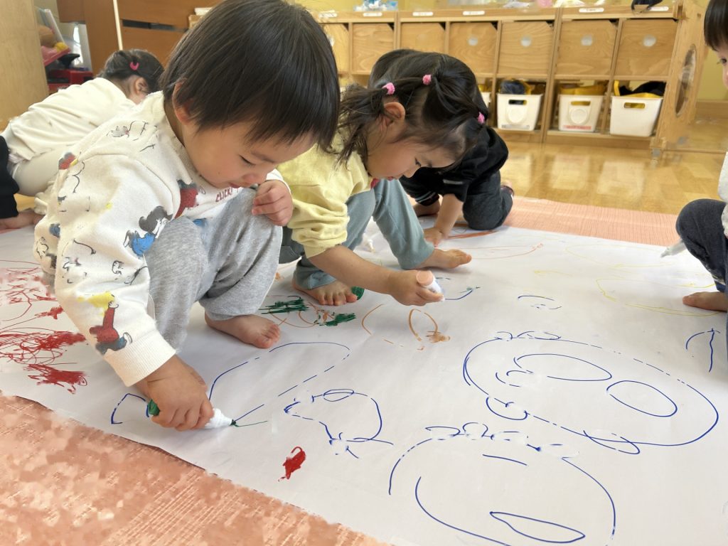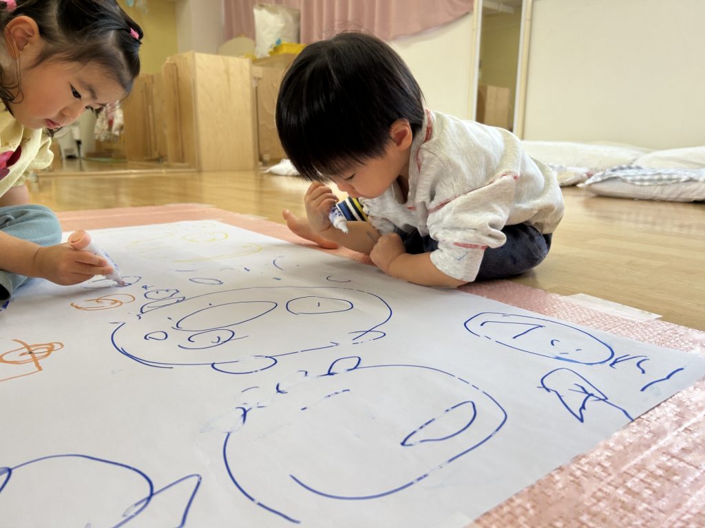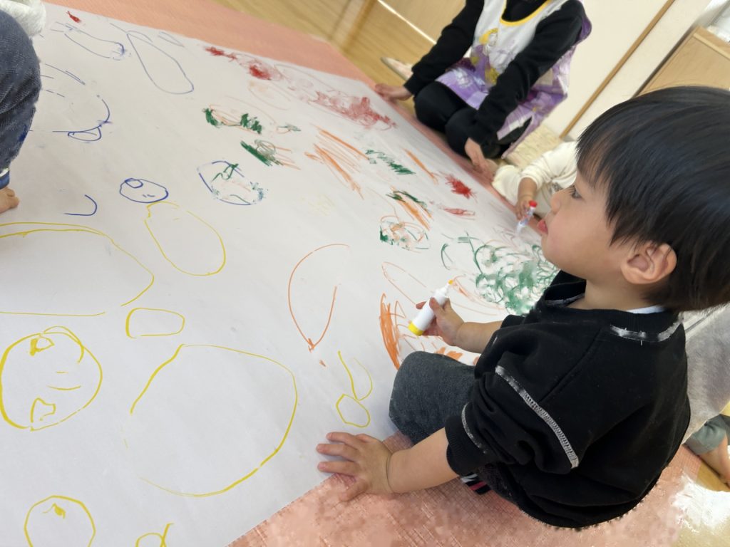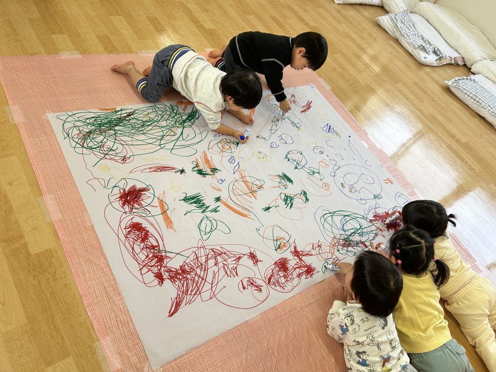 昨日は画用紙に自由に絵を描きましたが、今日は大きな紙にみんなで自由に絵を描きました。ひとり1本好きな色を選びその色で描いていきました。