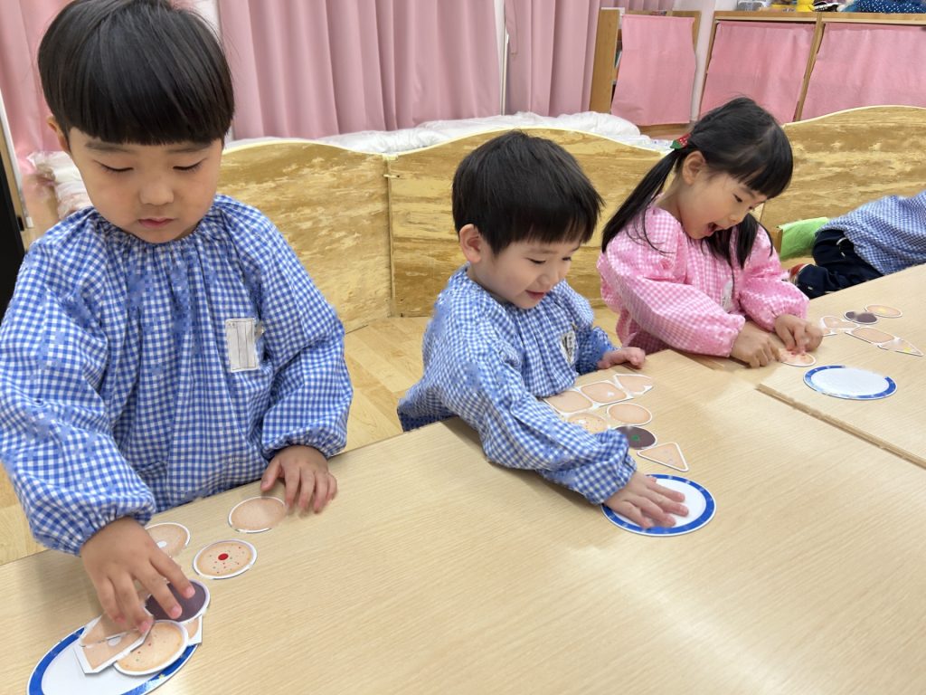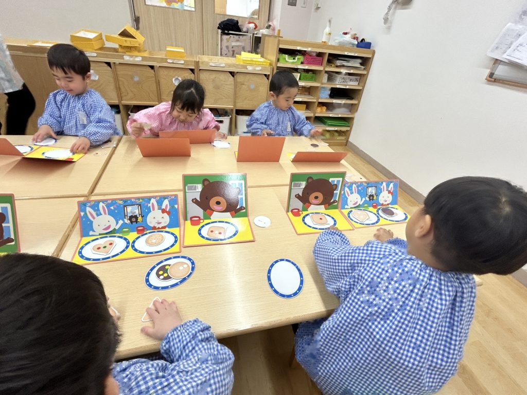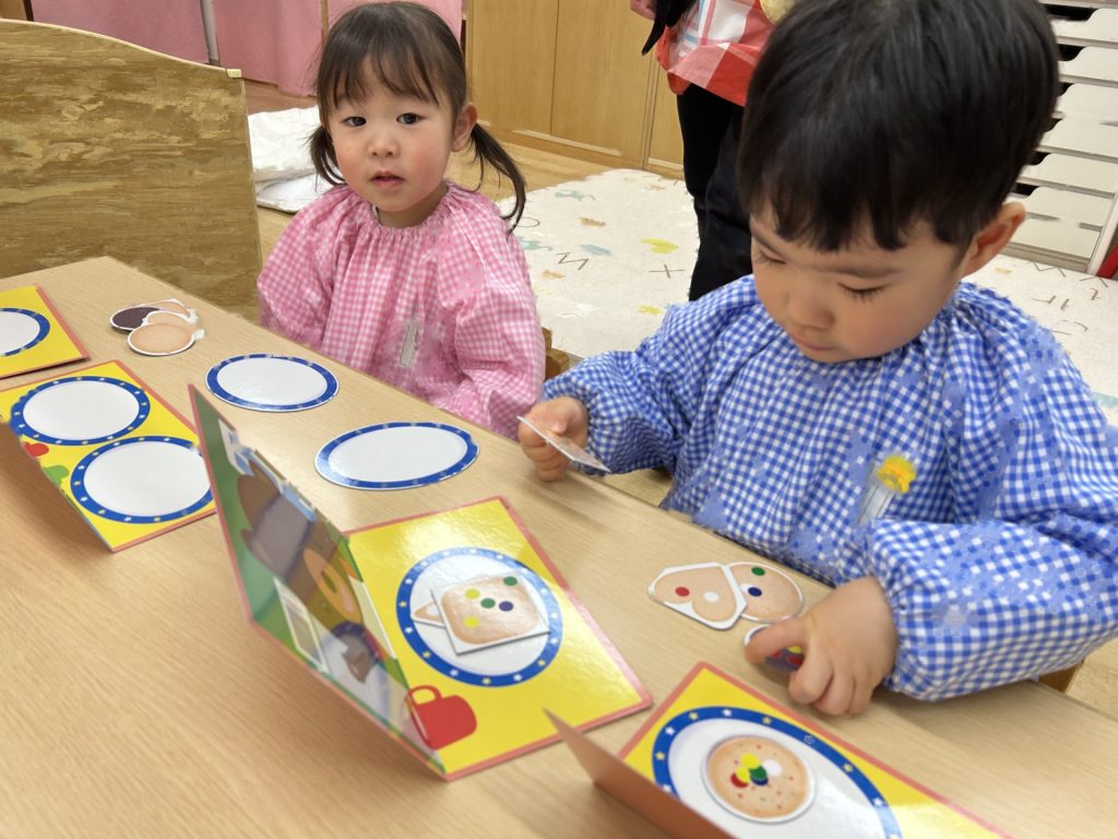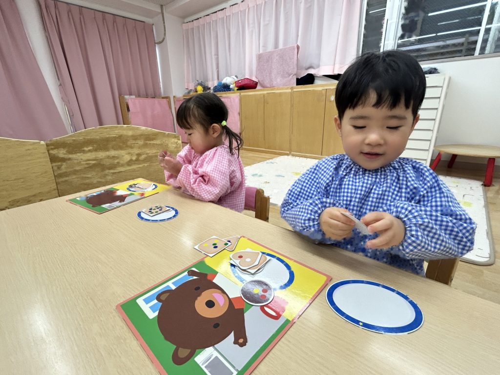 全部で8枚のクッキーがありましたが、バランスよく貼っている子、同じ色(味)のシールをまとめて貼る子など人それぞれでした🍪また貼り方も「アンパンマンみたい」といって顔のように貼ったり、1列に貼ったりと色々でした。