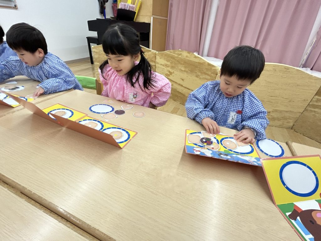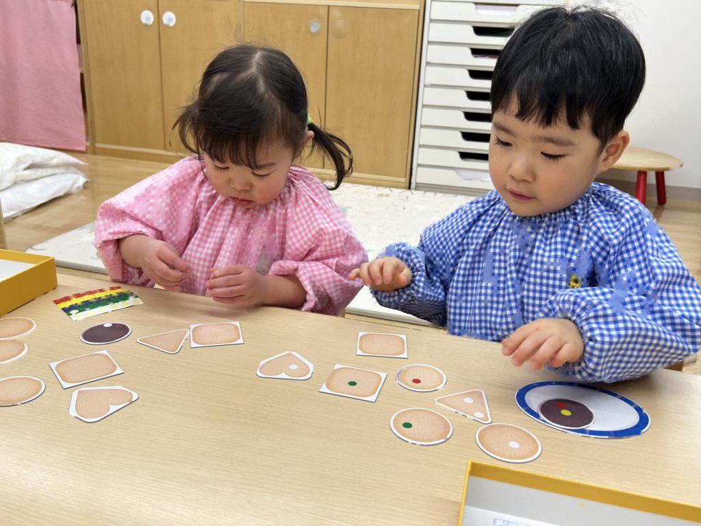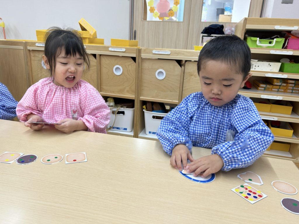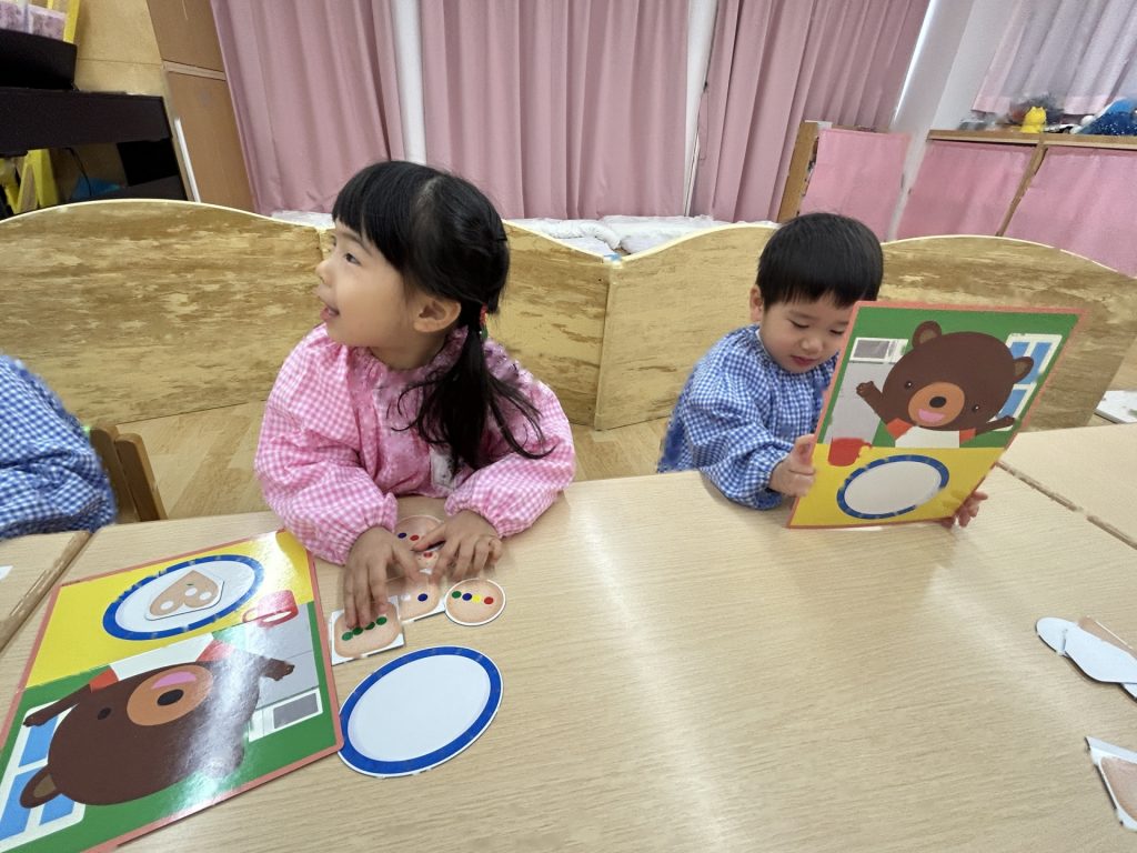 全部で8枚のクッキーがありましたが、バランスよく貼っている子、同じ色(味)のシールをまとめて貼る子など人それぞれでした🍪また貼り方も「アンパンマンみたい」といって顔のように貼ったり、1列に貼ったりと色々でした。