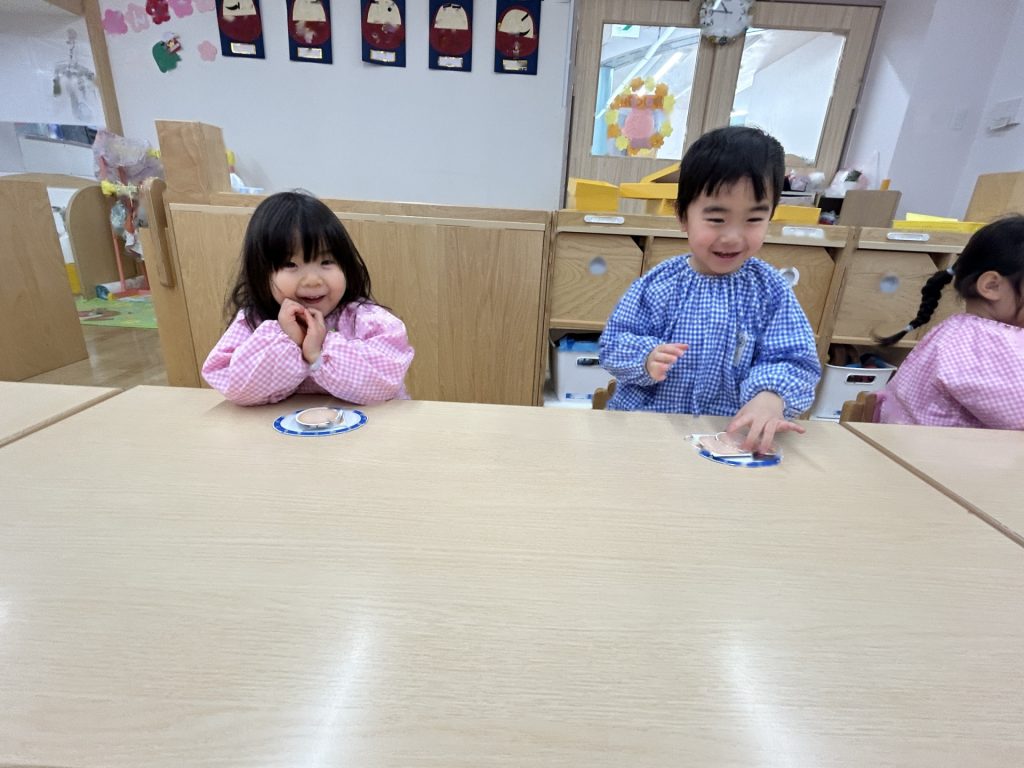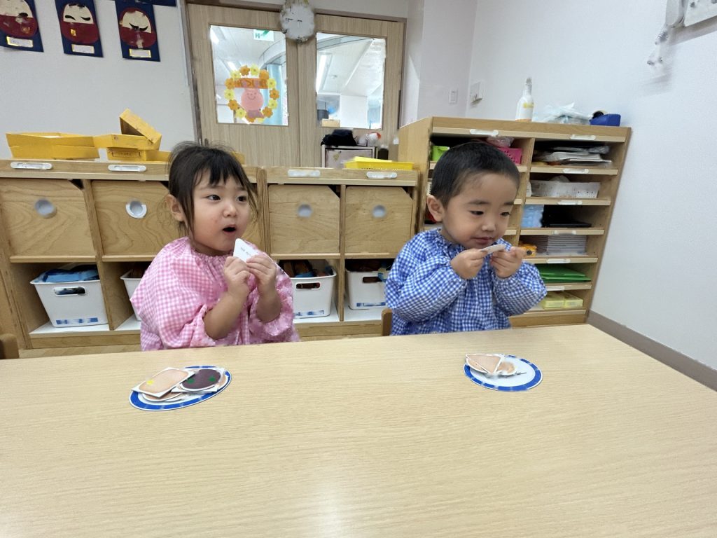 シールを貼り終えると自分で食べるまねをしたり、保育者に「どうぞ」と渡したり、「いらっしゃいませ」とおみせやさんごっこが始まったりとごっこあそびの世界を楽しんでいました😊