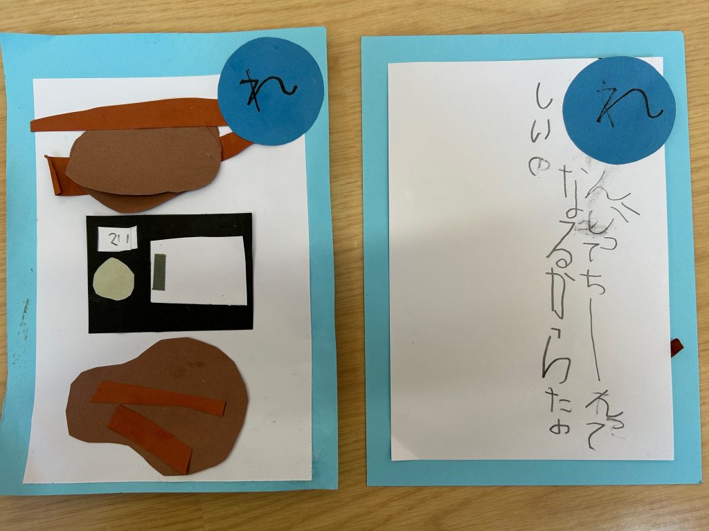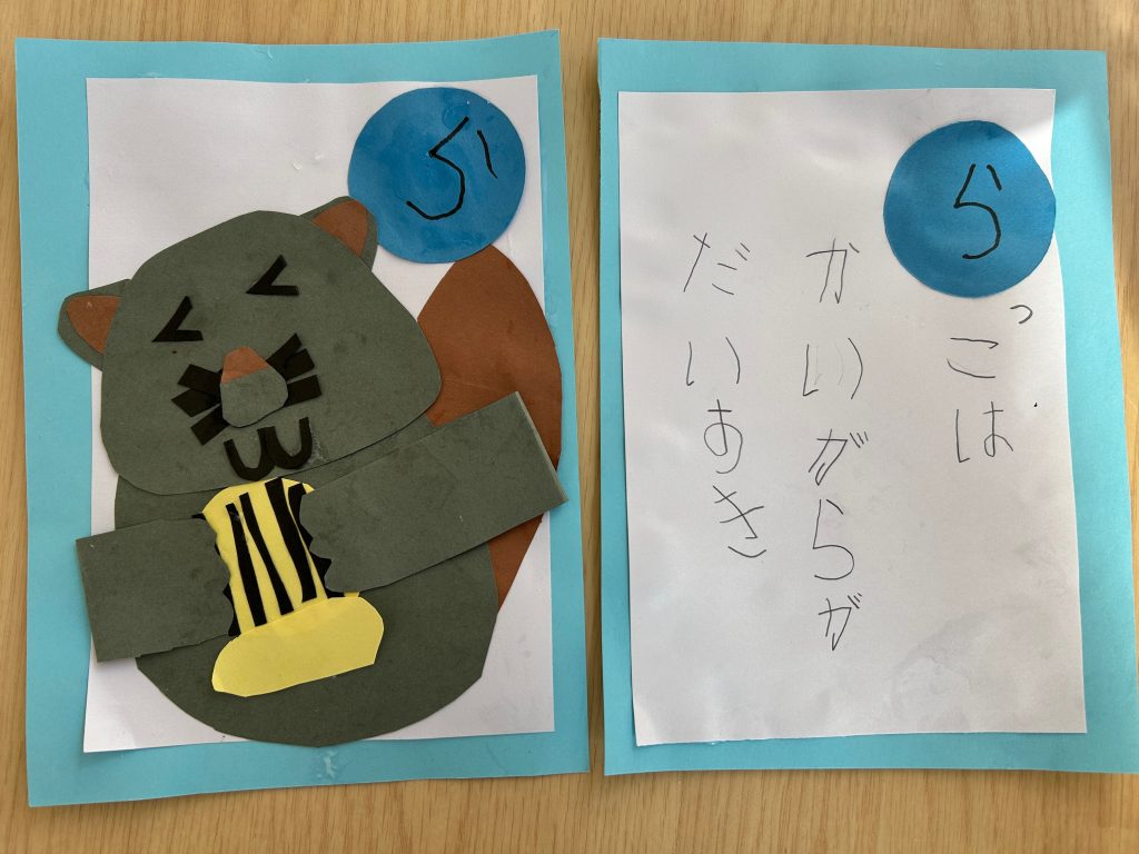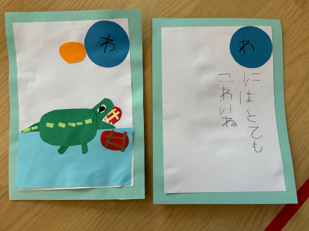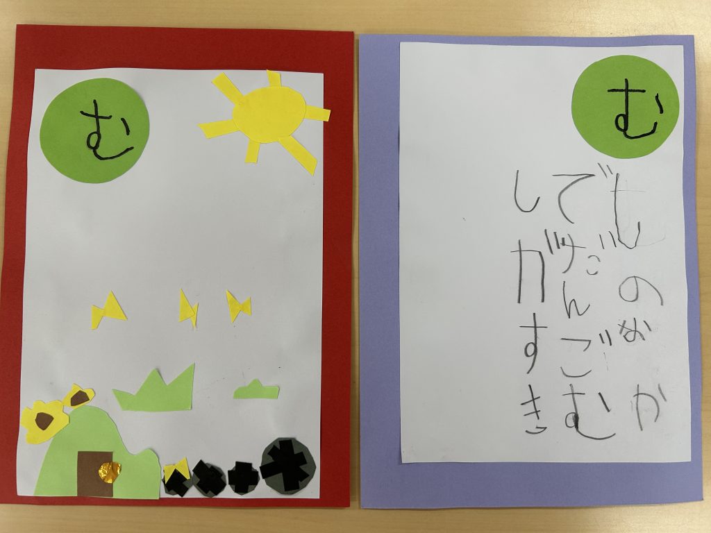 カルタ遊びをしてからカルタづくりに挑戦!!自分でいちから読み札を考えていきました。「〇〇は〇〇です」という文がおおかったのですが中には疑問文になっていたり、会話になっていたり、子どもらしい面白い文もたくさんありました。