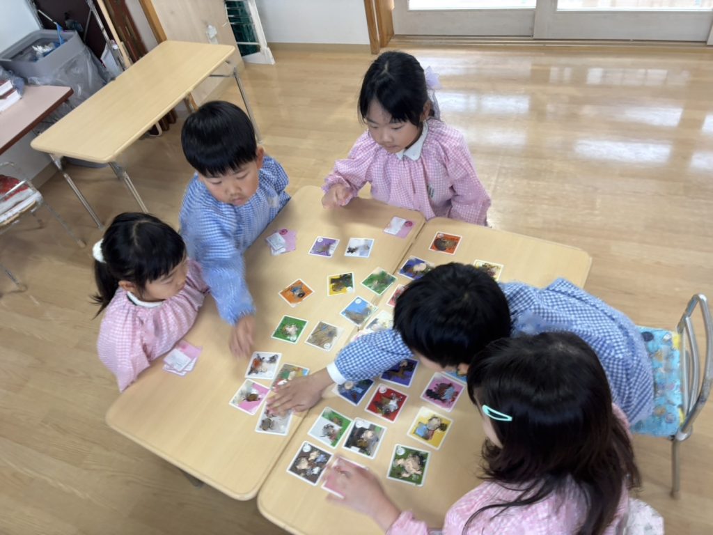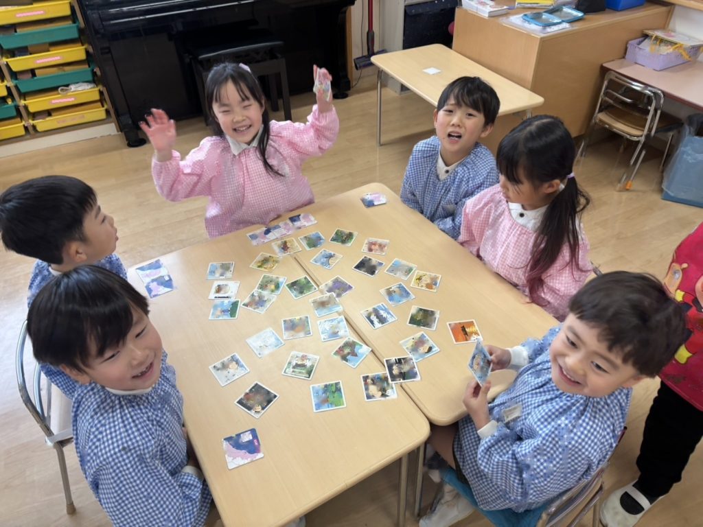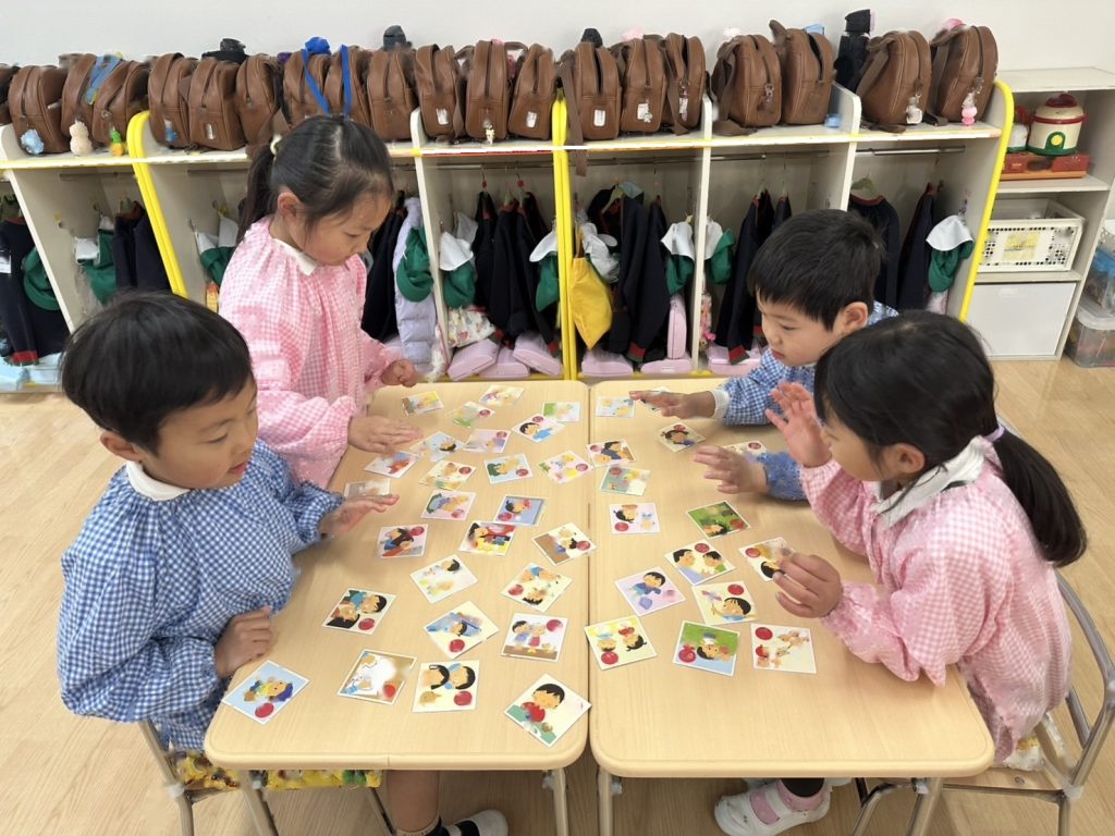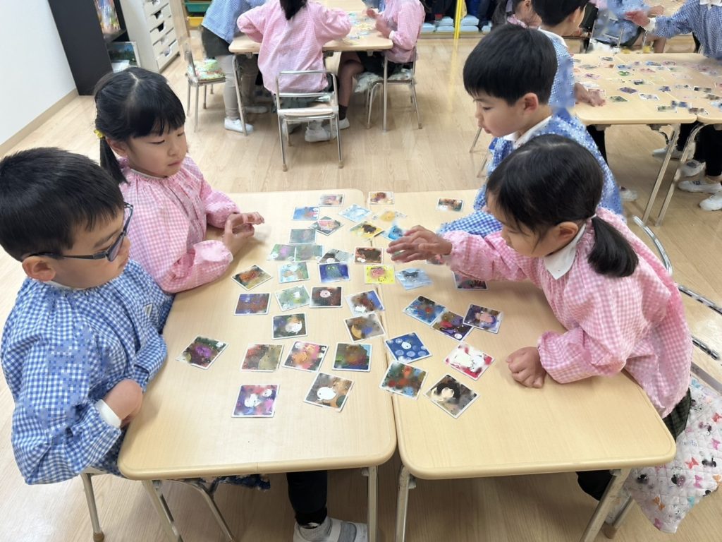 カルタの種類が色々なので絵札にちなんだ読み札ではなく、「アイスクリームのあ」など文字を伝えて取っていきました。得意な子はどんどんとっていきますが、なかなかとれず悔しくてないてしまうおともだちもいました。多い子は一人で30枚ちかくとっていました!!とても白熱した戦いになっていましたよ。