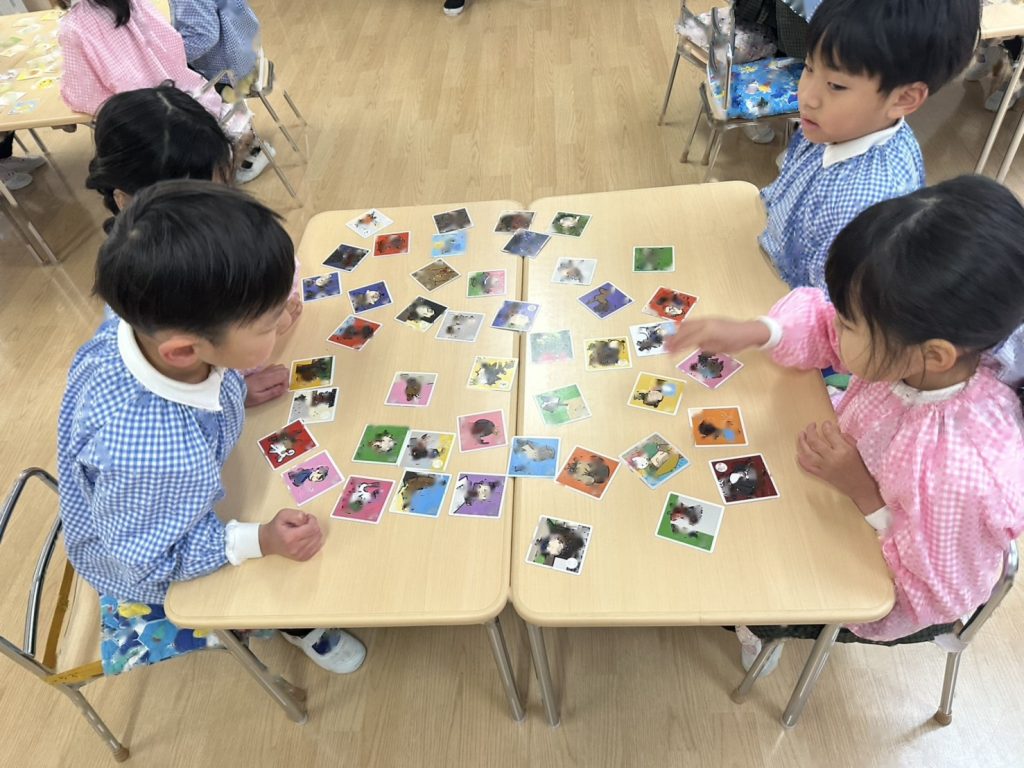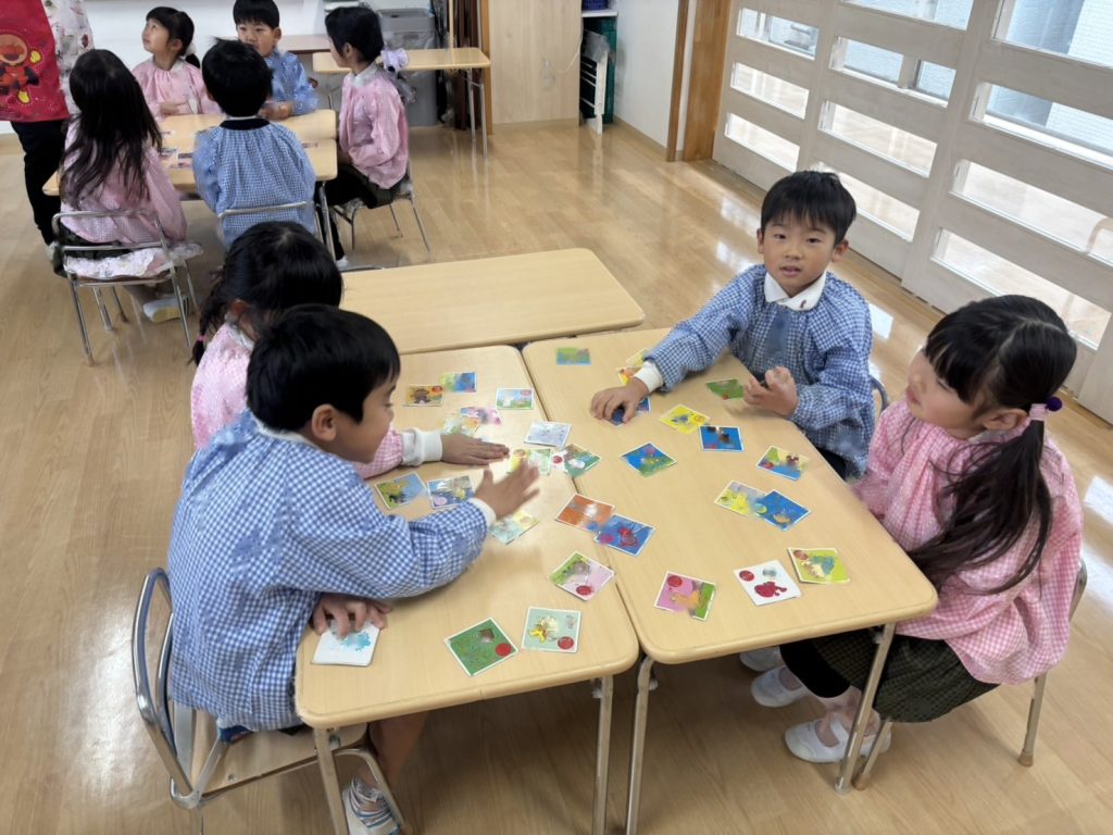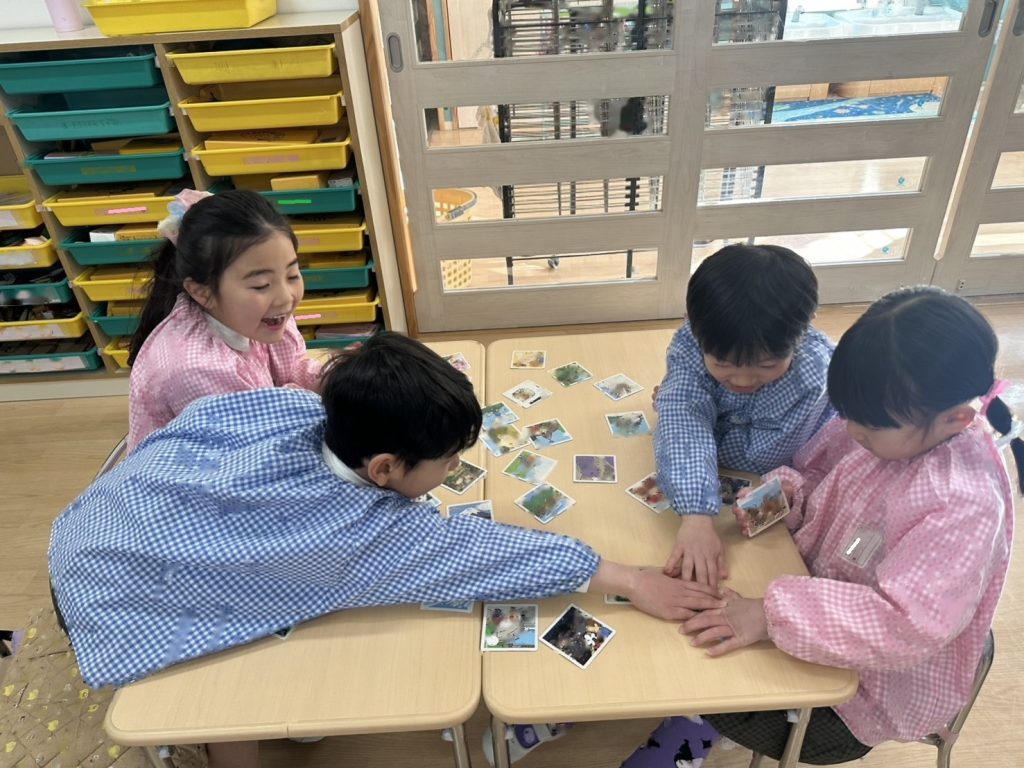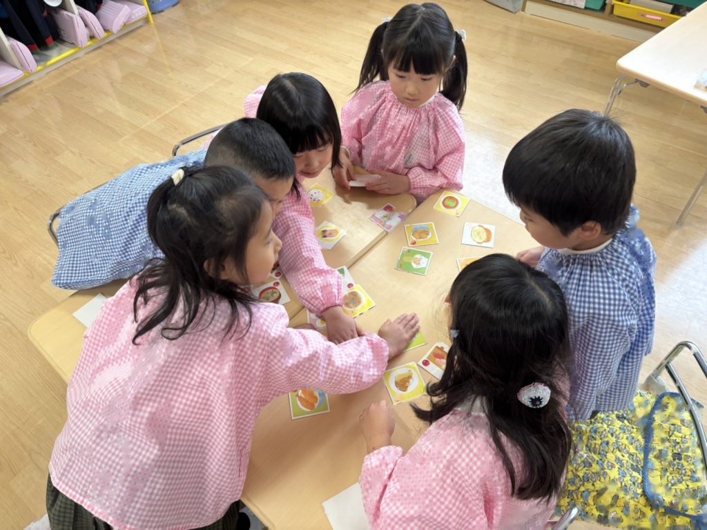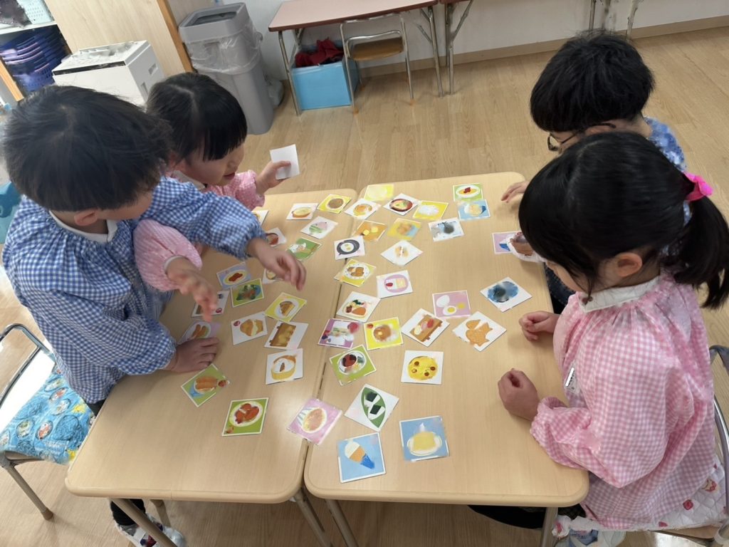 カルタの種類が色々なので絵札にちなんだ読み札ではなく、「アイスクリームのあ」など文字を伝えて取っていきました。得意な子はどんどんとっていきますが、なかなかとれず悔しくてないてしまうおともだちもいました。多い子は一人で30枚ちかくとっていました!!とても白熱した戦いになっていましたよ。