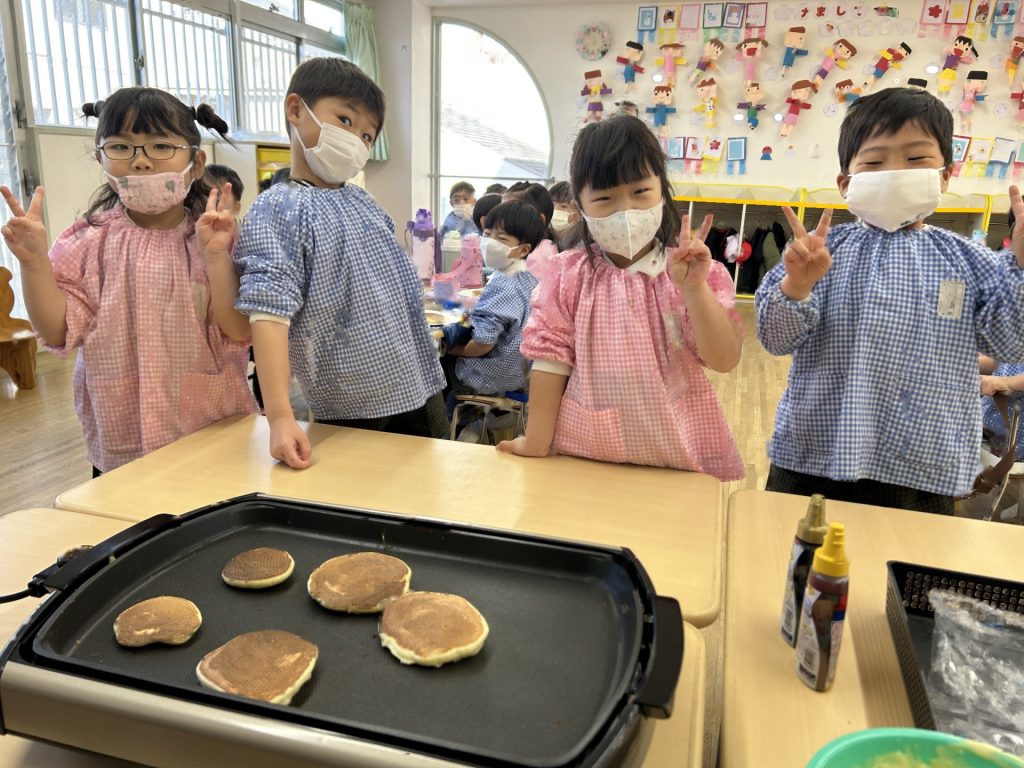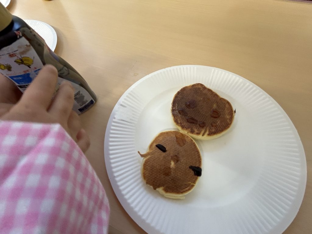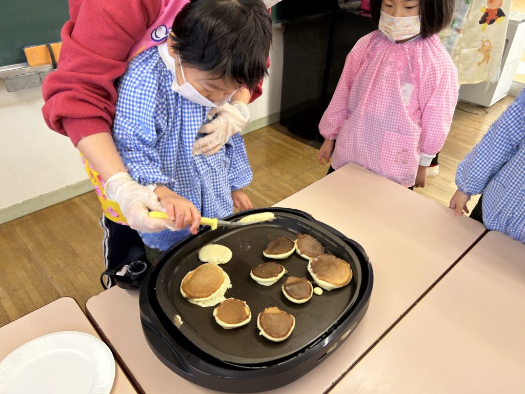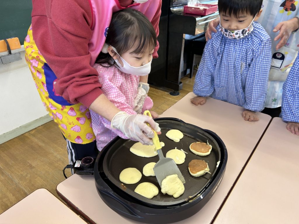 ひとりスプーン2枚分のホットケーキを保育者と一緒にひろげ、焼いていくといい香りが・・・