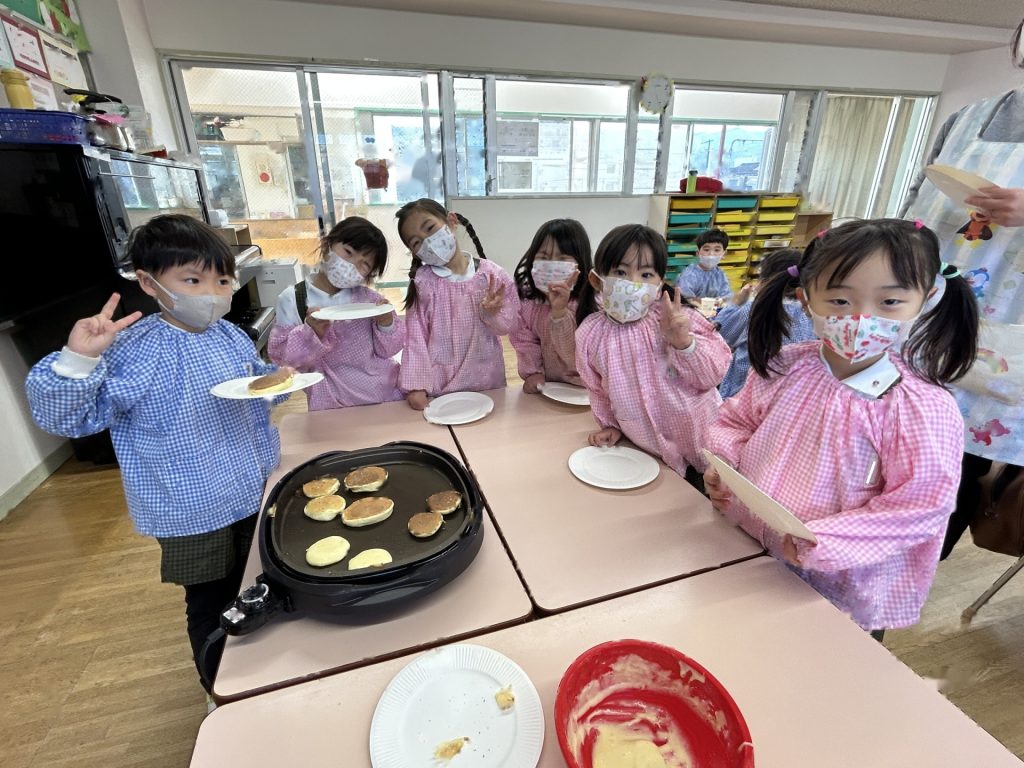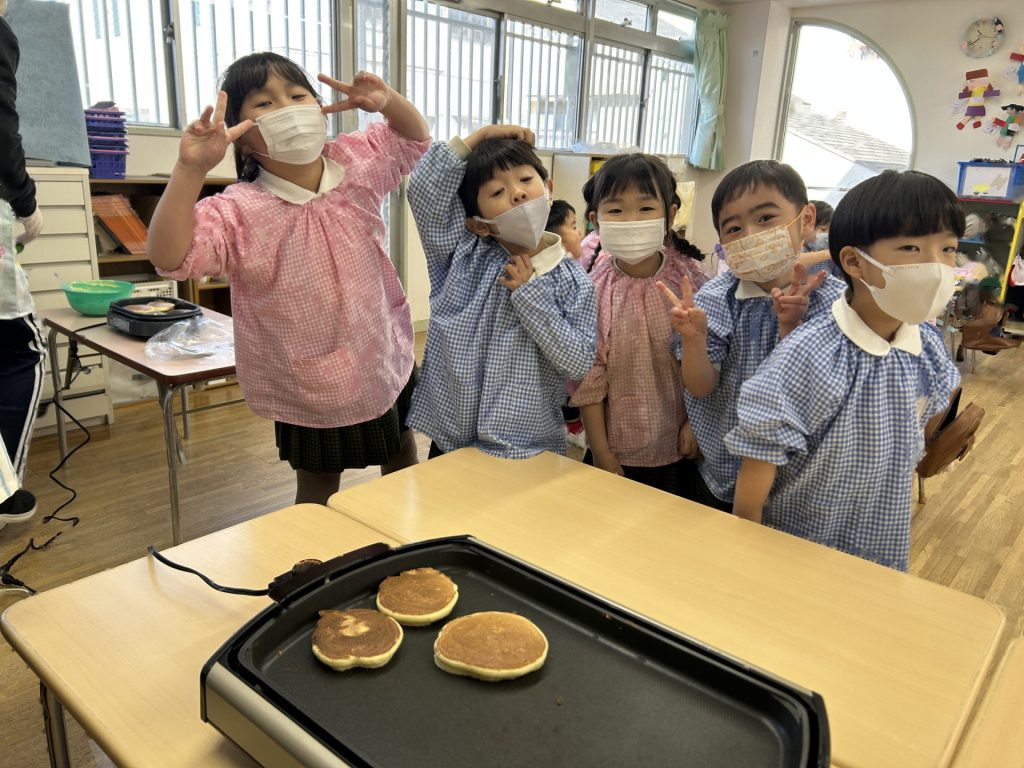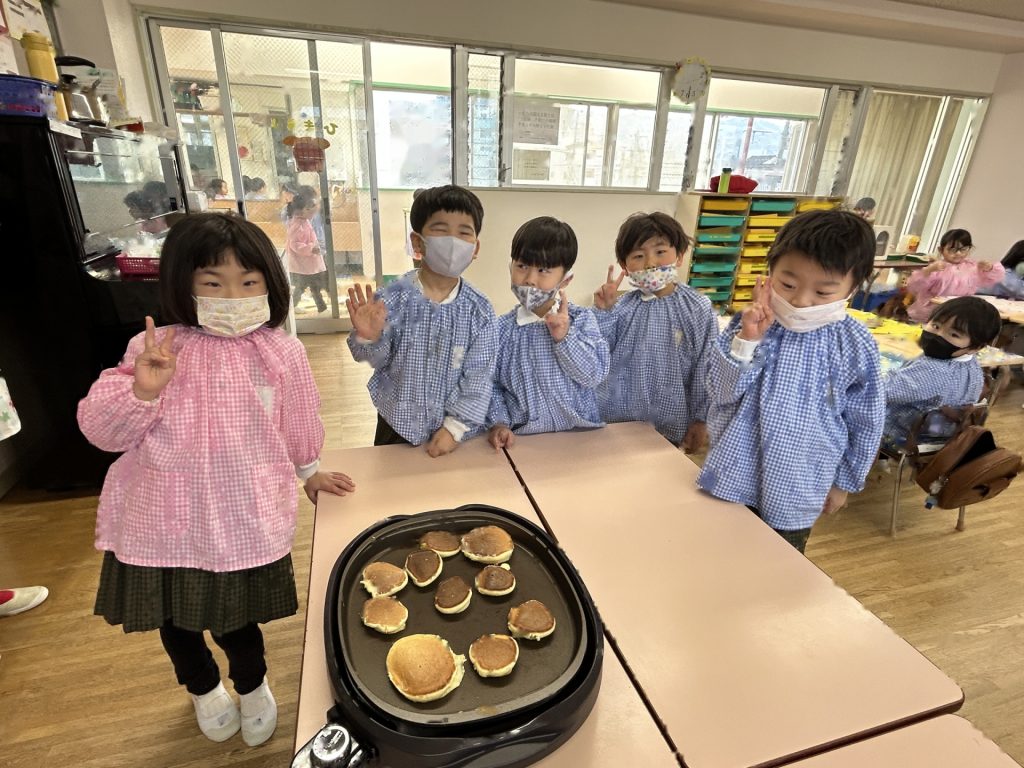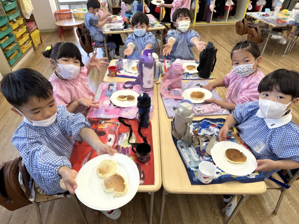 ひとりスプーン2枚分のホットケーキを保育者と一緒にひろげ、焼いていくといい香りが・・・