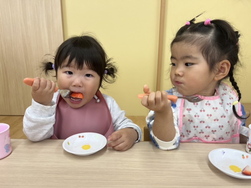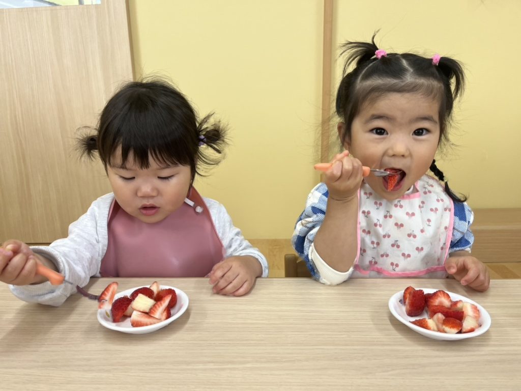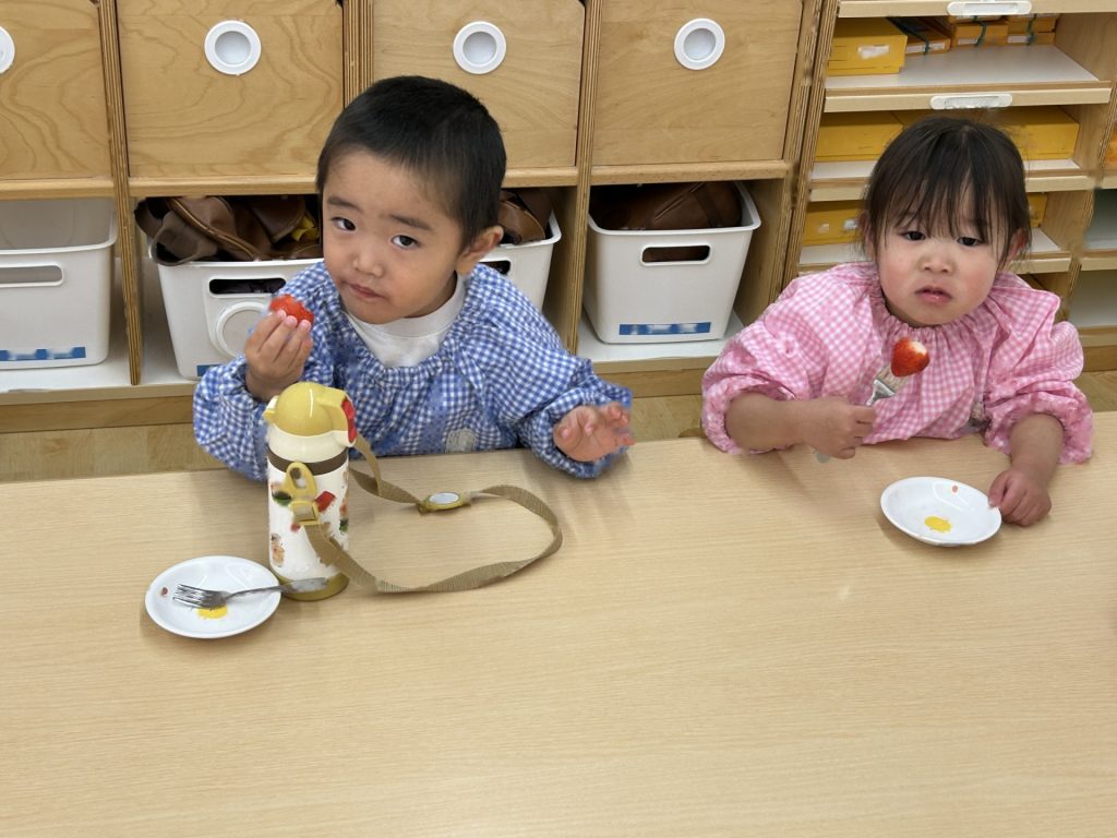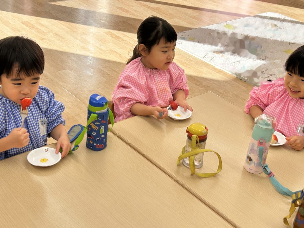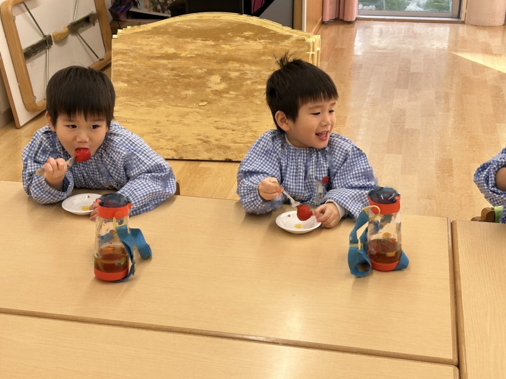 今日の朝おやつはきのうみんなで買ってきたイチゴ🍓