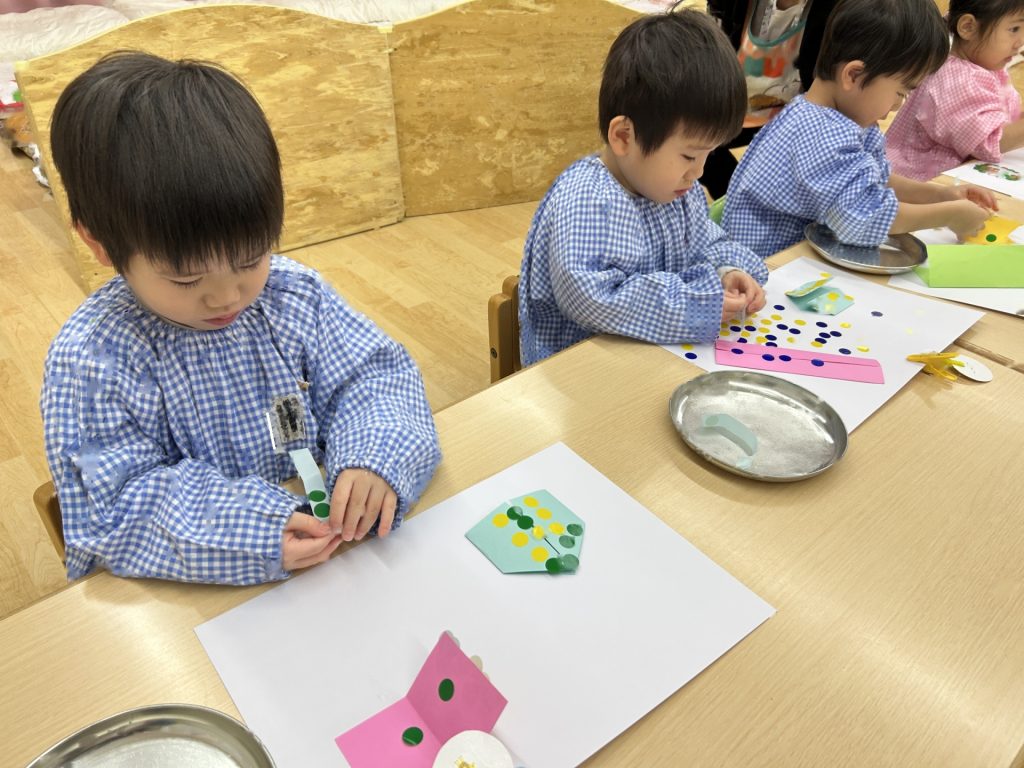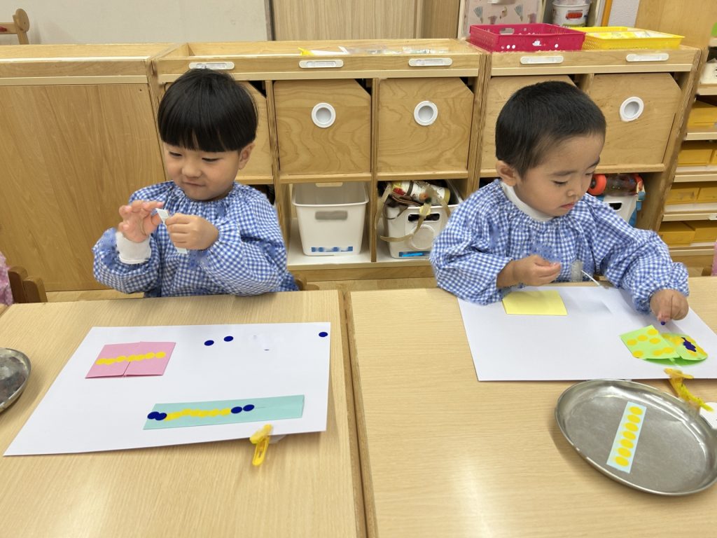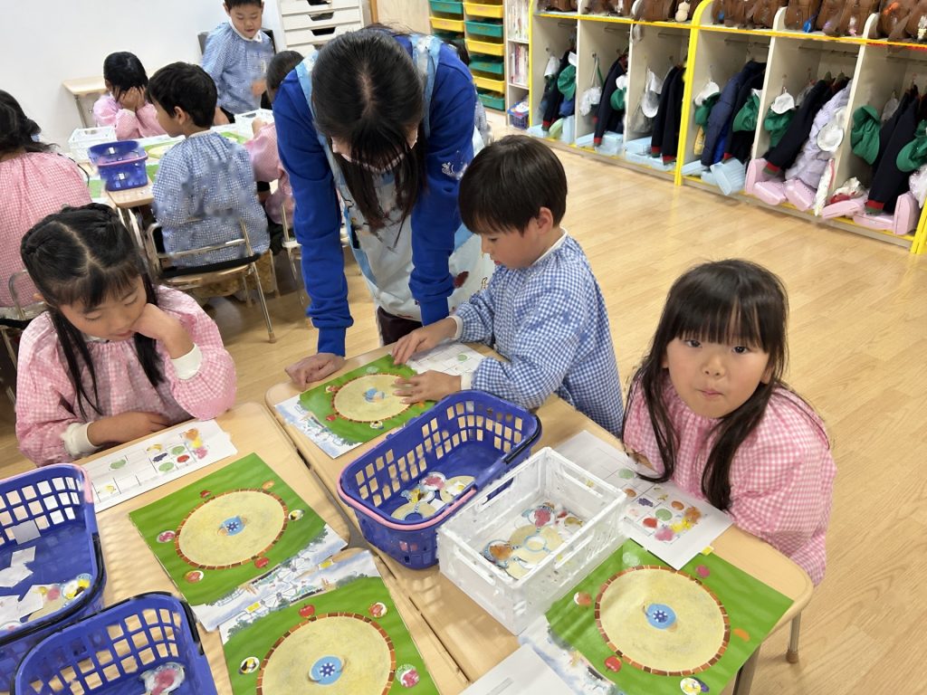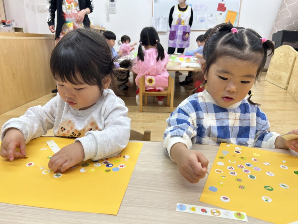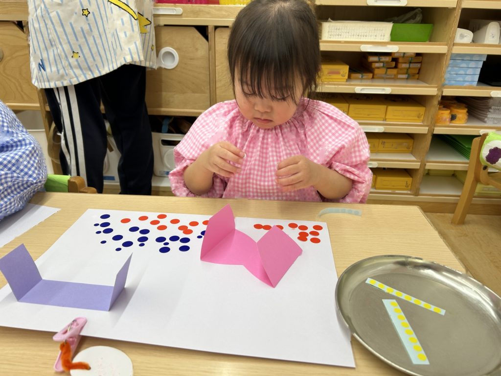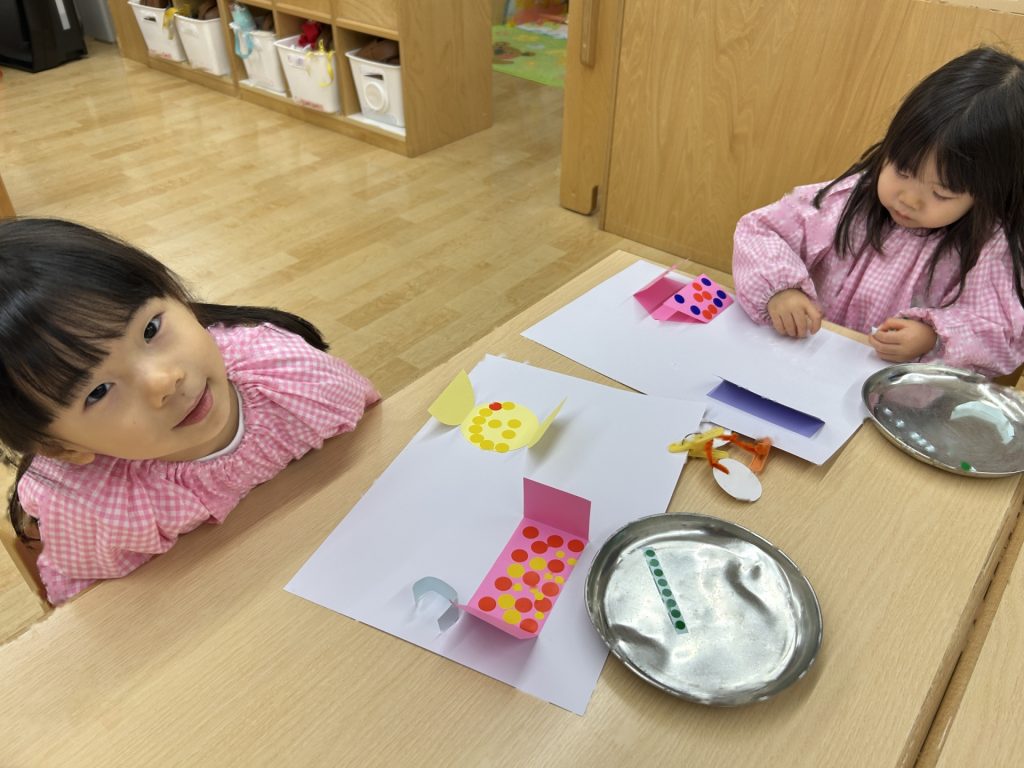 ゆりぐみさんは保育者が画用紙に仕掛けを作り、シールはいろんな色の丸シール大小を用意し貼っていきました。仕掛けを広げて中に貼る子、仕掛けを閉じて開かないようにシールで止め、「オオカミがでられないようにしめるねん」「ここはママのおうち」とイメージしながら取り組む子、仕掛け関係なく貼っている子、それぞれの個性が出て面白い作品ができていました。