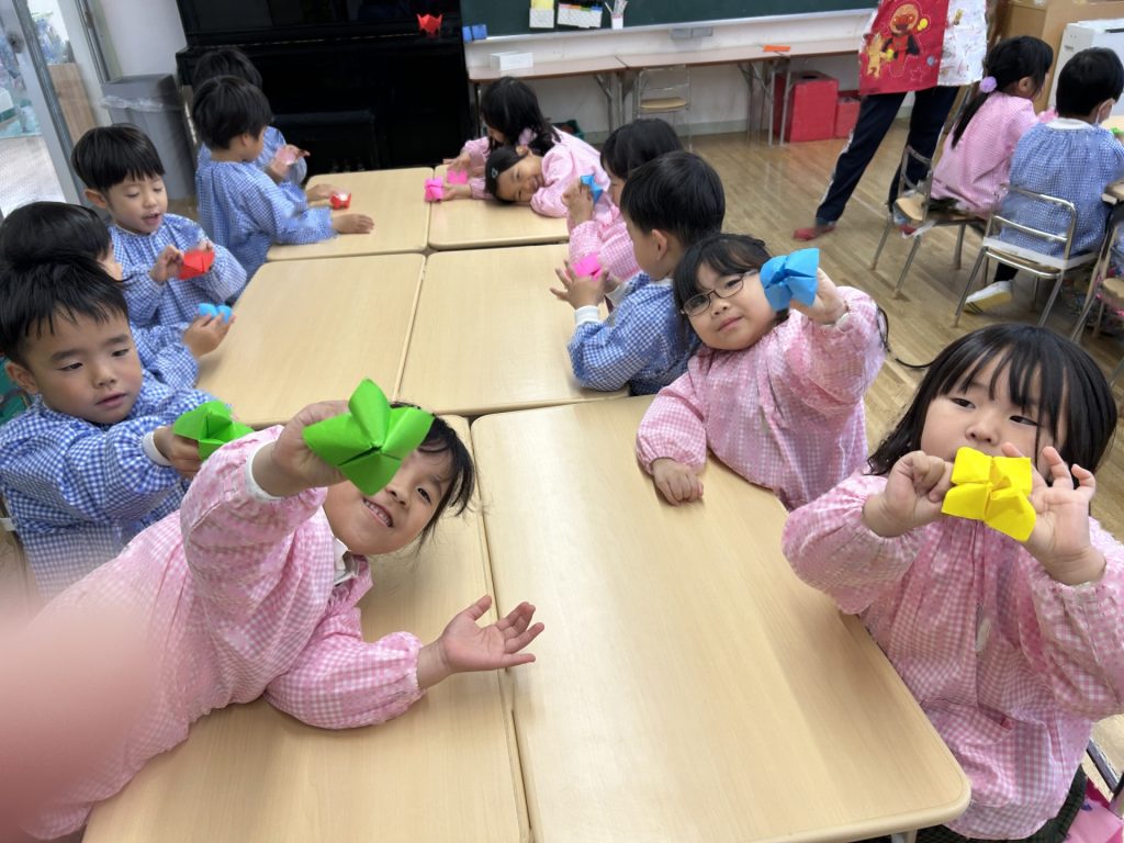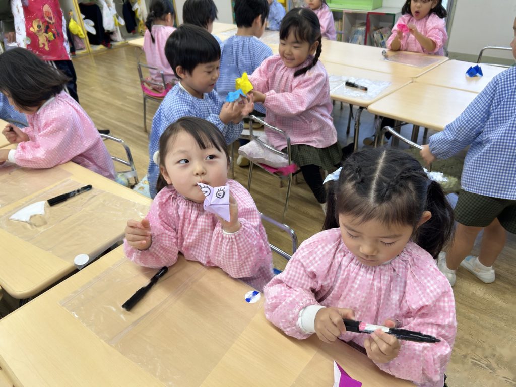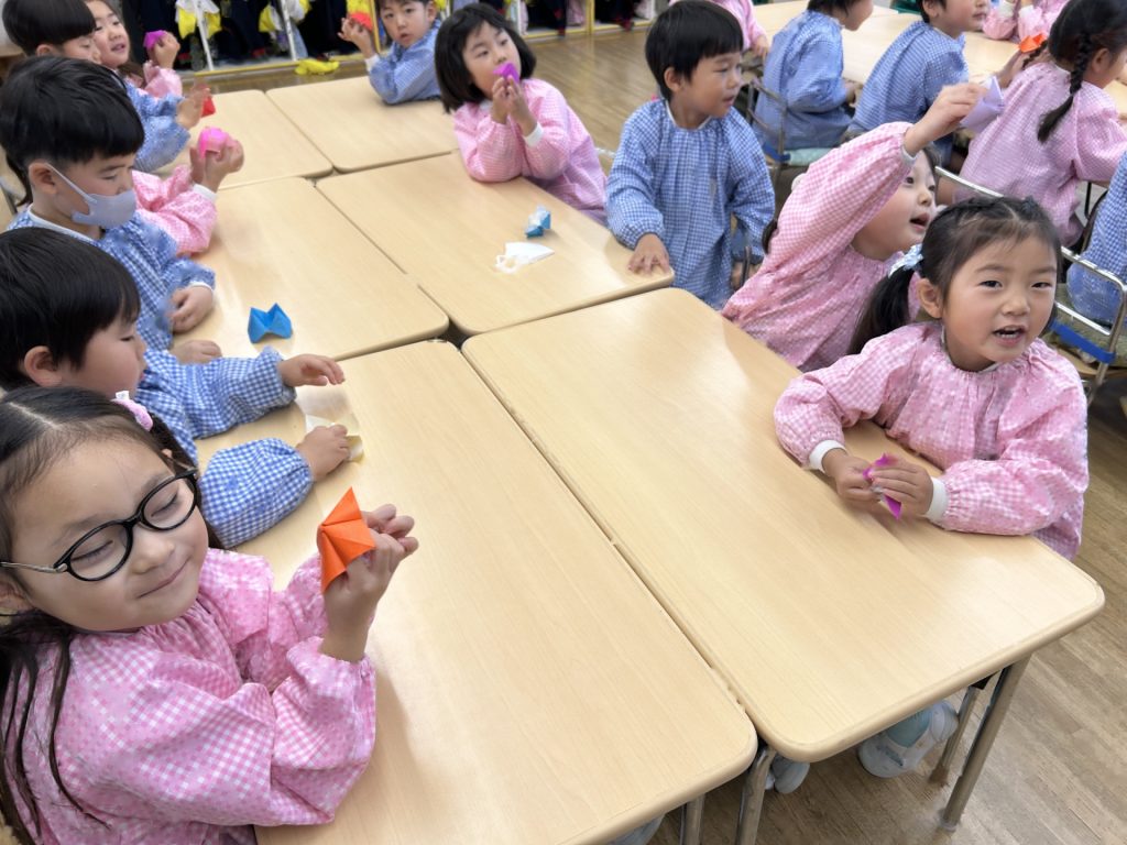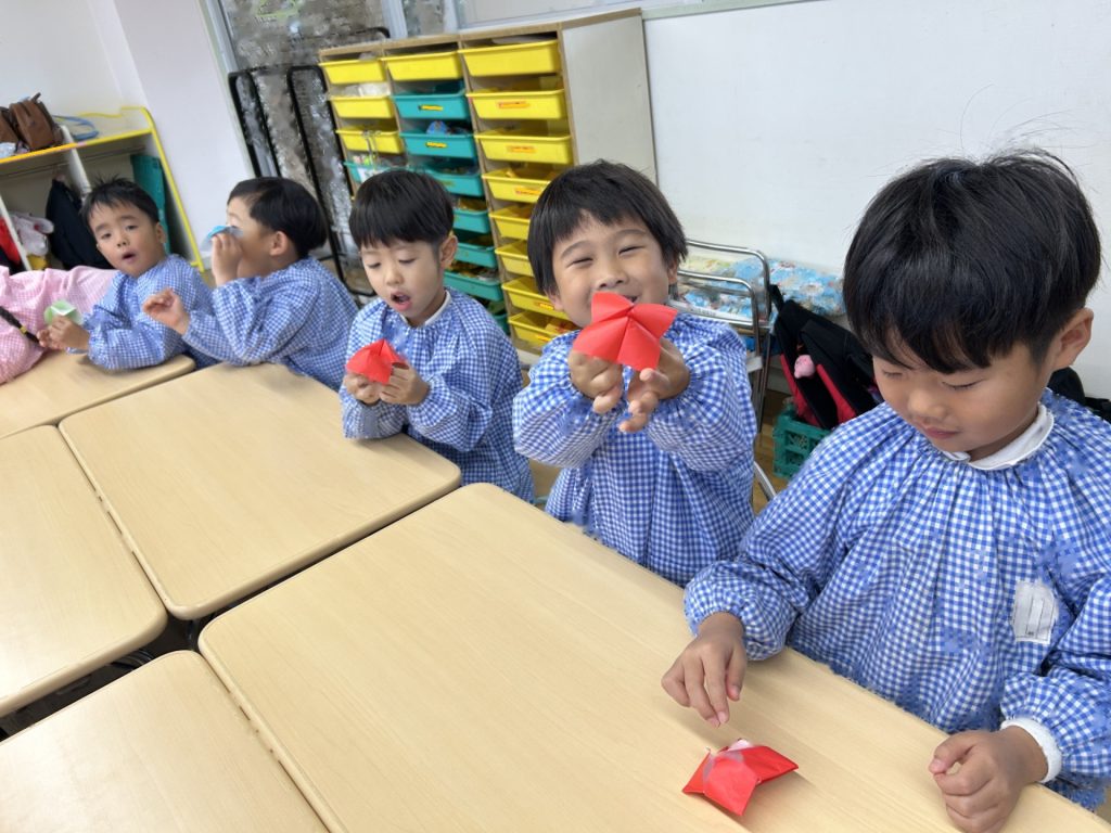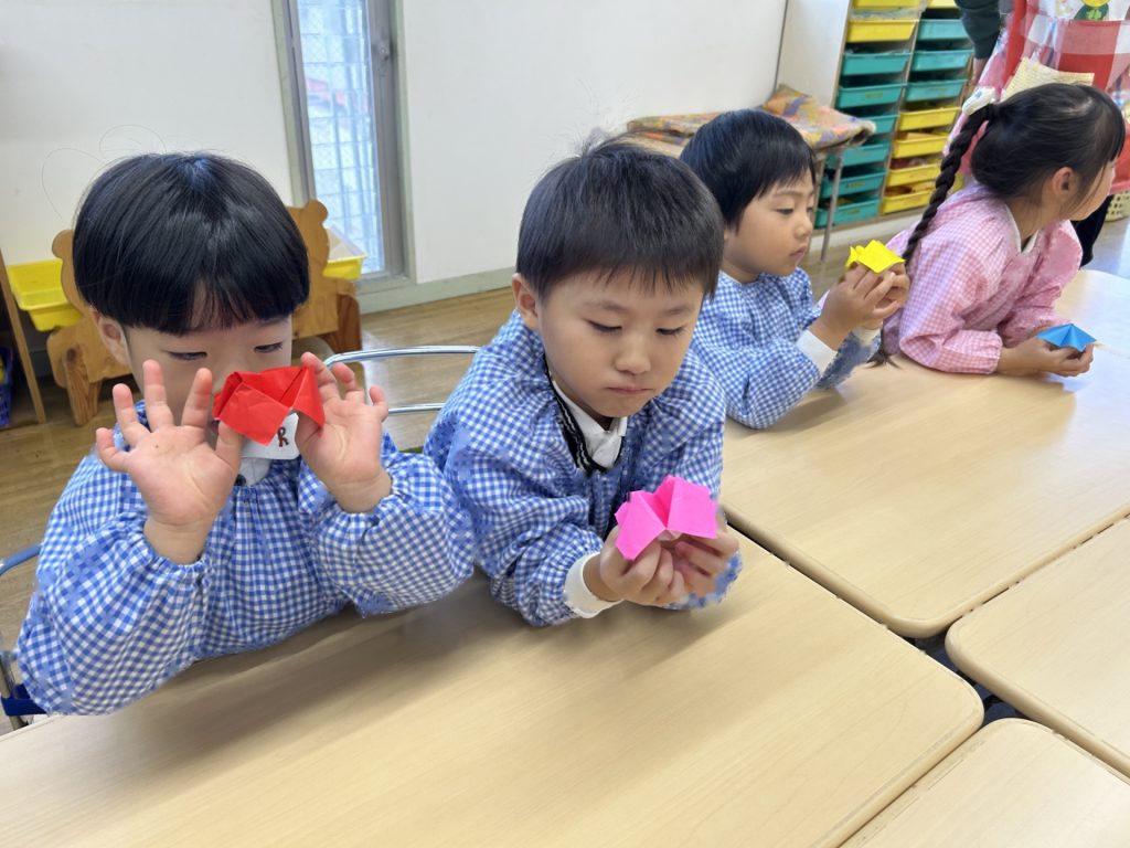折り紙は3歳児クラスの時から取り組んできているので上手に折れるようになってきています。最後のひっくり返す部分は少し難しそうにしていましたが、パクパクのできあがり!