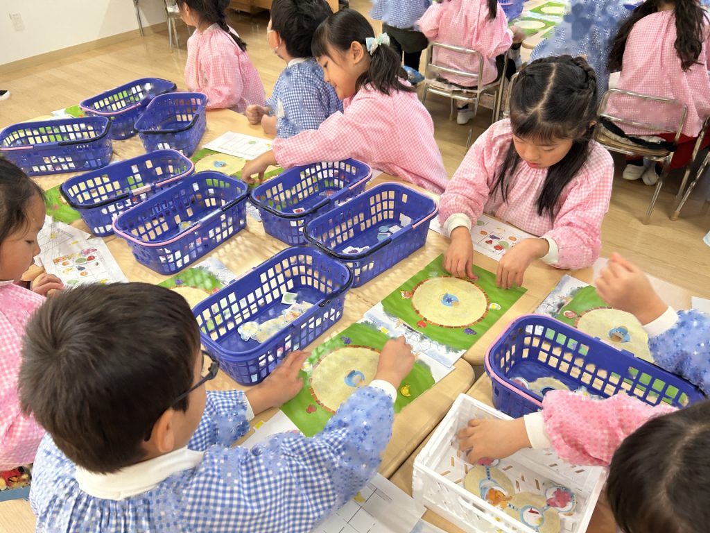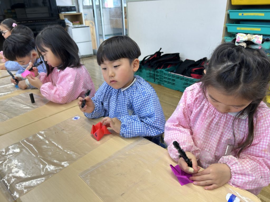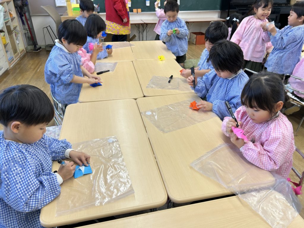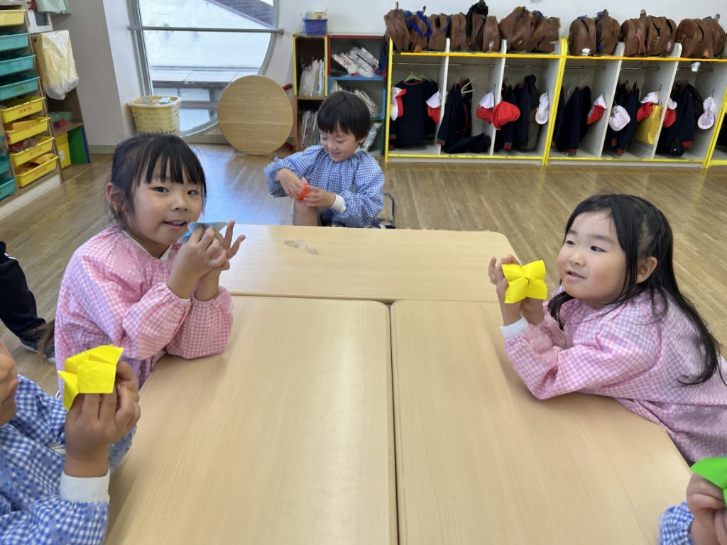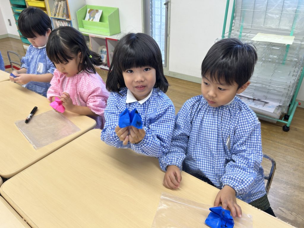 折り紙は3歳児クラスの時から取り組んできているので上手に折れるようになってきています。最後のひっくり返す部分は少し難しそうにしていましたが、パクパクのできあがり!