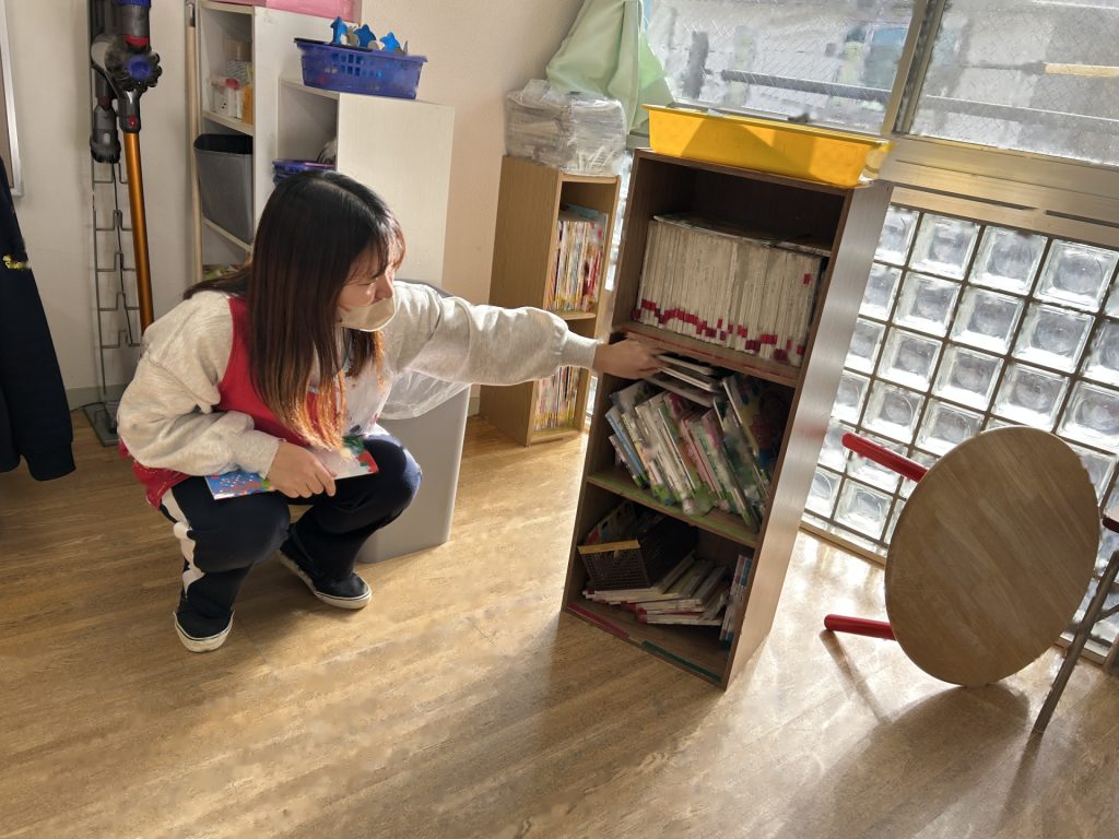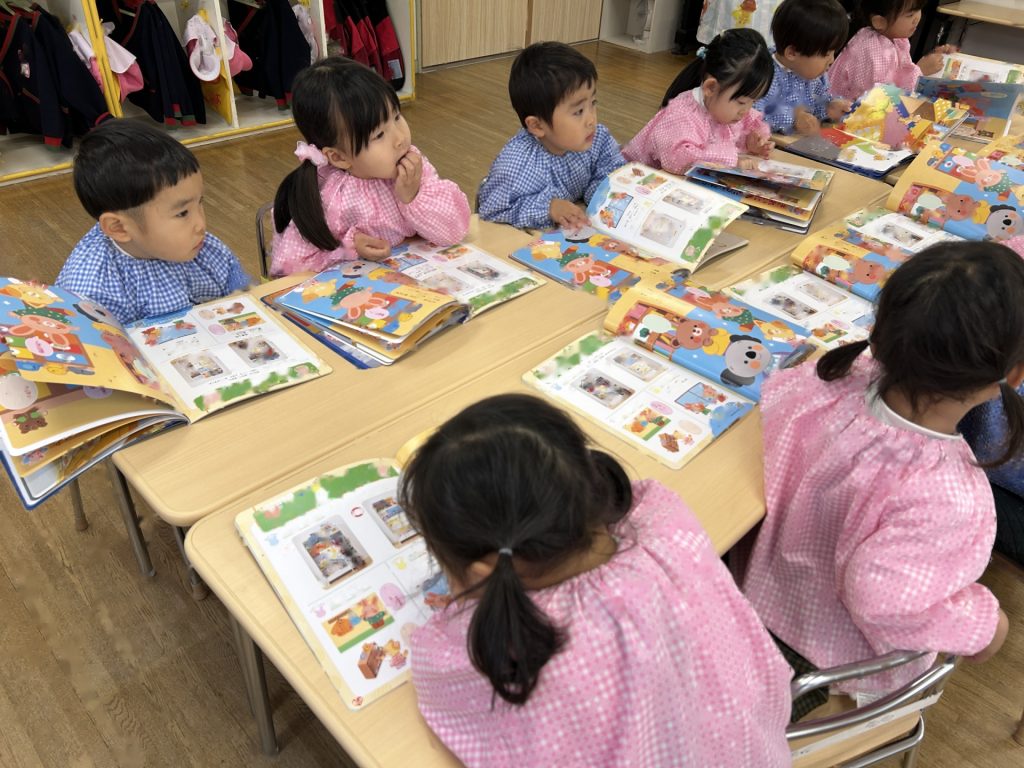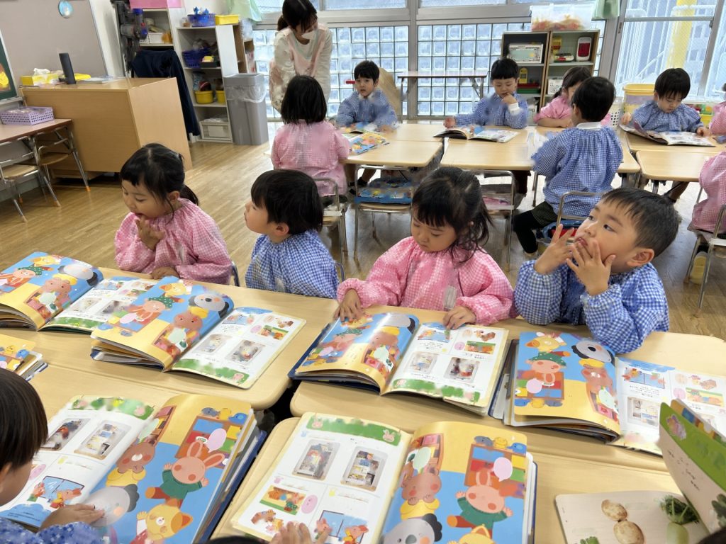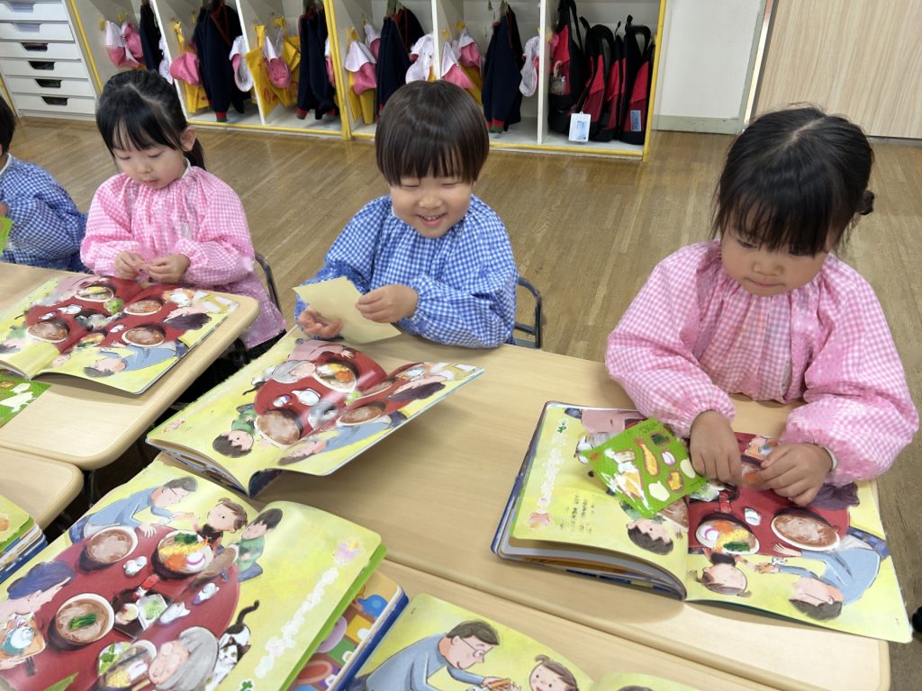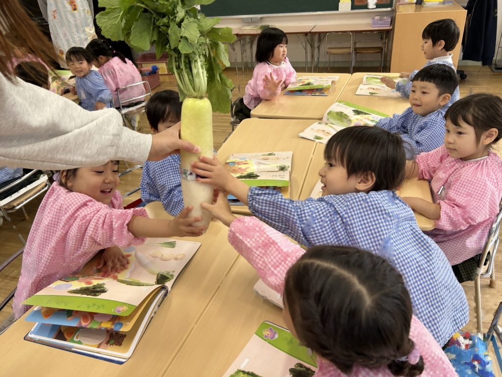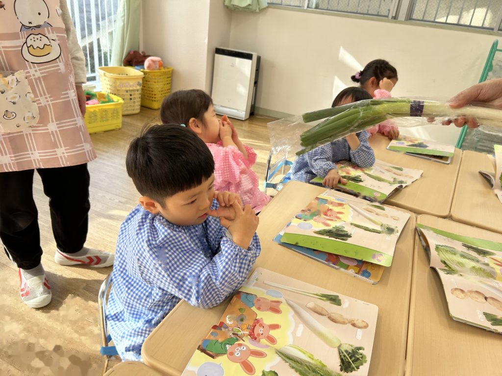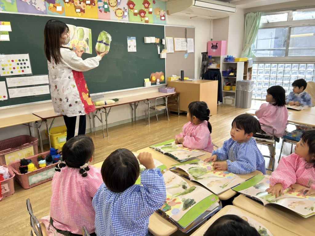 大掃除のページではクラスの本棚を見せて絵本と照らし合わせ、お片付けについてみんなで考えました。また、冬野菜のページがあり、昨日ゆりぐみさんがお買い物してきた野菜を借りて本物の野菜も見せ、触ったりにおいをかいだりしながらすすめました。