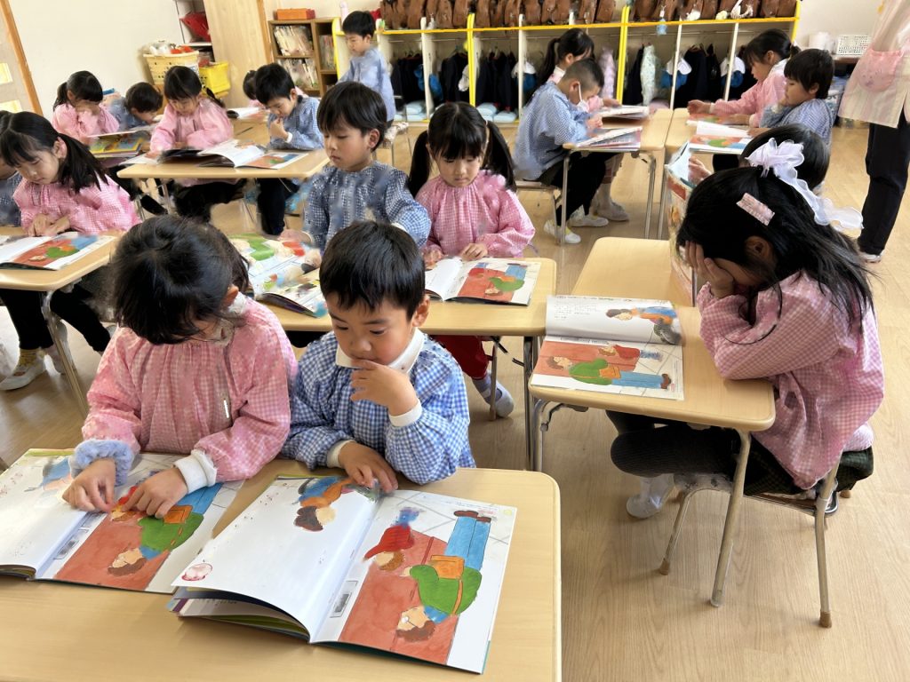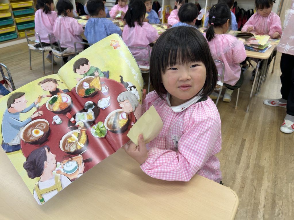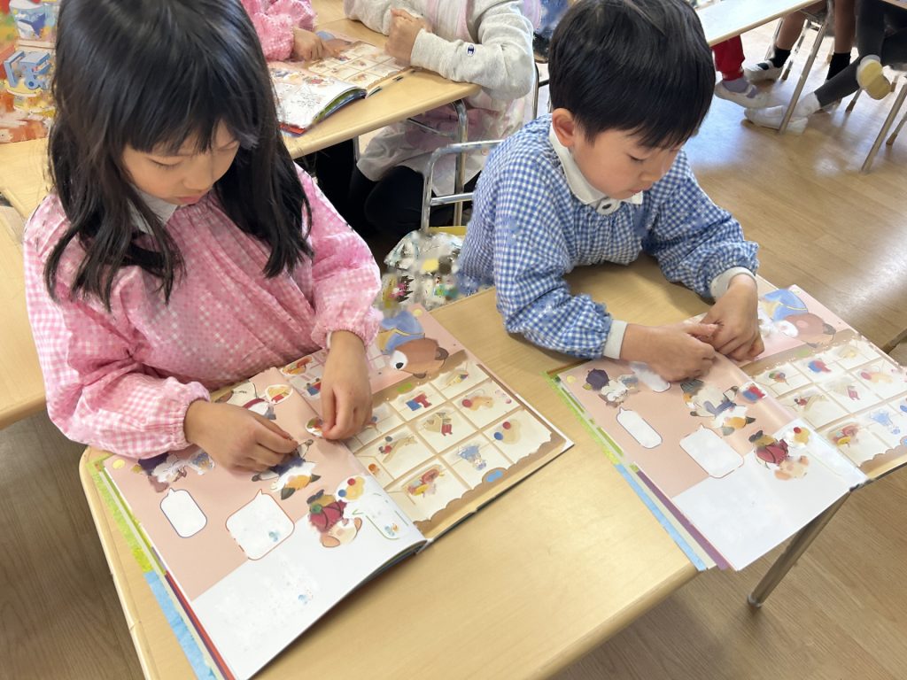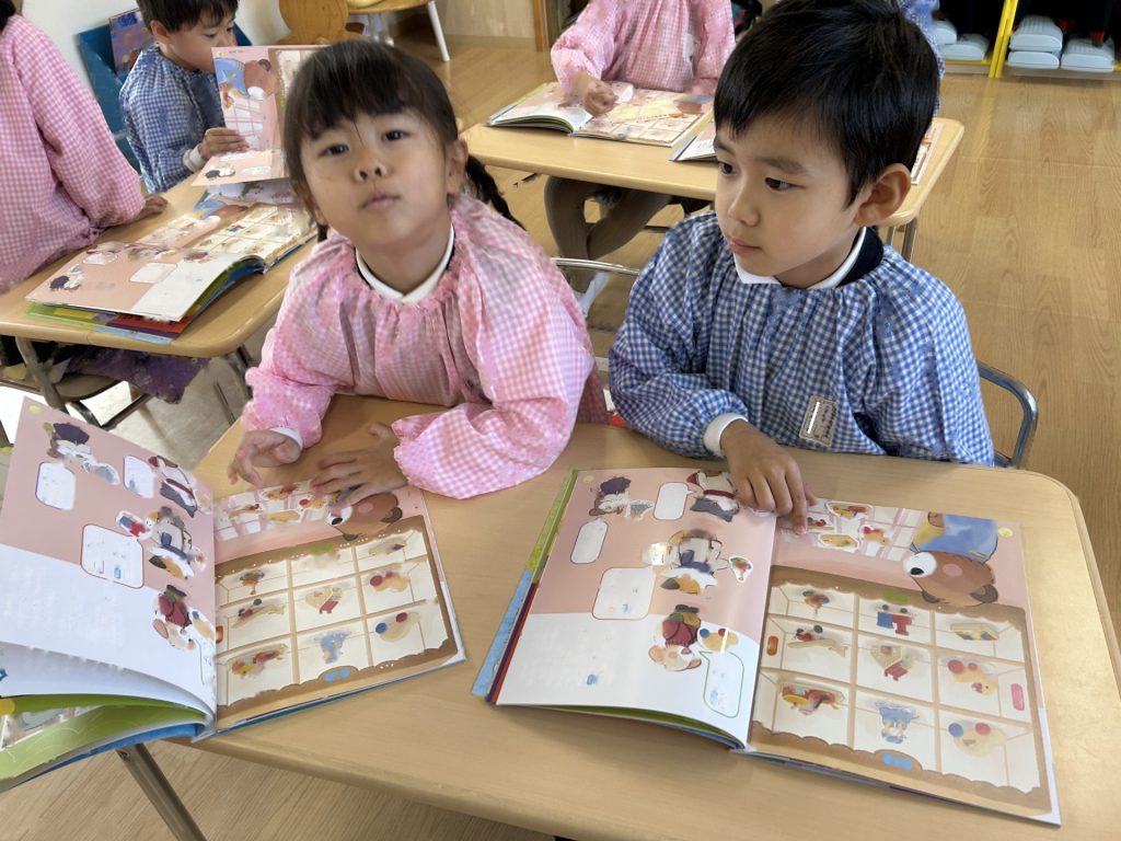 5歳児さんの月間絵本は楽しみながら考えるページも取り入れられています。