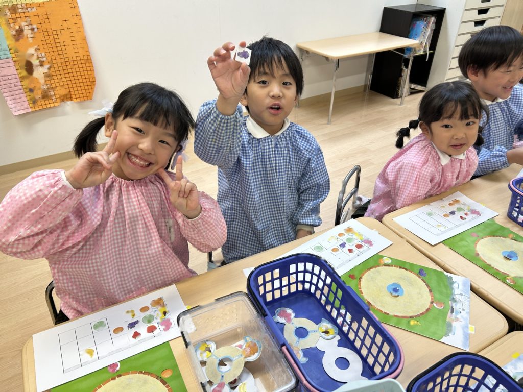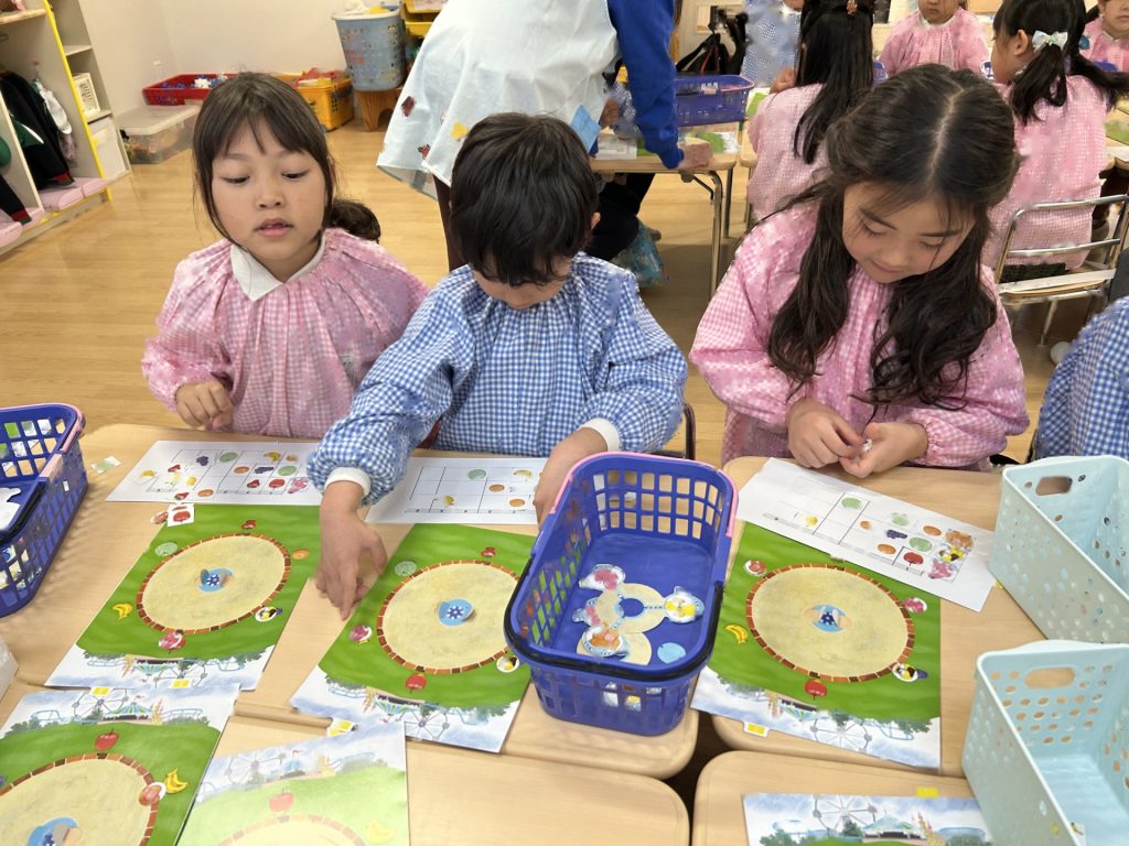コーヒーカップに乗っている犬さんがバナナのところで止まった時、うさぎさんはどこになるかな?ということを考えていきました。推理して考えた後、実際に動かして確かめていきました。