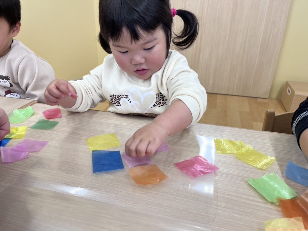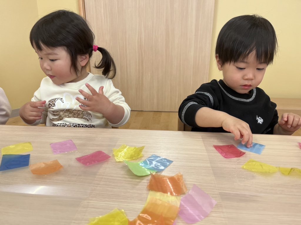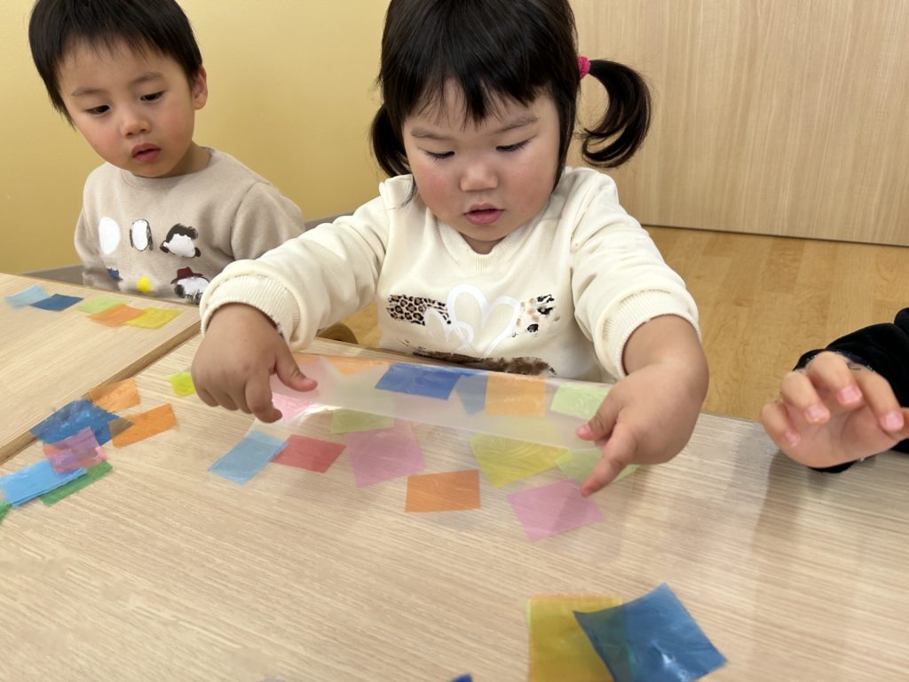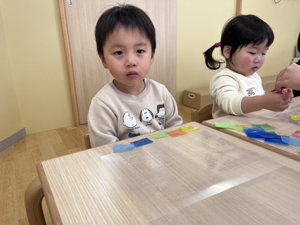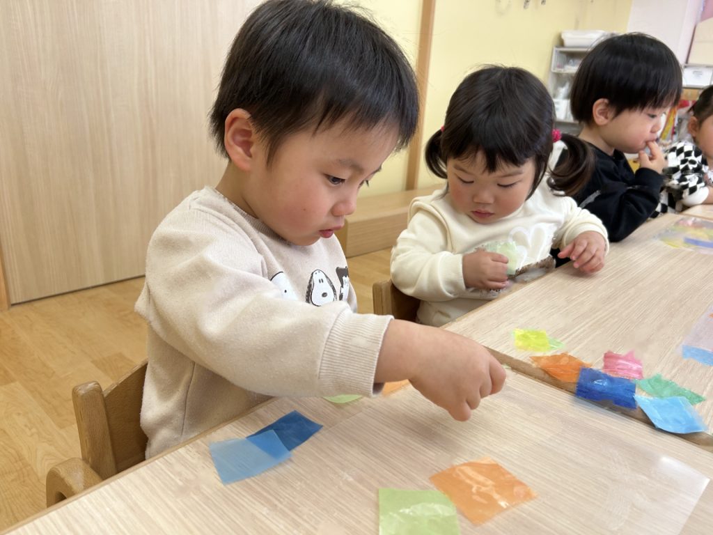 クリアファイルを広げ、保育者がのりを塗り、そこに子どもが小さく切っているスズランテープをのせていきました。色の名前を言いながらみんな集中して取り組んでいました。