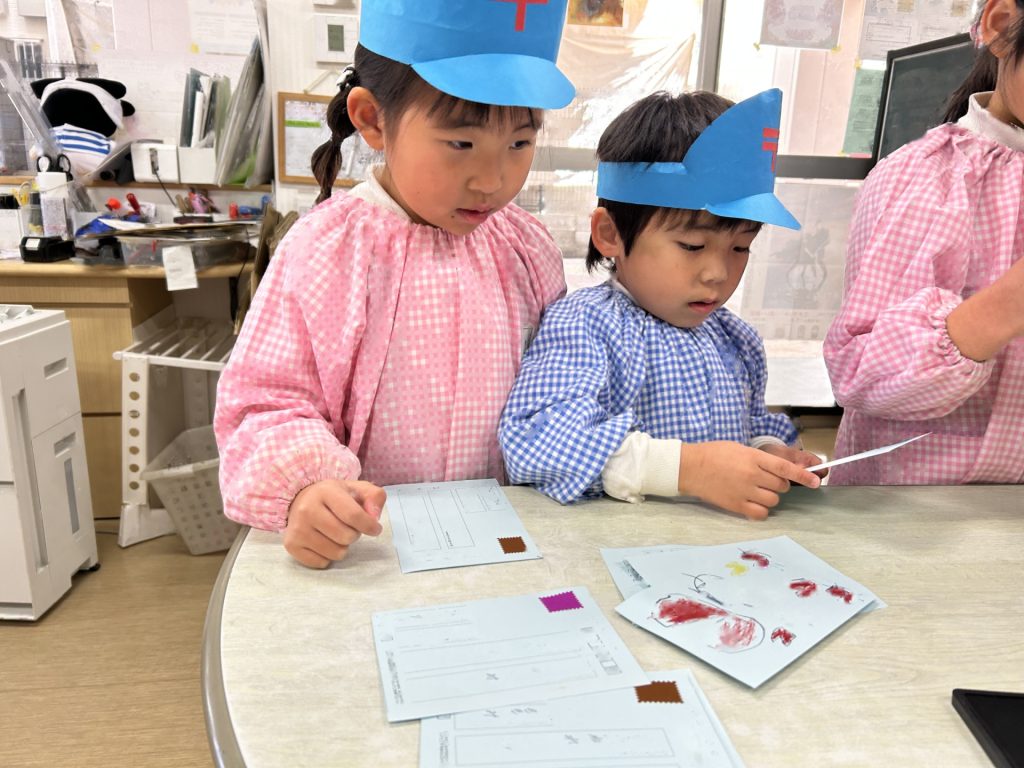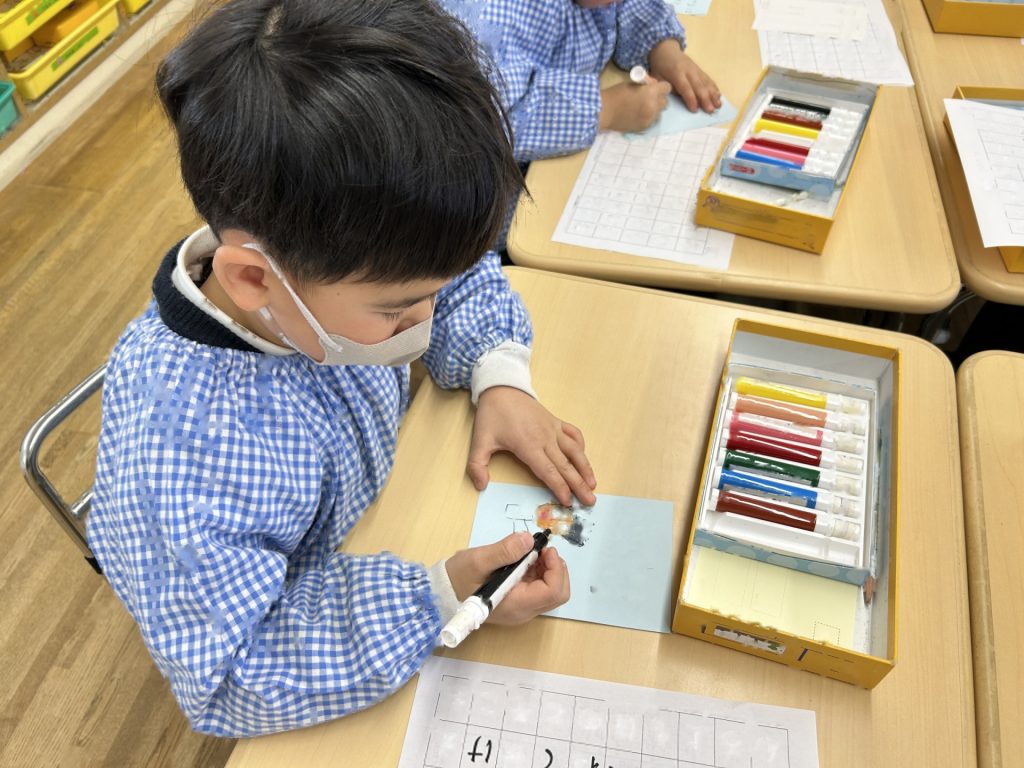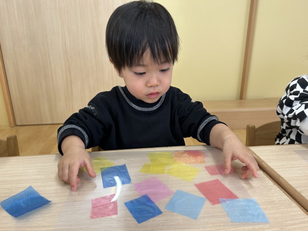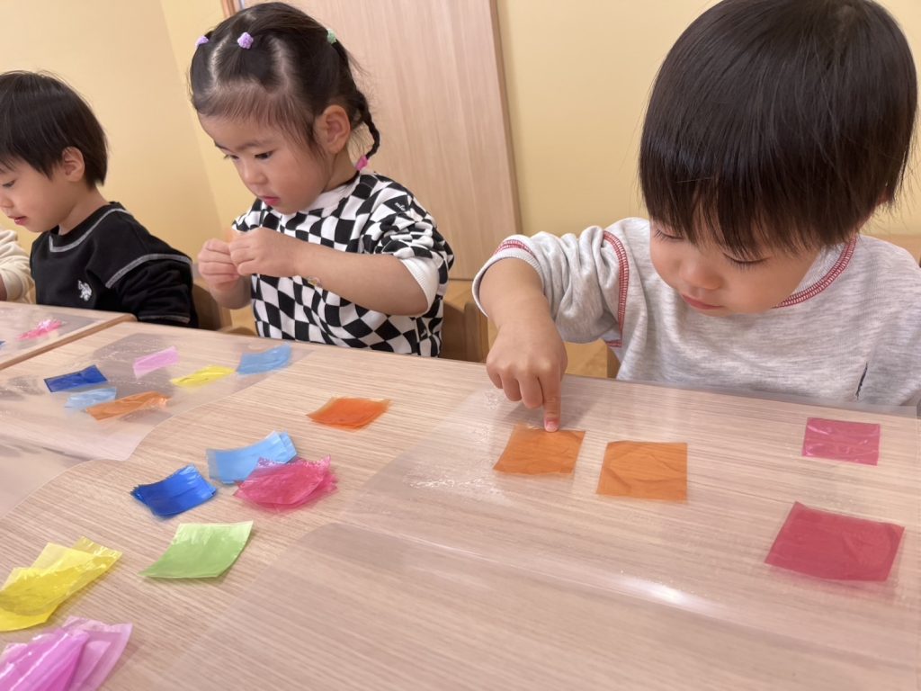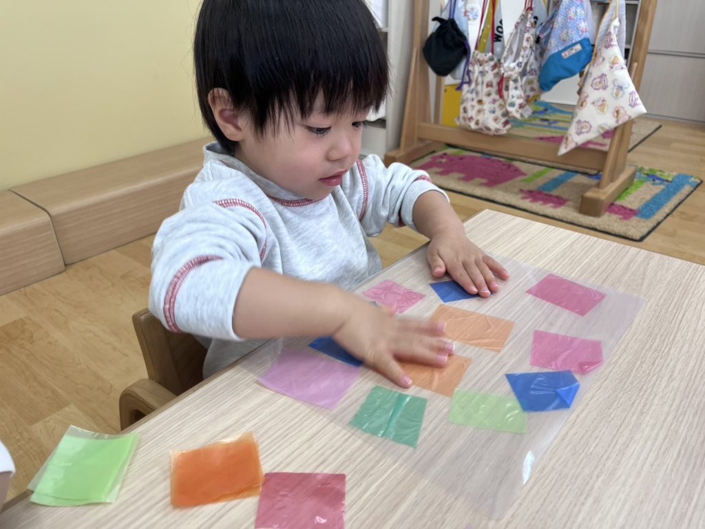 クリアファイルを広げ、保育者がのりを塗り、そこに子どもが小さく切っているスズランテープをのせていきました。色の名前を言いながらみんな集中して取り組んでいました。