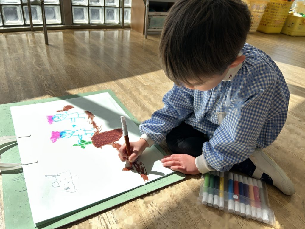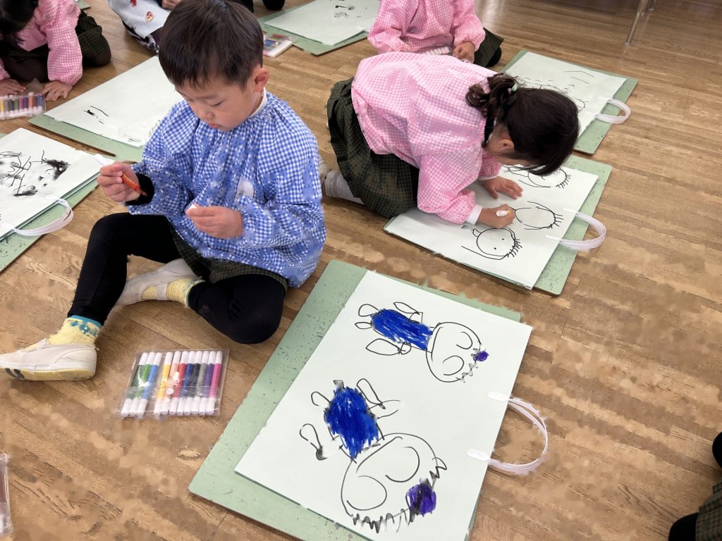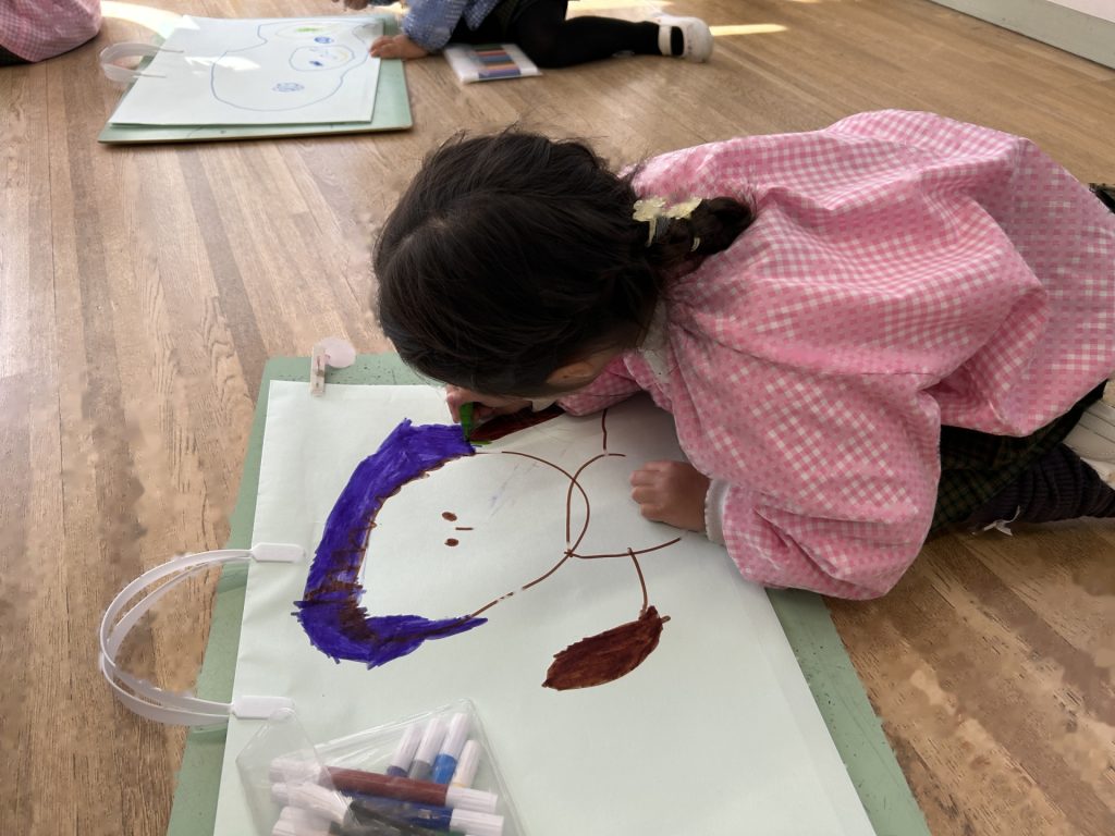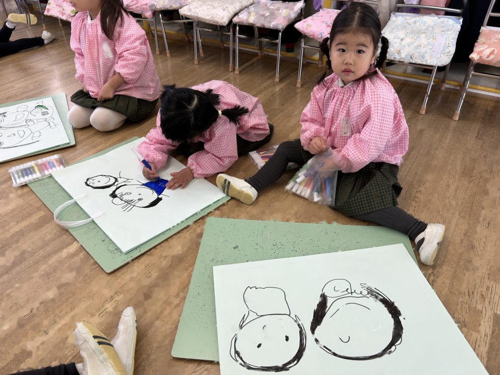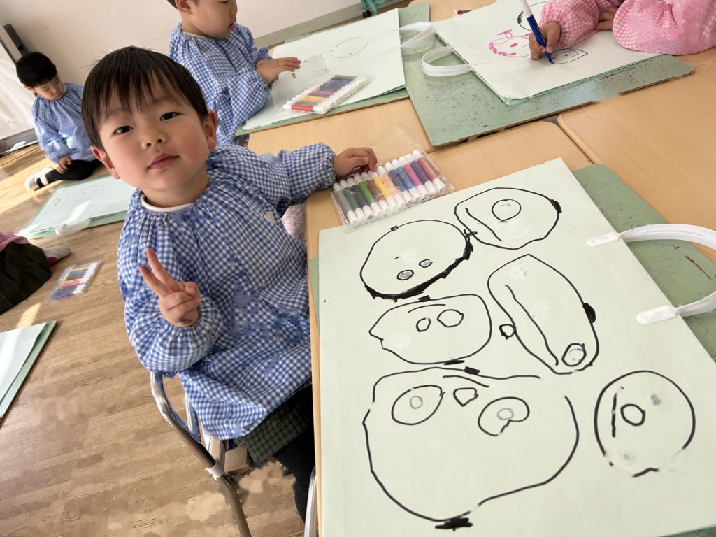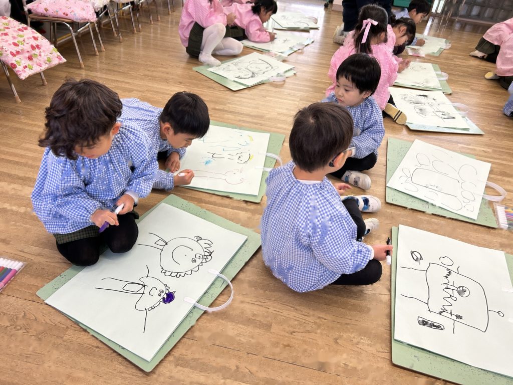 絵画袋に幼稚園の思い出の絵を描きました。おともだちの絵を描いたり、プールやおいもほり、豆まきなどの行事の絵を描いているおともだちもいました。3歳児らしいかわいい絵がたくさんありました😊