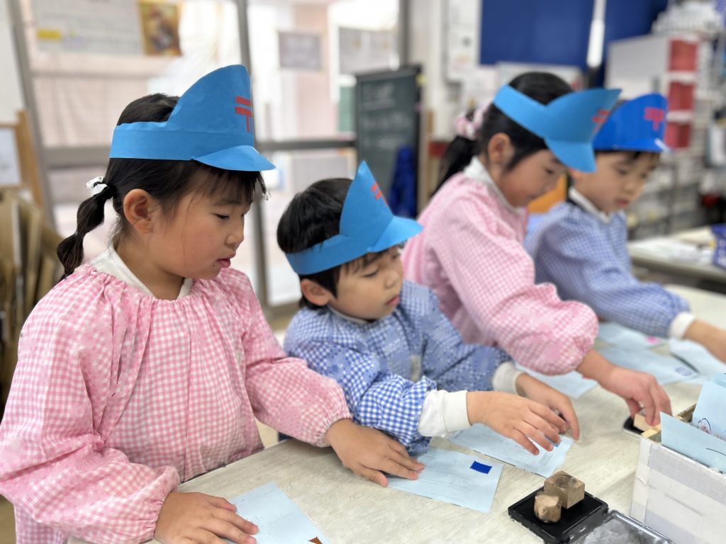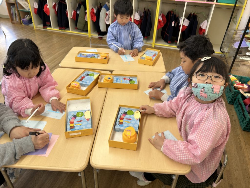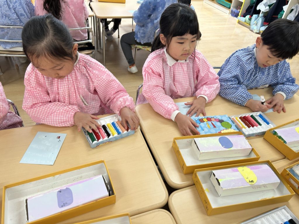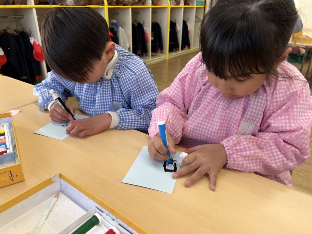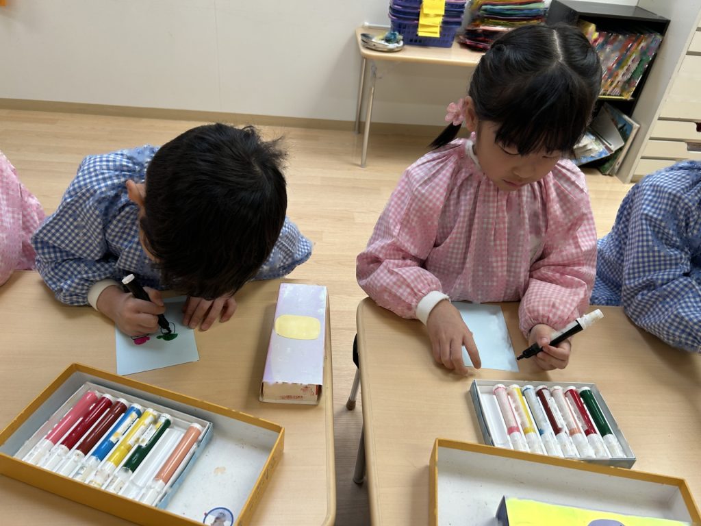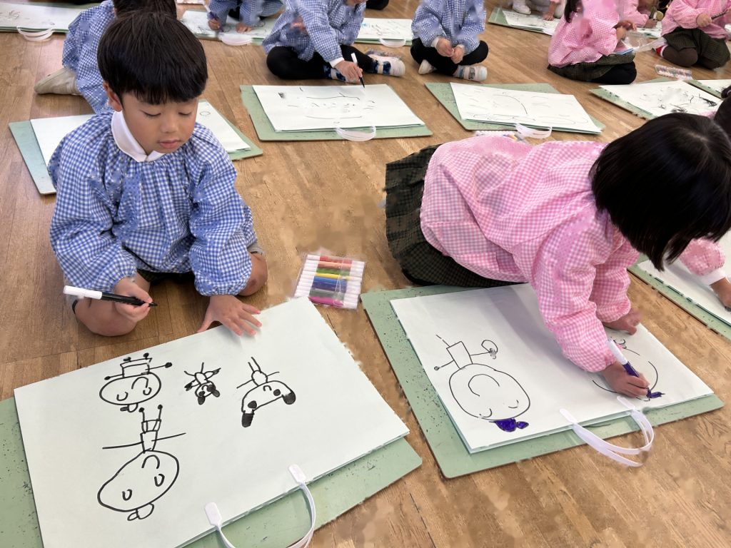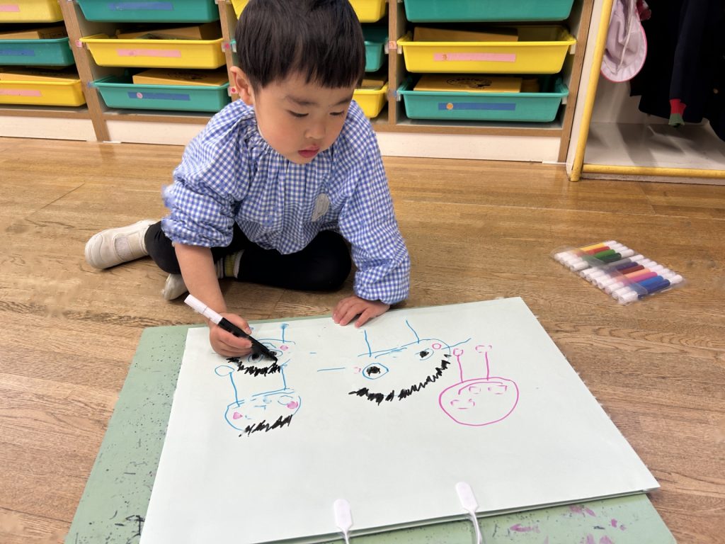 絵画袋に幼稚園の思い出の絵を描きました。おともだちの絵を描いたり、プールやおいもほり、豆まきなどの行事の絵を描いているおともだちもいました。3歳児らしいかわいい絵がたくさんありました😊