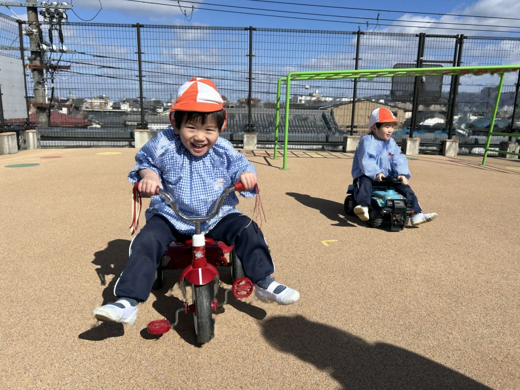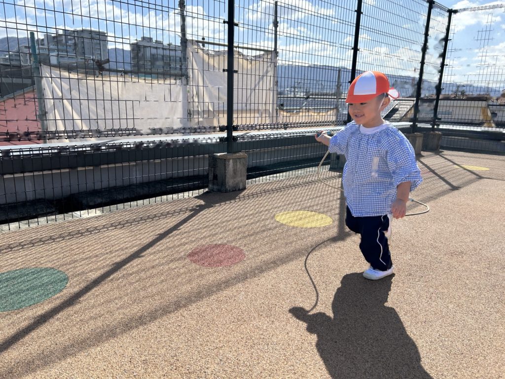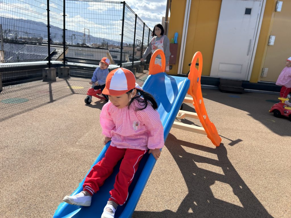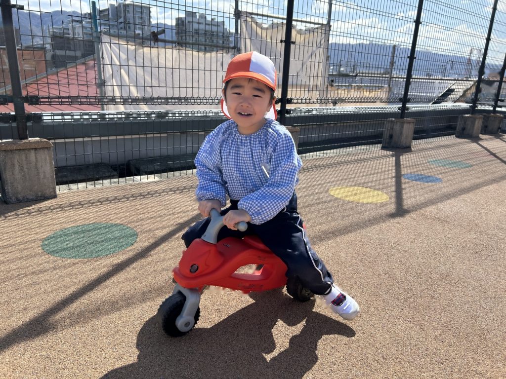 前はできなかったポックリに乗っていたり、乗り物をゆずってあげたり、少し成長した姿も見られました。久しぶりの屋上遊びとっても楽しんでいましたよ。