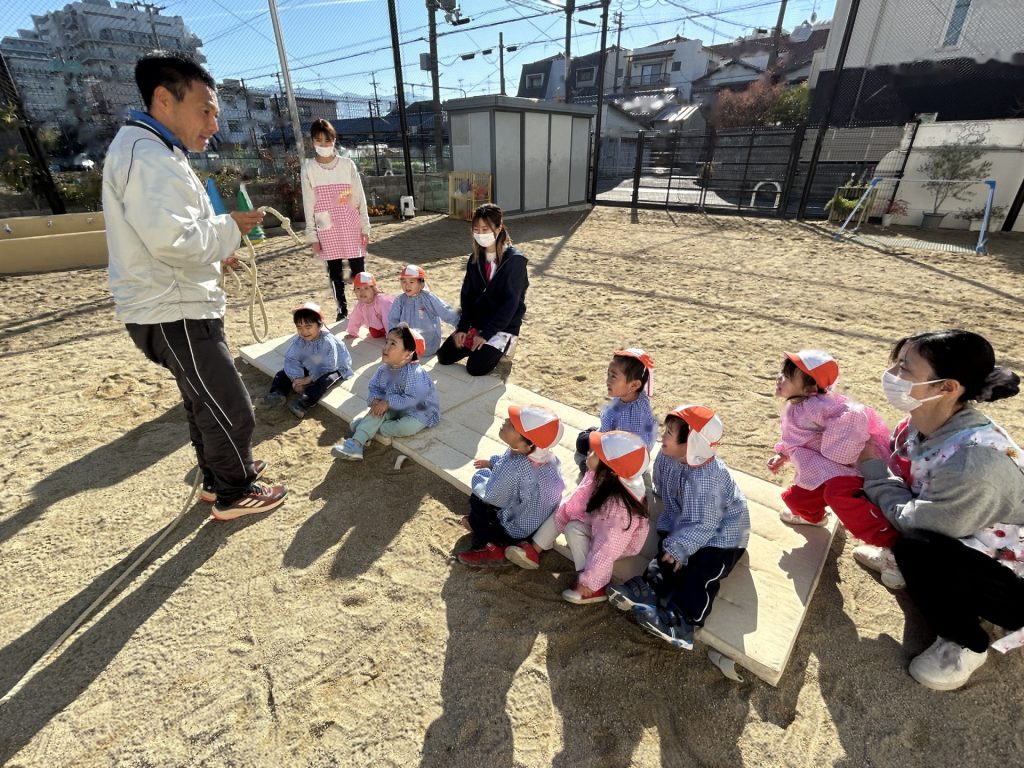 4歳児は前跳びの練習をしました。縄跳びの指導は2回目です。前回に続きいくつかポイントも教えてもらいましたよ。