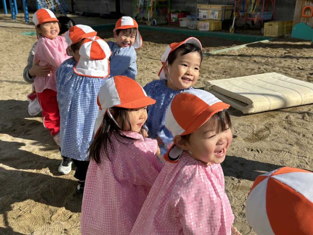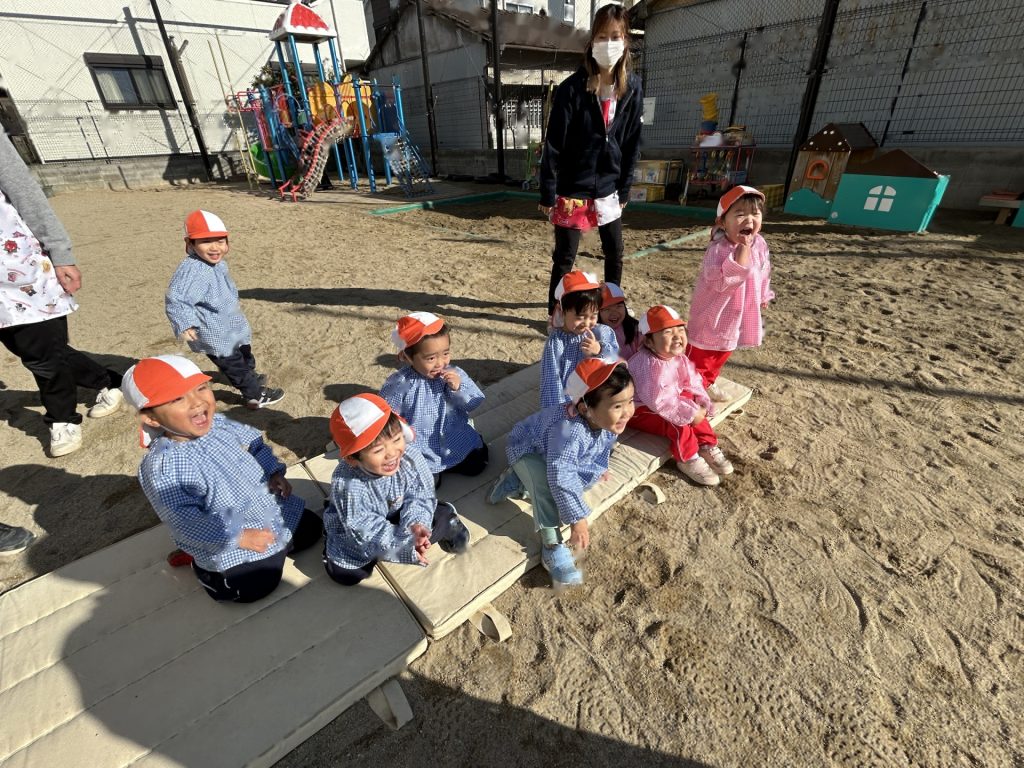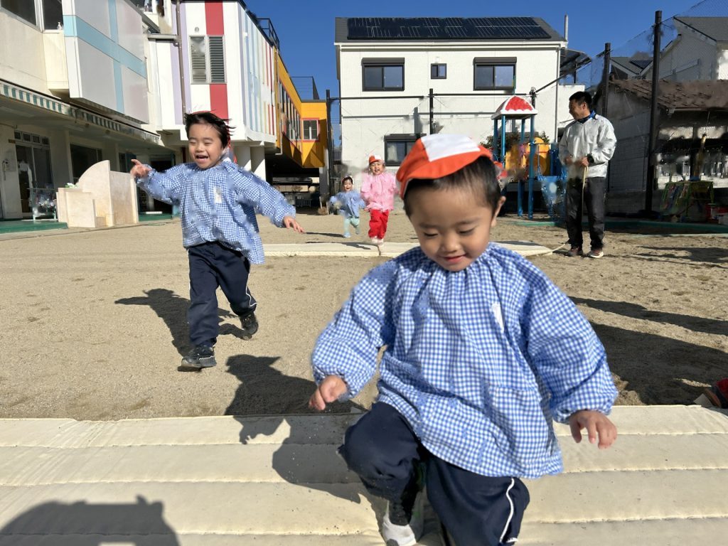 マットのおうちに逃げるのに子どもたちはたのしくなっちゃって園庭をにげまわっていました😁